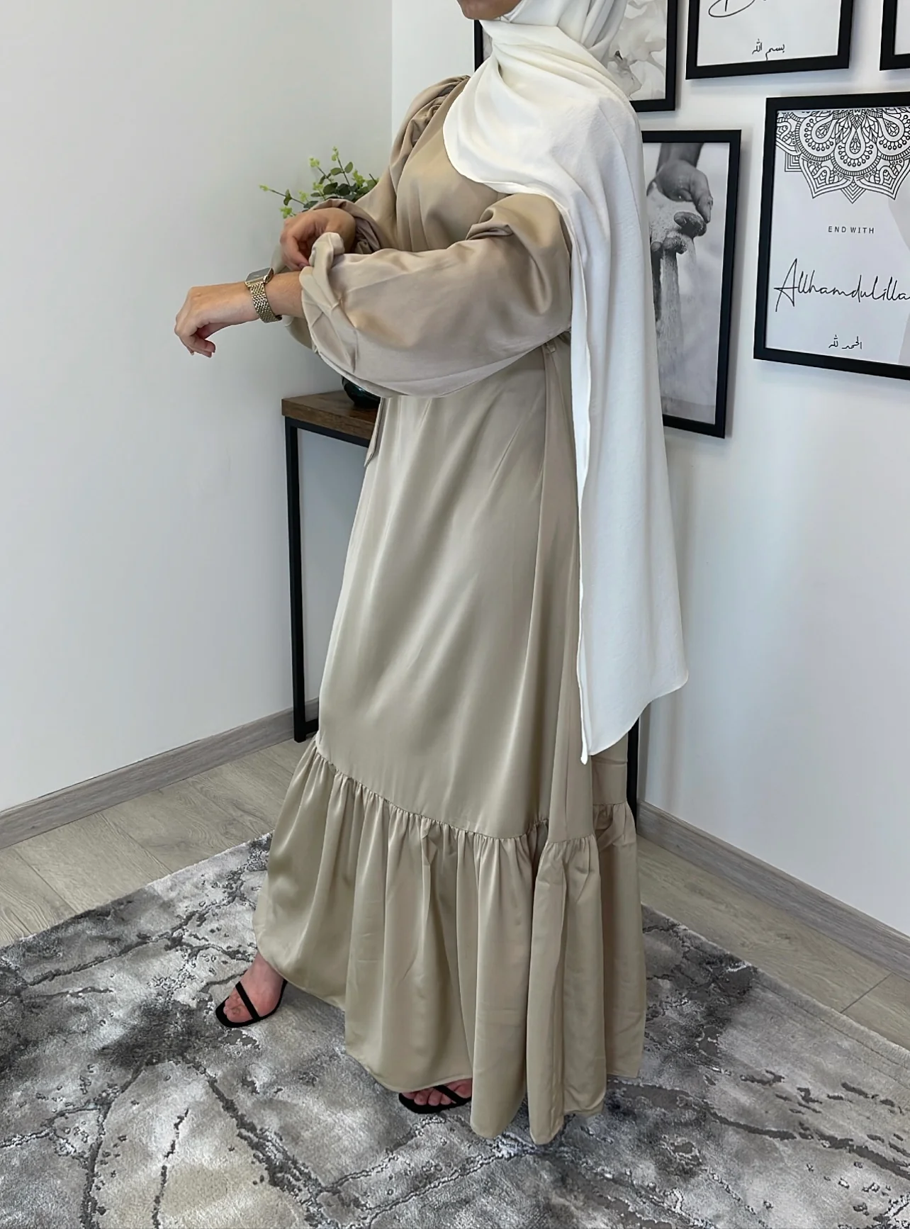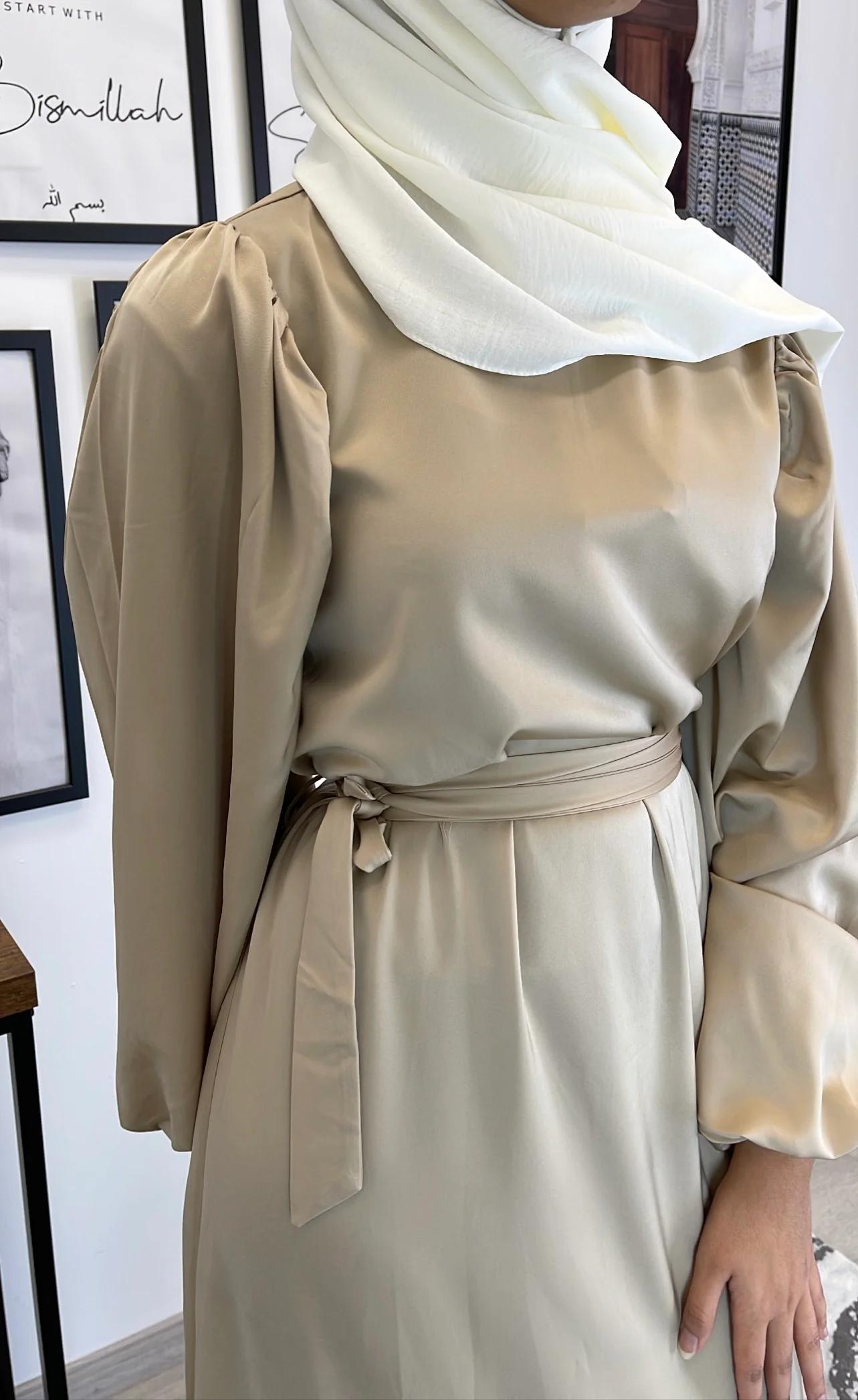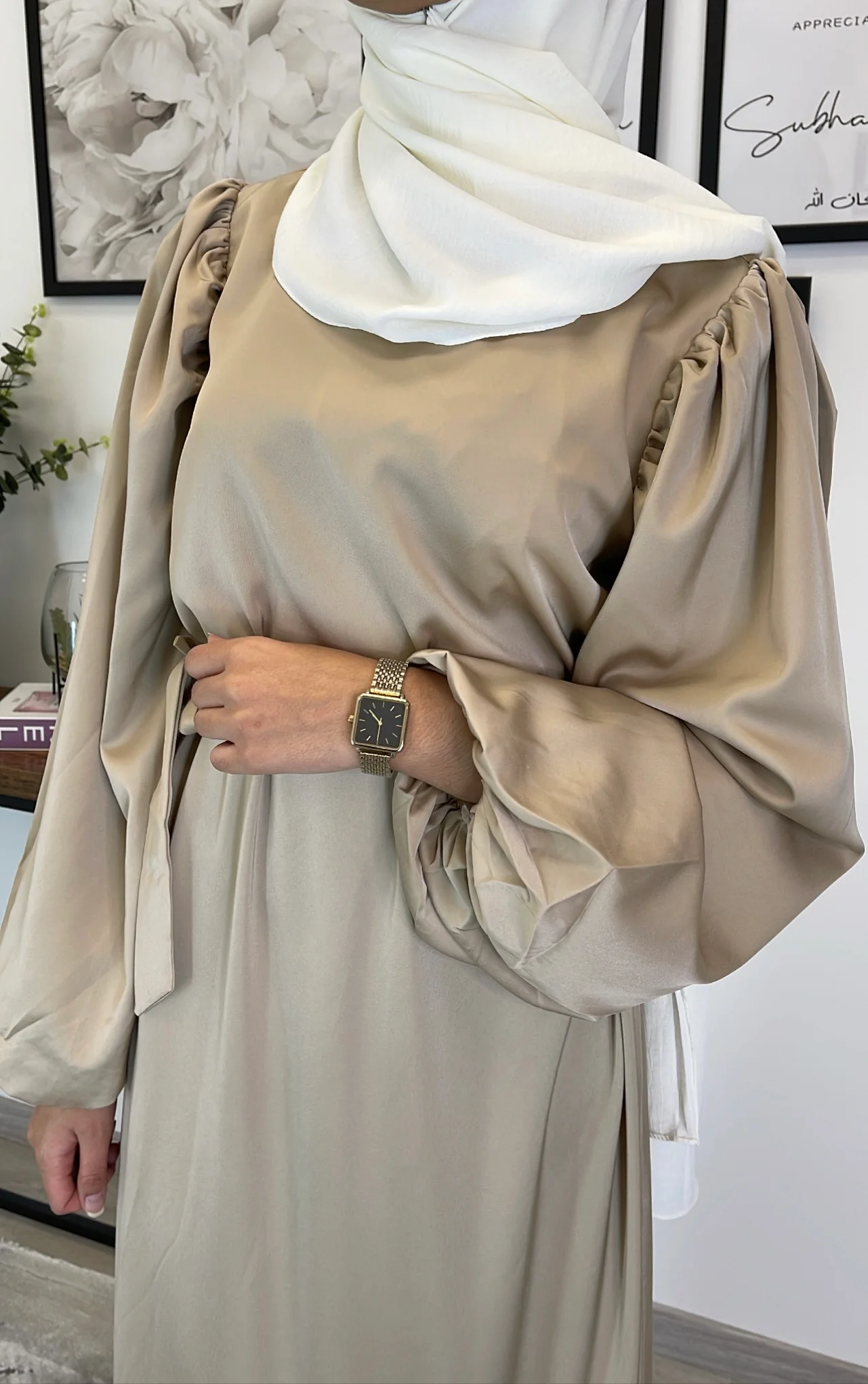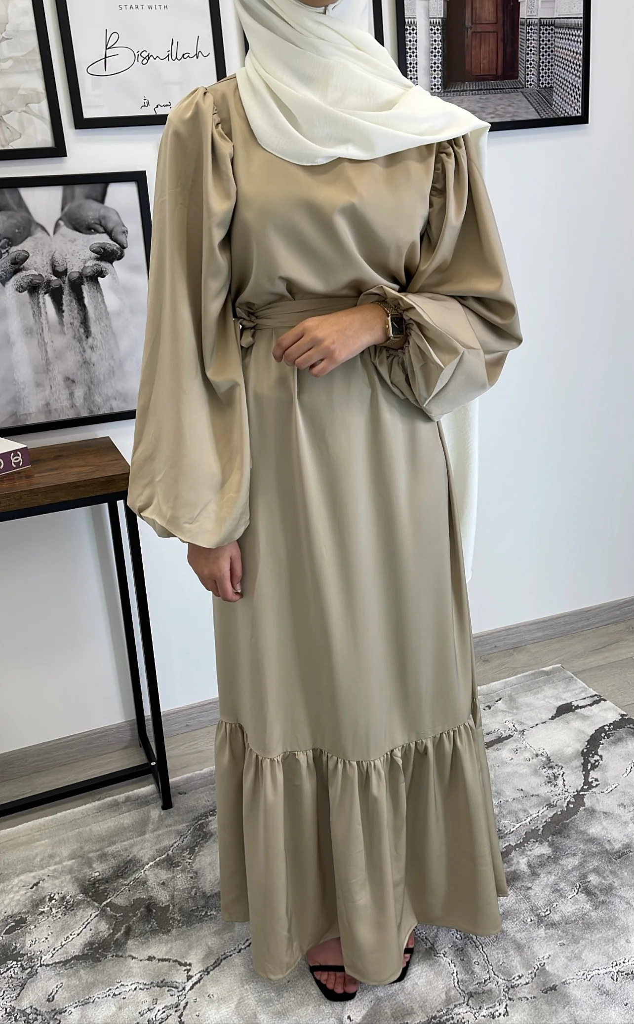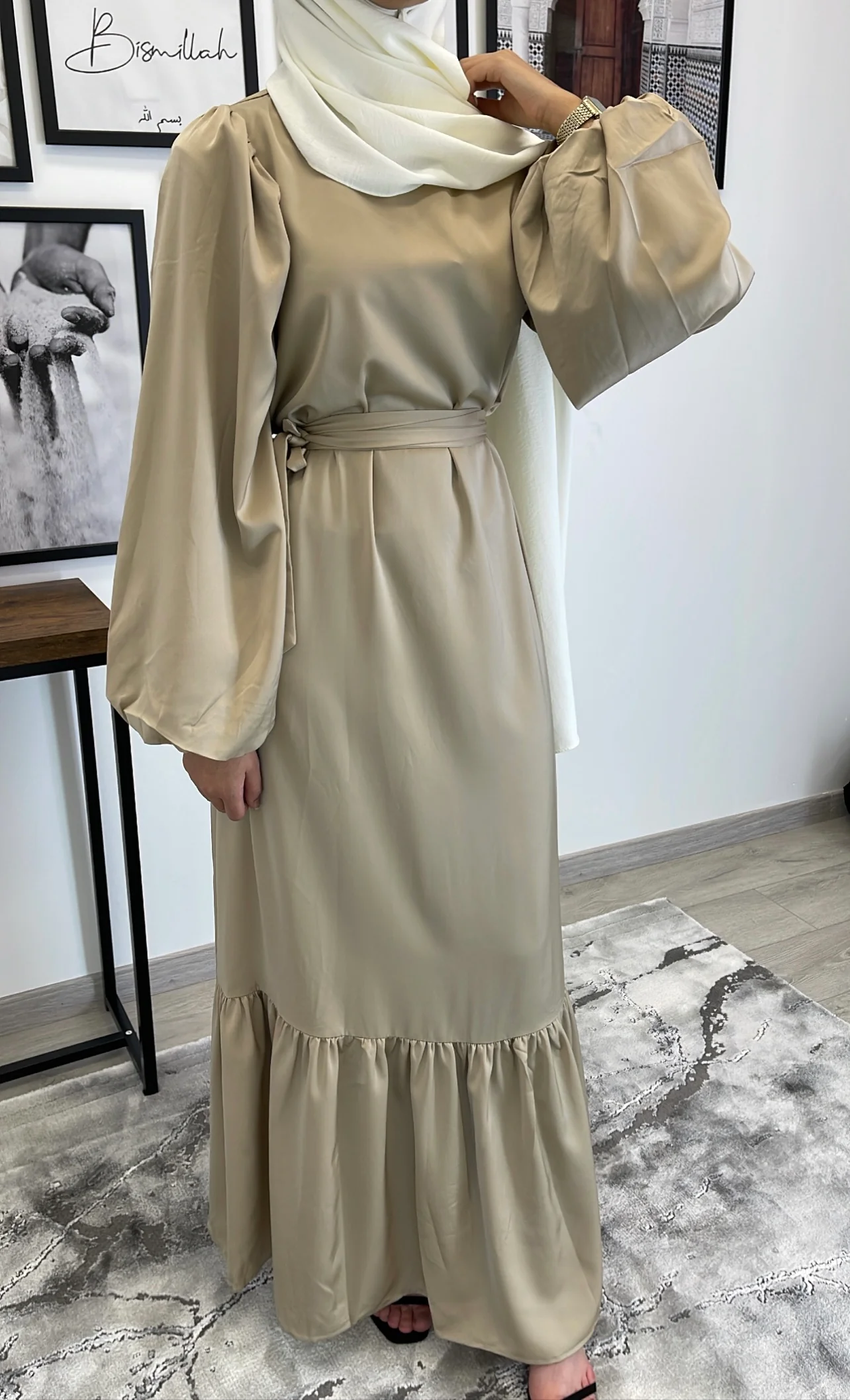 Robe satiné chic et élégante . Manches ballons , volants au niveau du bas Ceinture amovible incluse Ouverture par zip au niveau du dos. Longueur de la robe : 150cm S/M: 36-38 M/L: 40-42 L/XL: 44-46 Le mannequin mesure 1m70 et porte la taille S/M