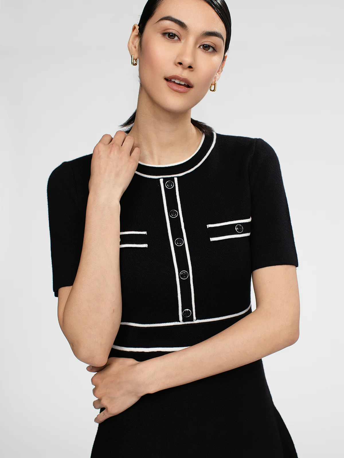 Robe courte confectionnée en maille extensible avec encolure ronde et manches ajustées.Des lignes contrastantes soulignent la taille et les poches poitrine.