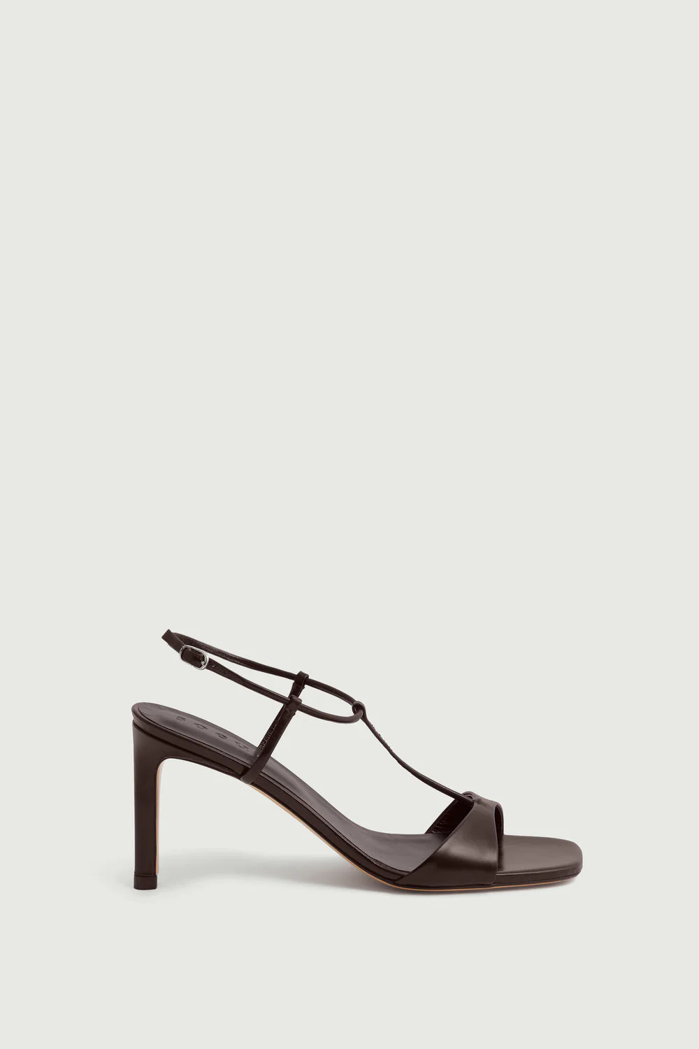 – Sandales à talon en cuir lisse marron – Hauteur de talon 8cm – Ouverture par bride ajustable à la cheville – Métallerie argentée – Cuir LWG (Leather Working Group)