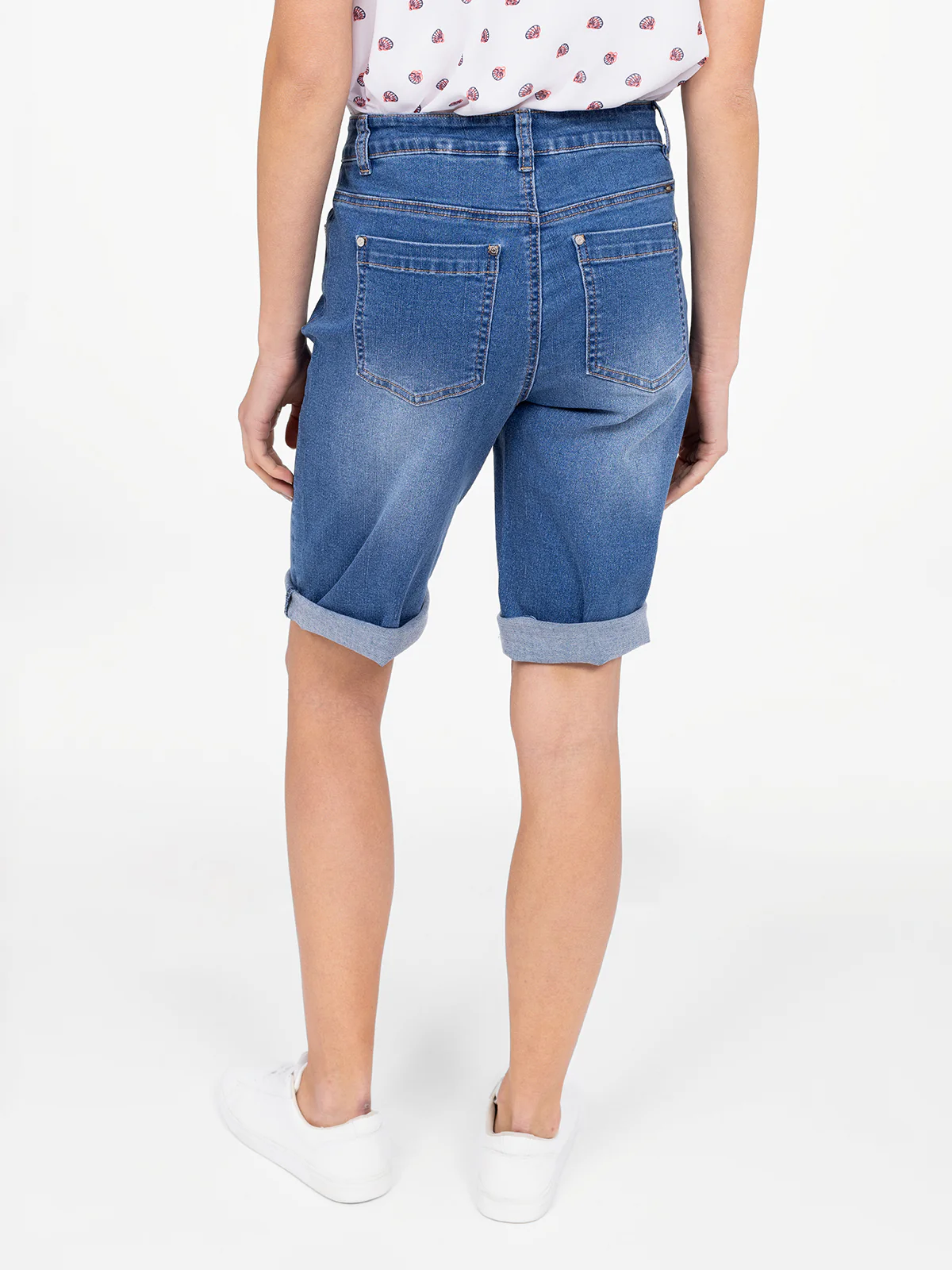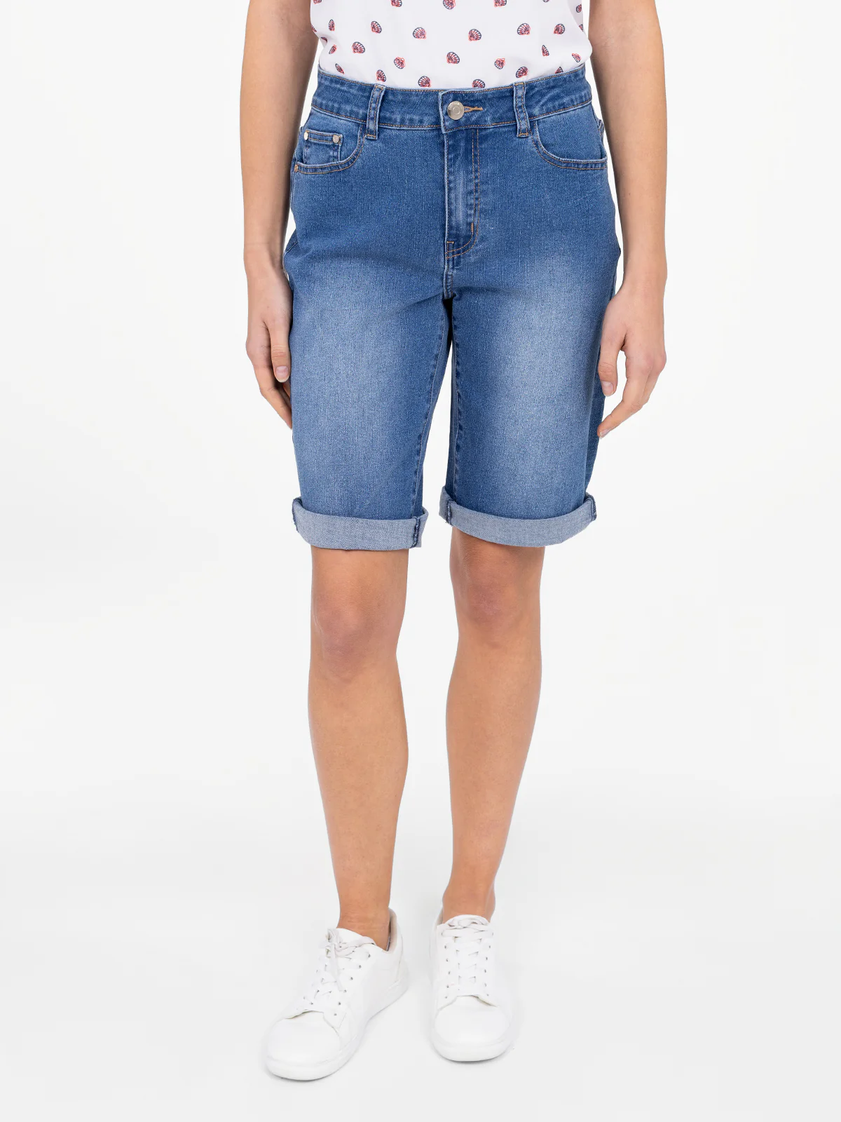 Ce short en denim longueur genou est rehaussé d’un ourlet roulé et d’une taille boutonnée. Sa coupe ajustée flatte la silhouette tout en assurant une liberté de mouvement.