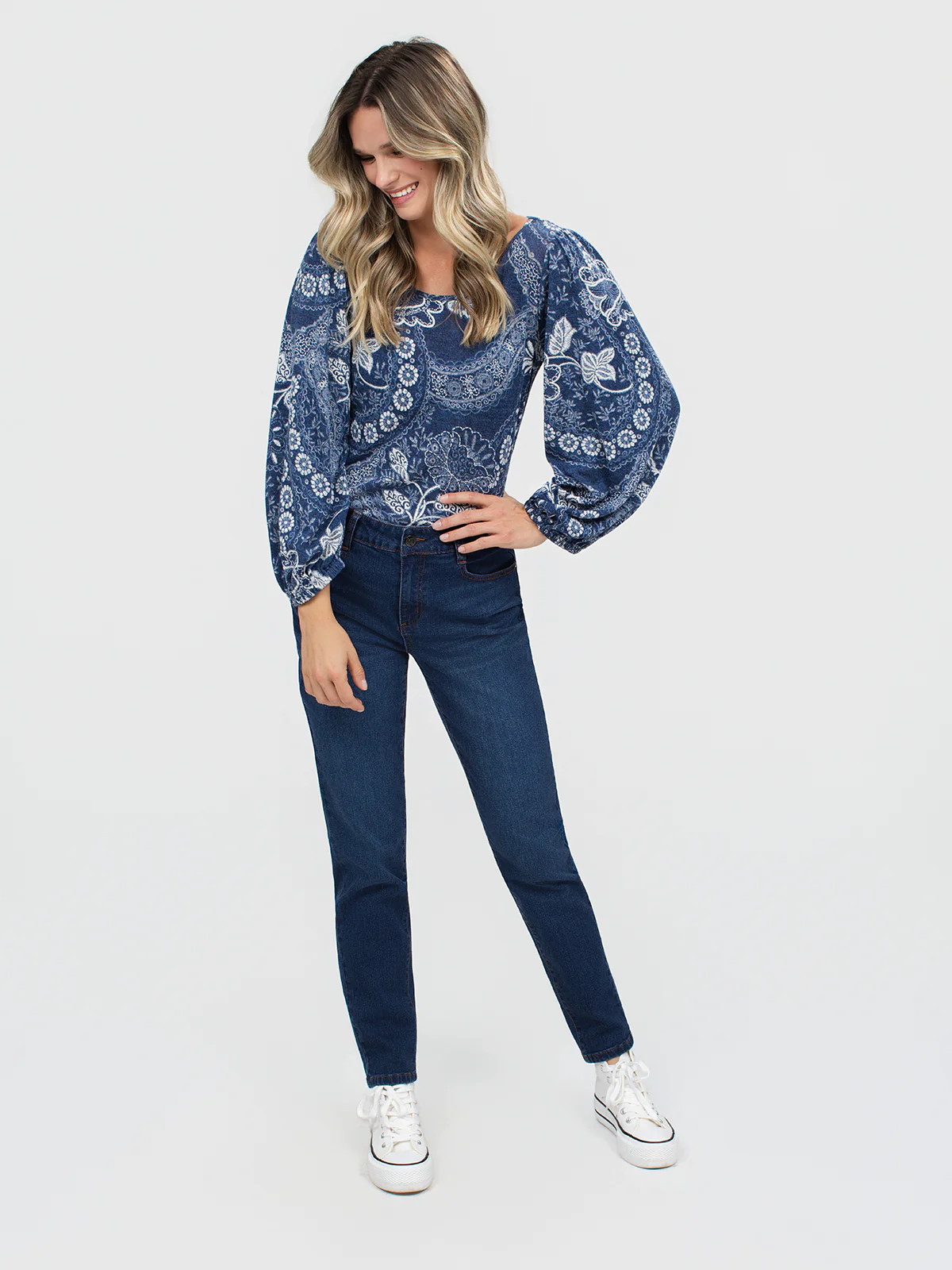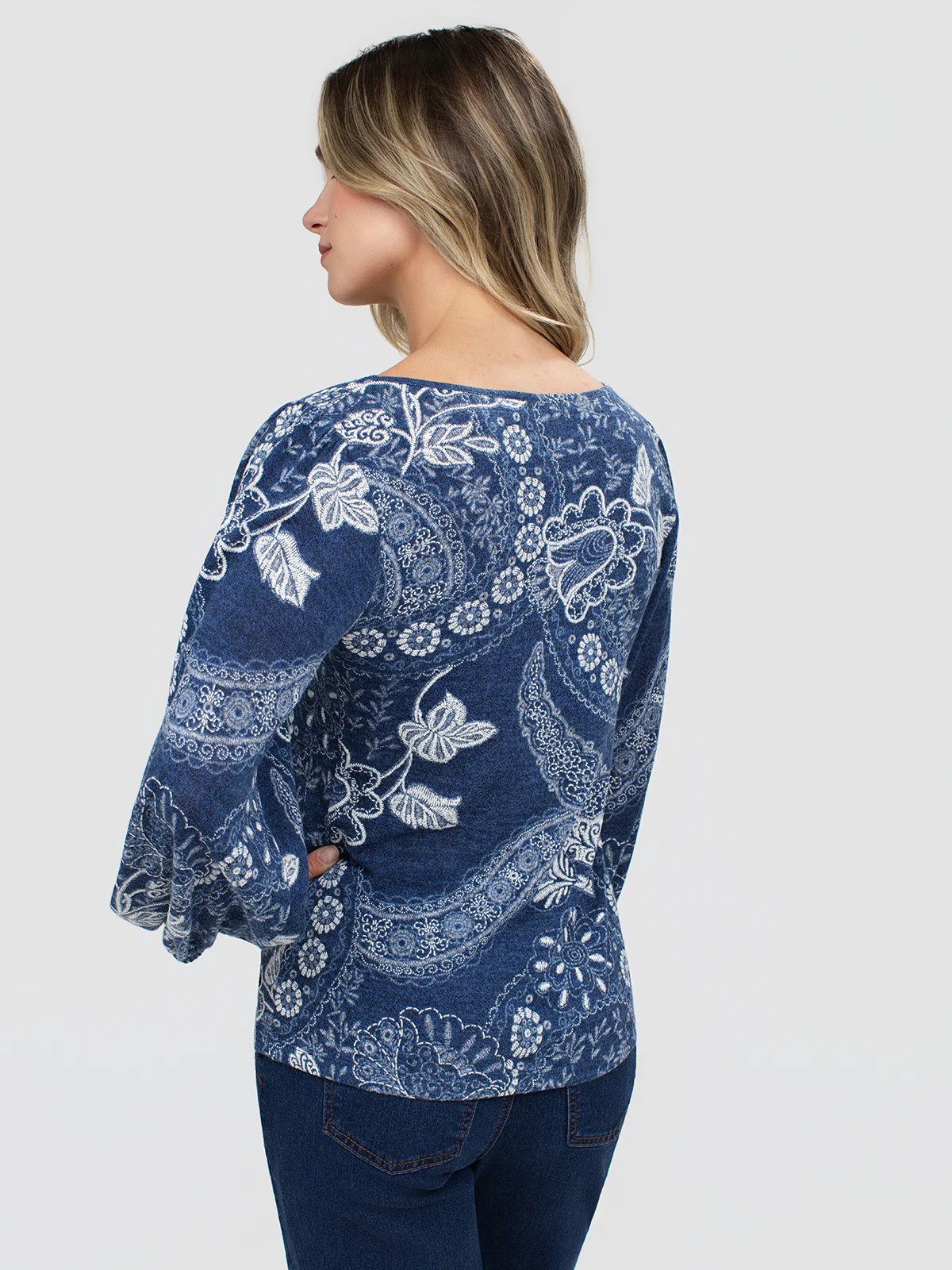 Haut à encolure ronde avec coupe droite et manches 3/4 bouffantes resserrées aux poignets. L’ensemble est décoré d’un imprimé floral.