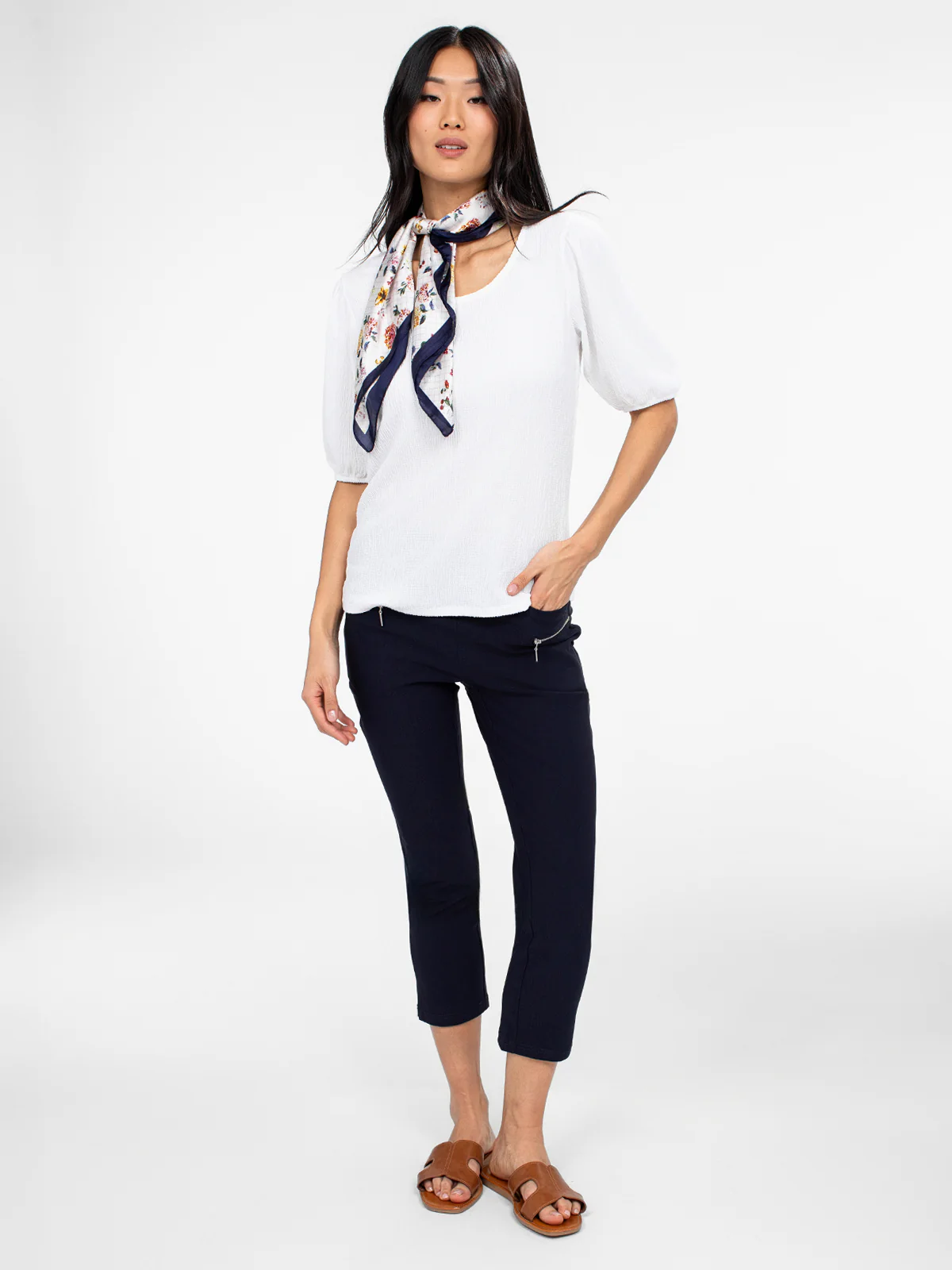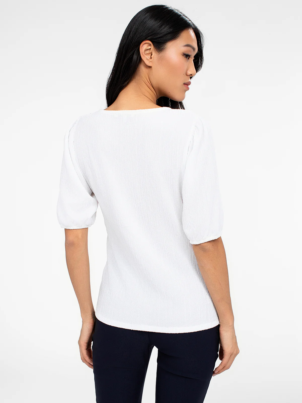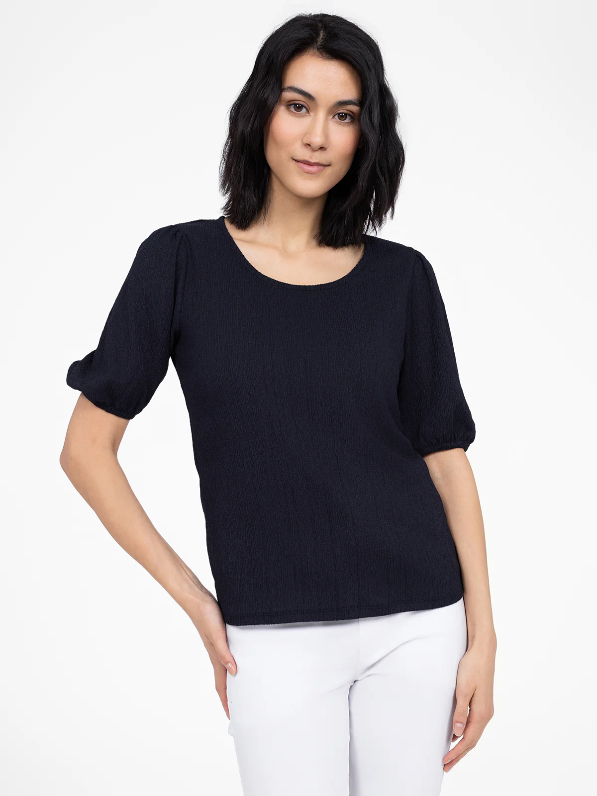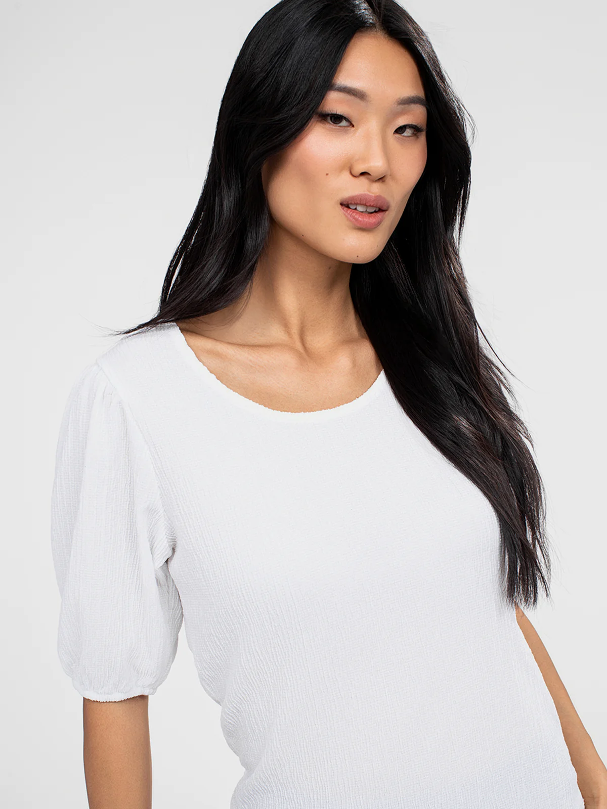 Ce haut en tissu texturé se distingue par ses manches bouffantes qui ajoutent une touche volumineuse et féminine. Son encolure ronde apporte une simplicité élégante, parfaite pour toutes vos tenues.