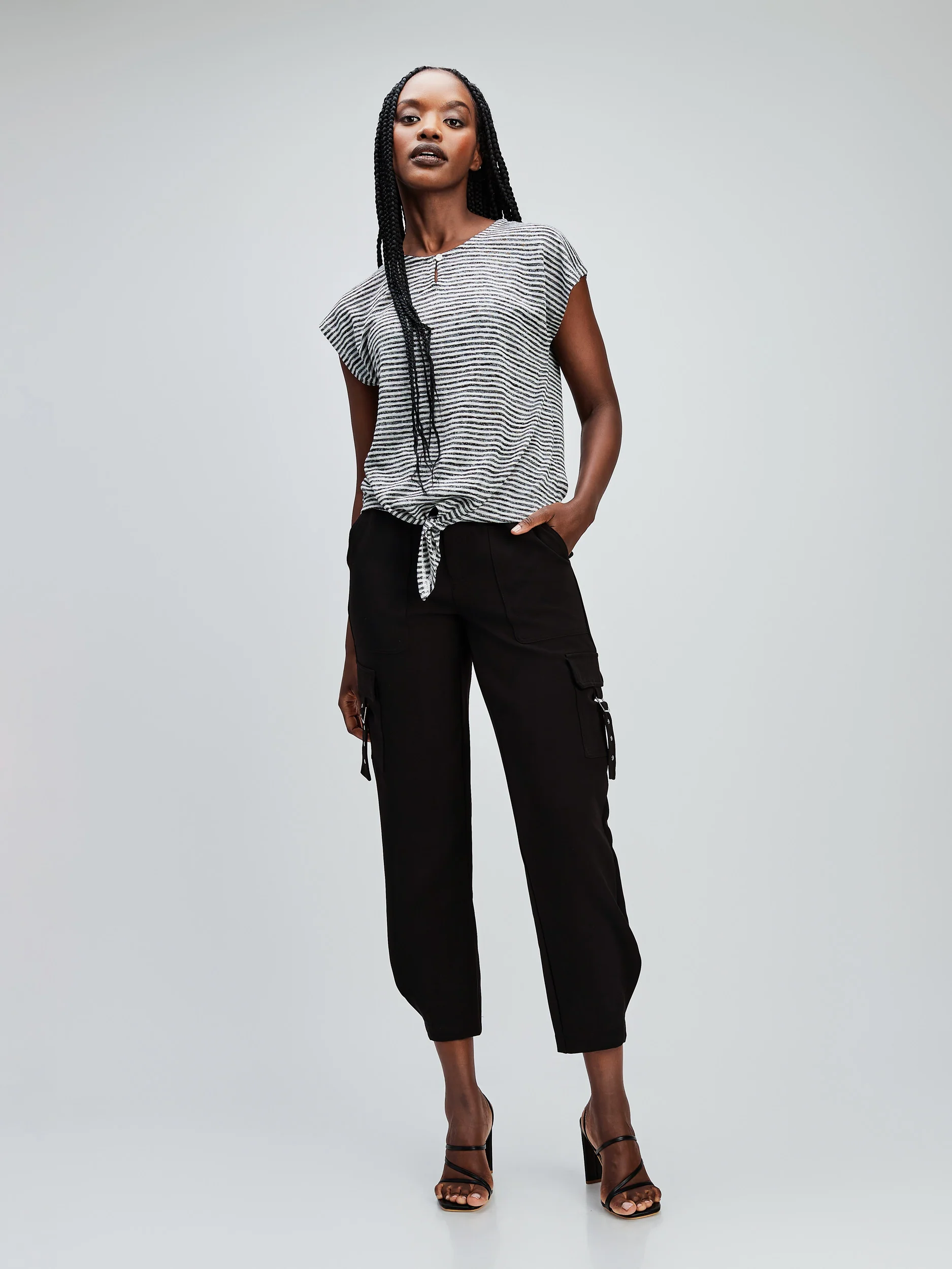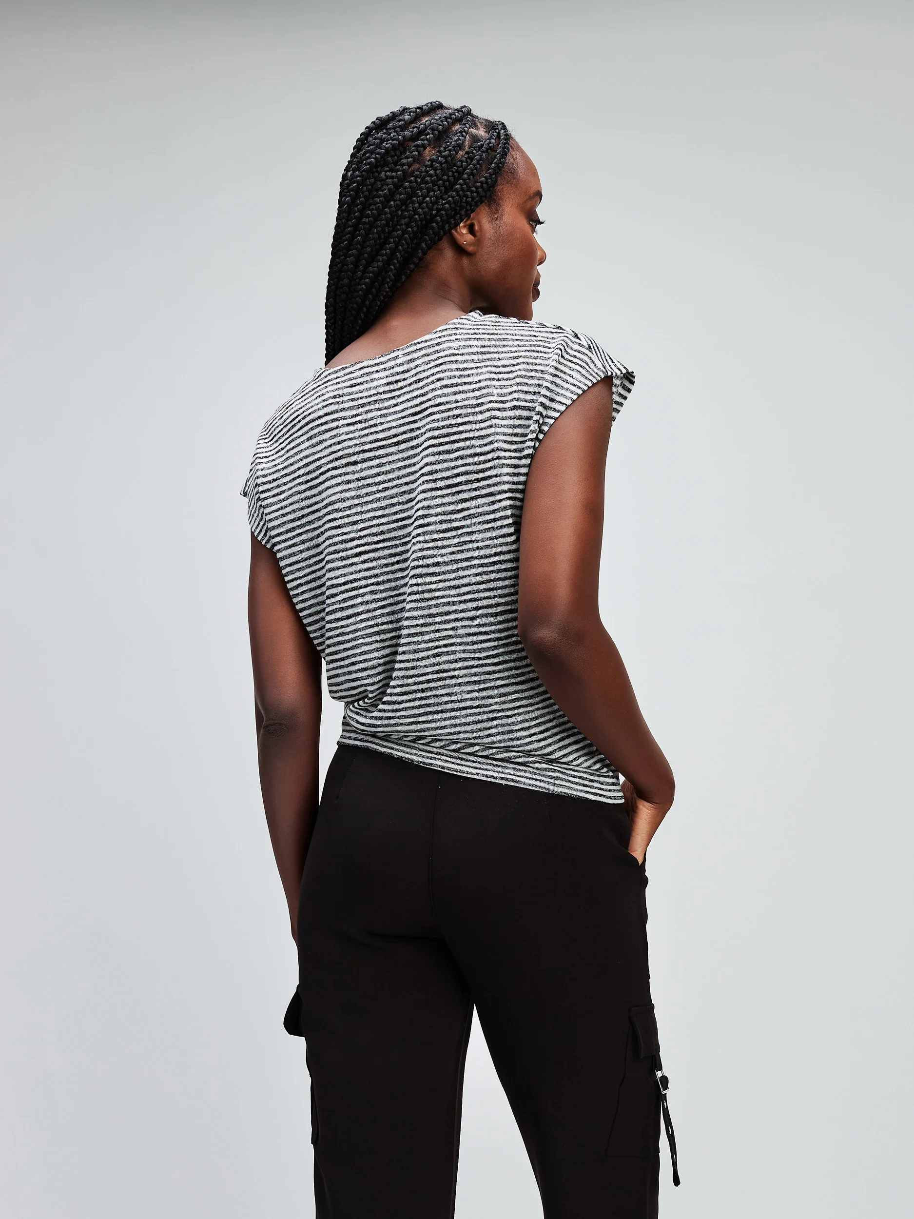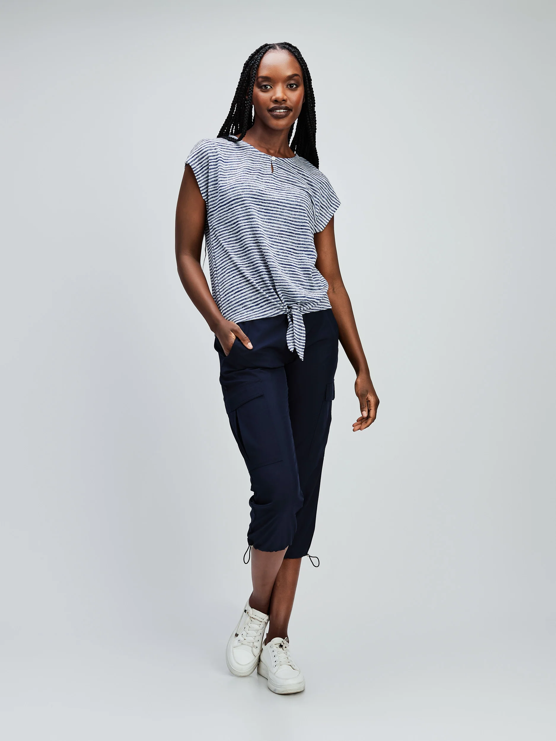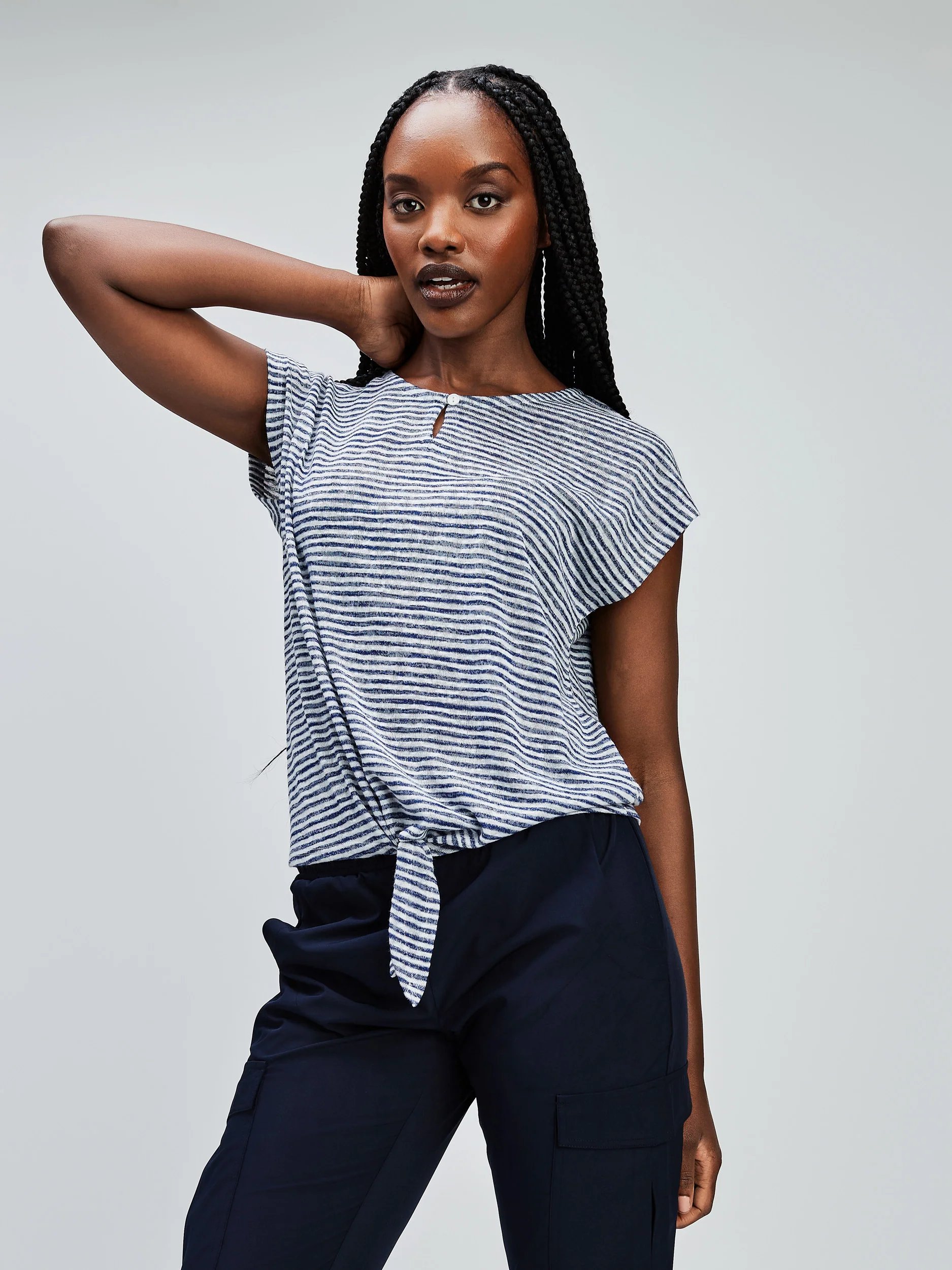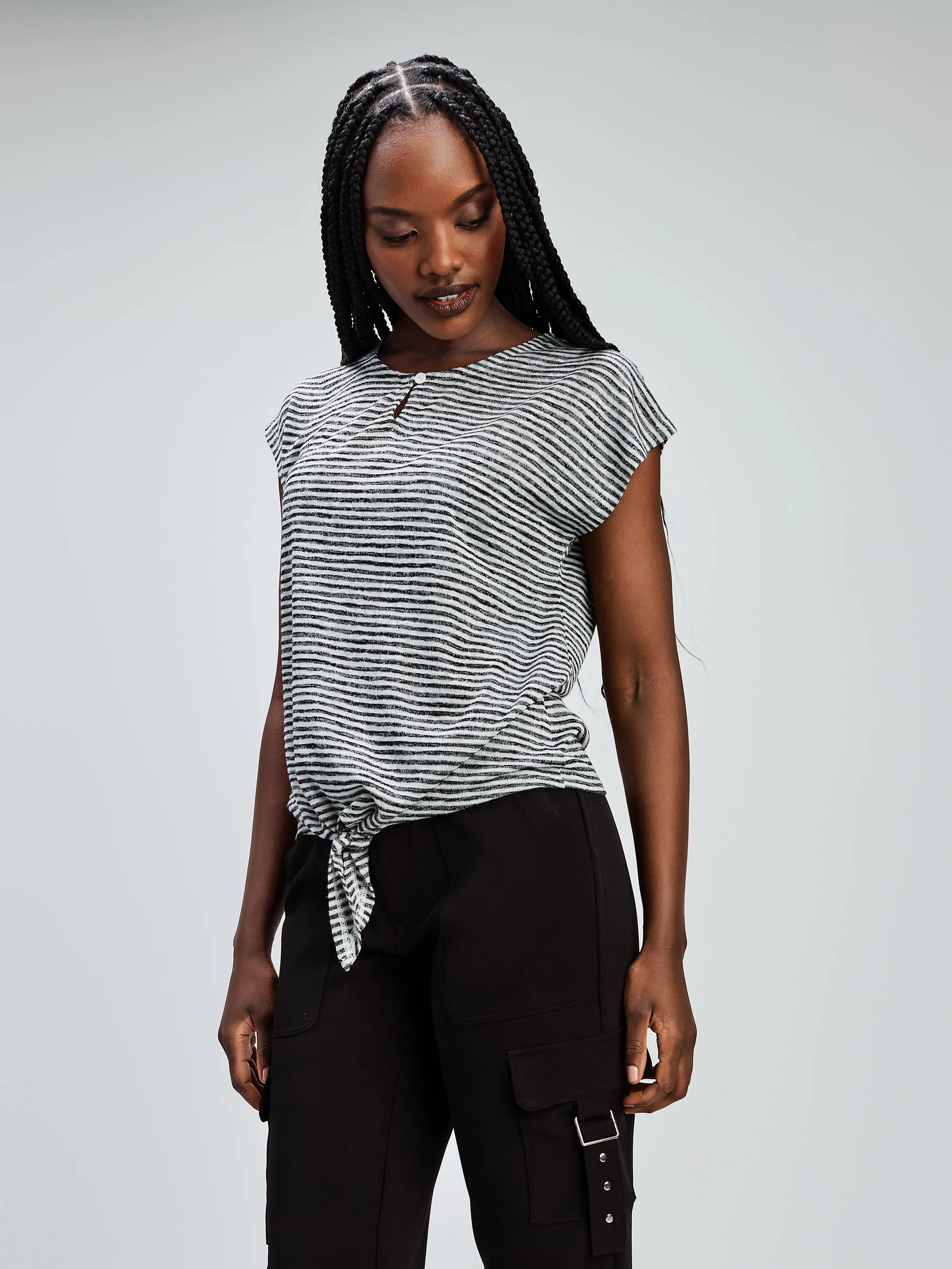 Le T-shirt de base idéale, semi-ajustée à manches courtes, présente de fines rayures horizontales, tandis que l’ourlet à nouer lui donne une finition décontractée.