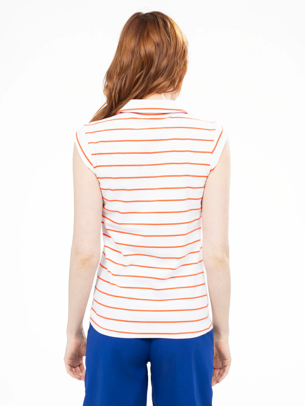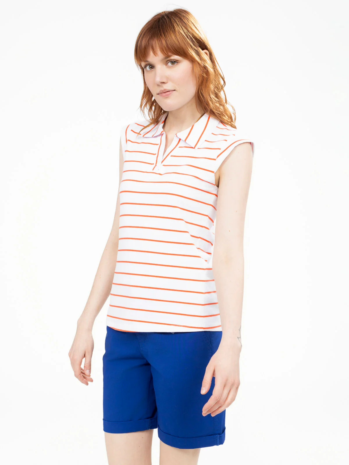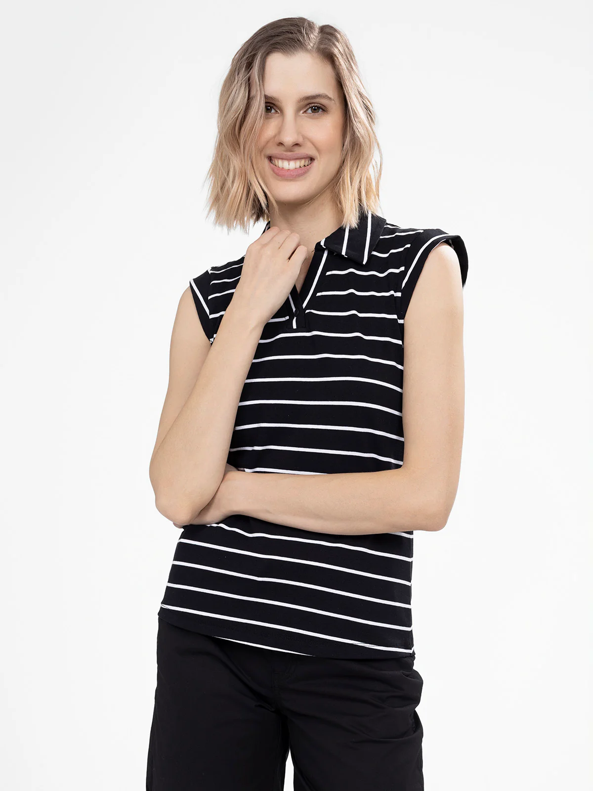 Haut semi-ajusté à rayures horizontales, encolure en V avec col chemise et manches courtes à revers structuré. Le tricot souple offre une base droite légèrement arrondie au dos.