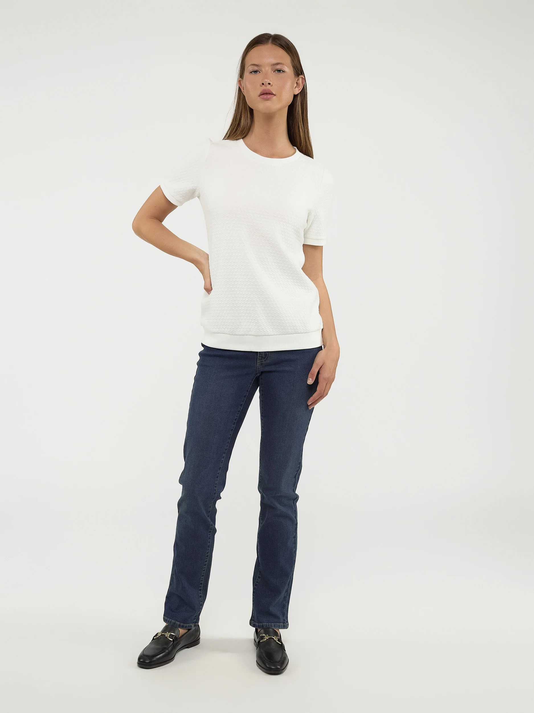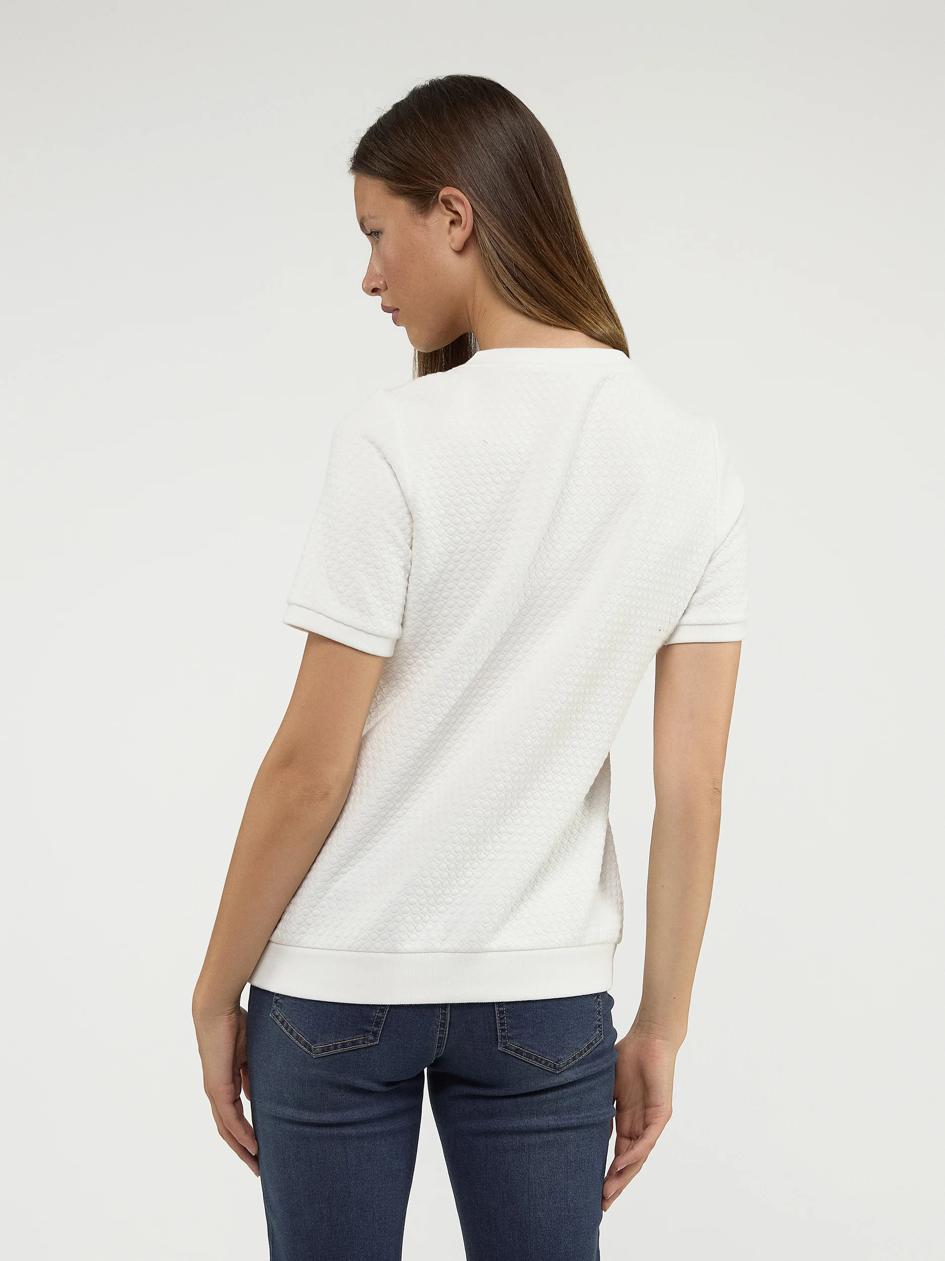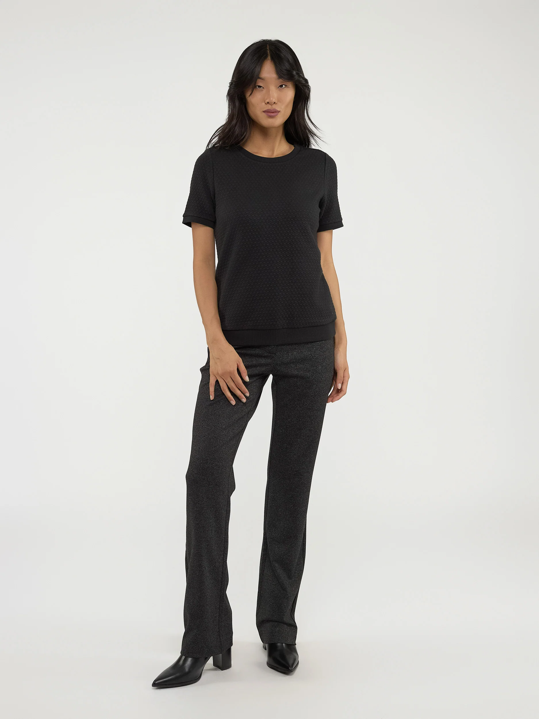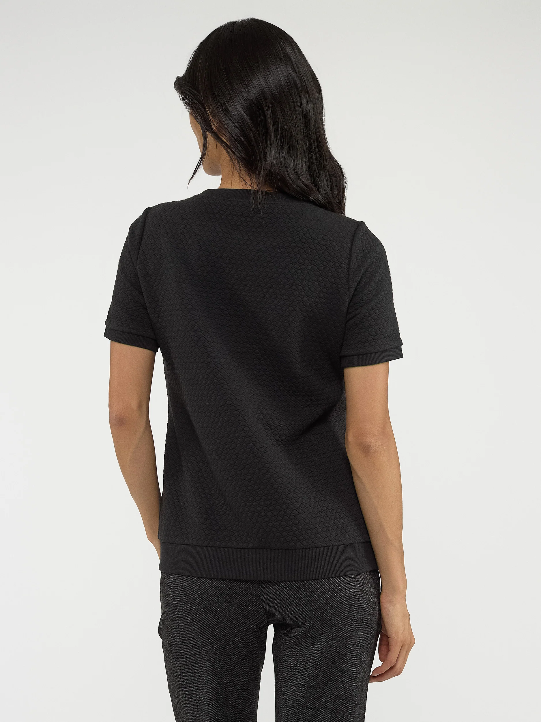 Ce t-shirt basique à manches courtes semi-ajusté présente un tissu texturé qui lui confère un intérêt hors du commun.