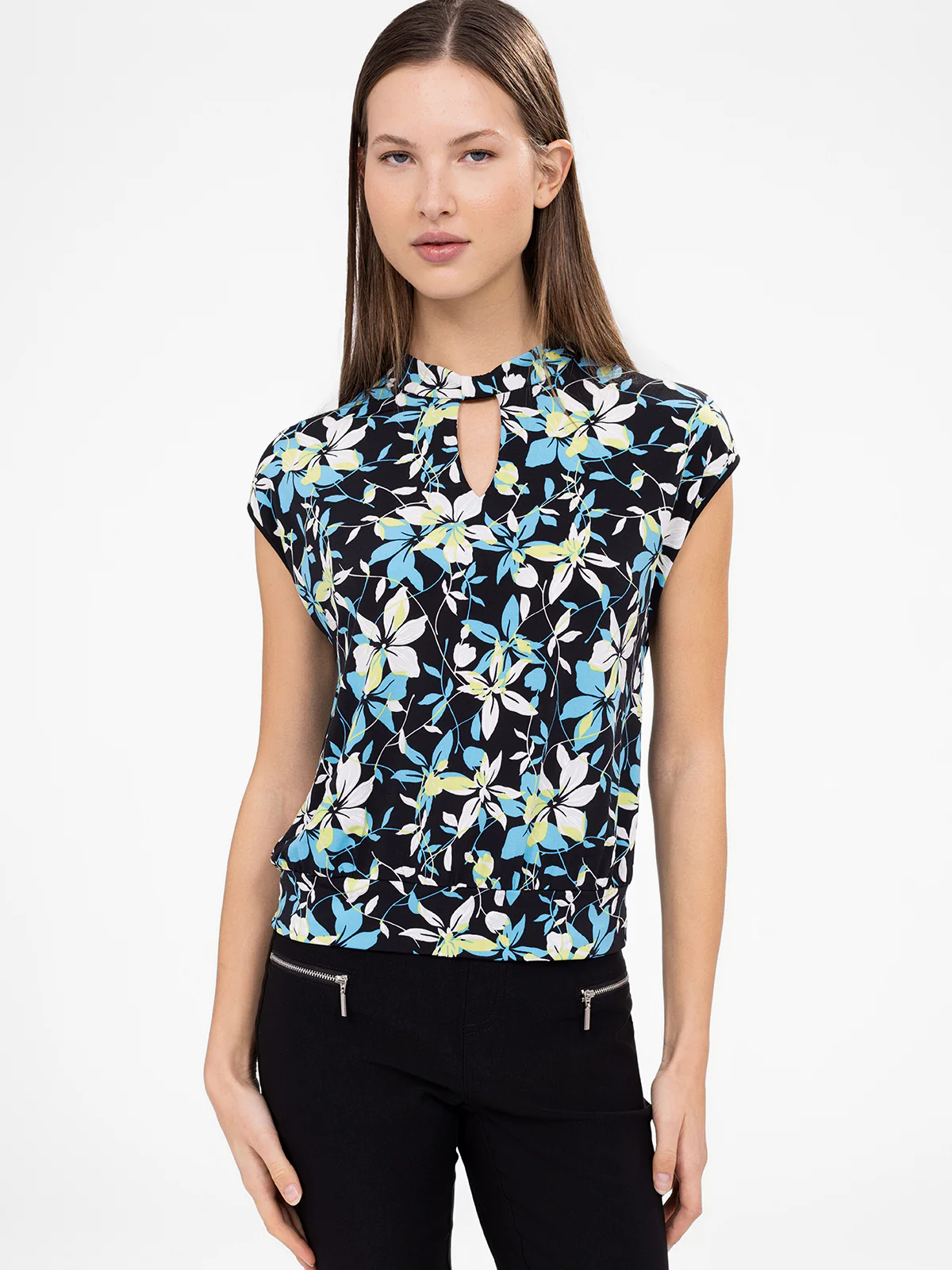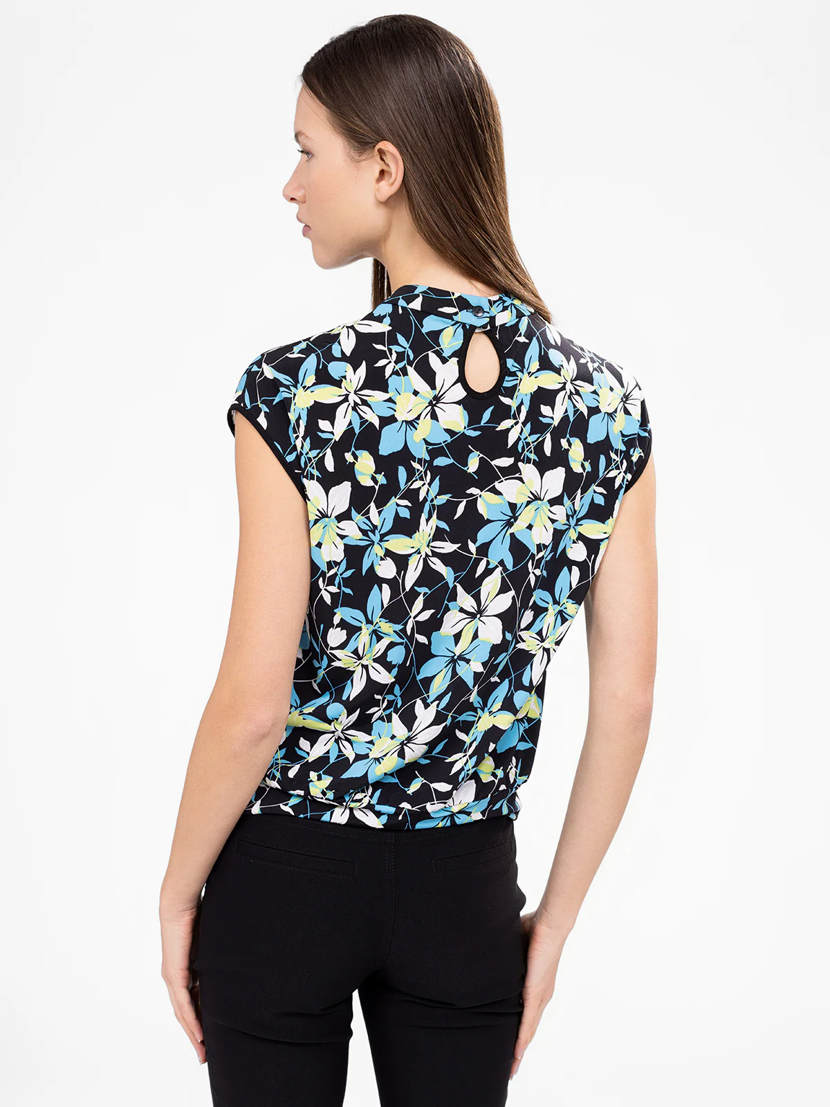 Un imprimé floral délicat habille ce haut au col subtil, agrémenté d’un joli détail goutte au dos. Sa coupe fluide et légèrement resserrée à la taille assure une tenue harmonieuse.