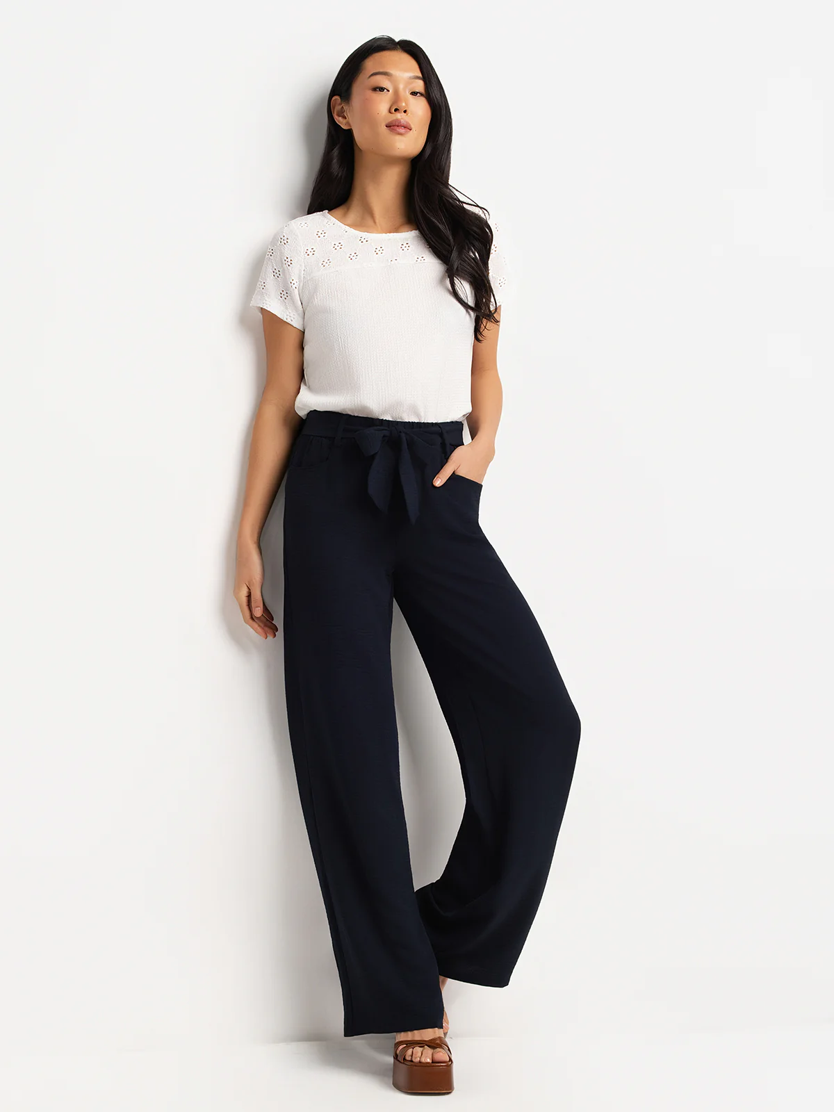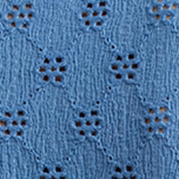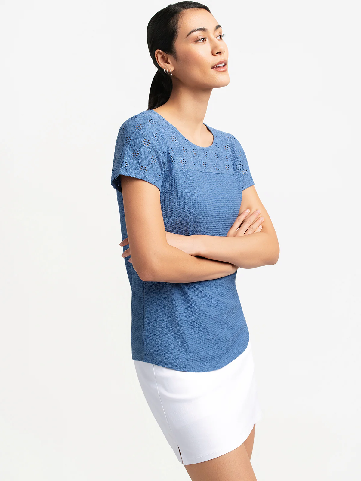 Haut à manches courtes présentant une encolure arrondie et un empiècement supérieur ajouré à motifs réguliers, distinct du corps à surface texturée.