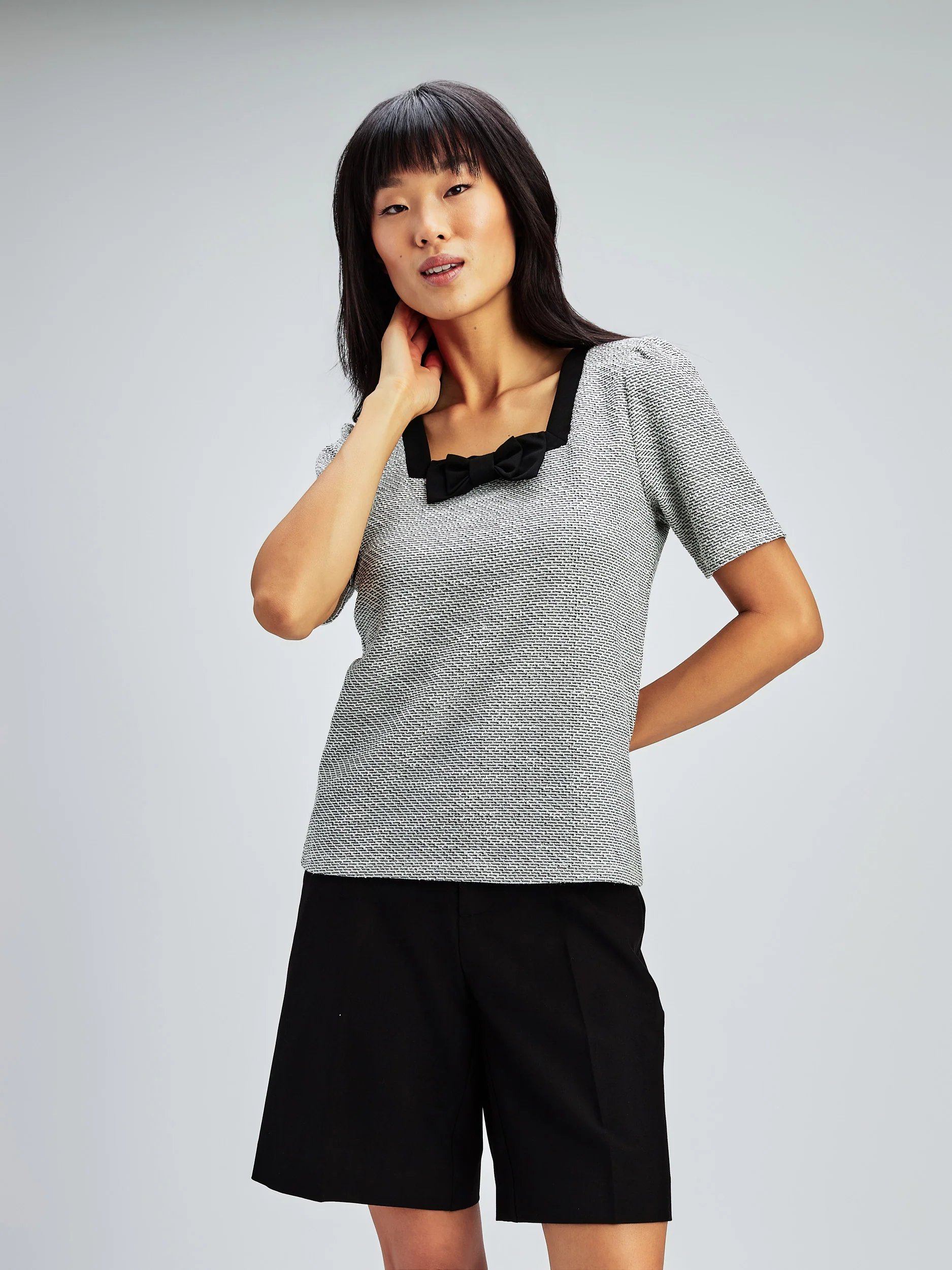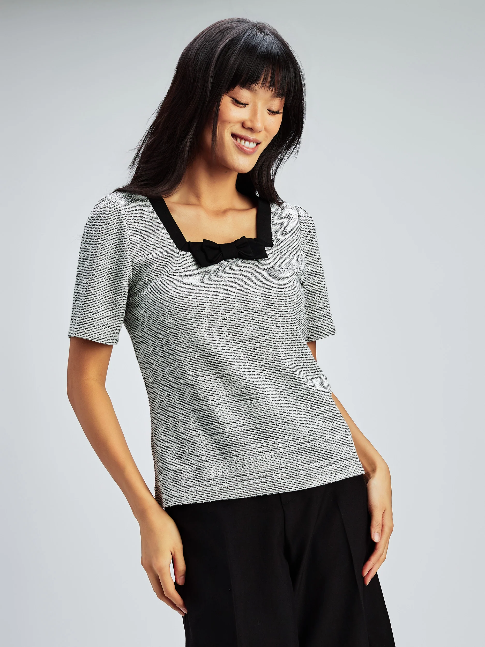 Ce t-shirt se distingue par son encolure carrée contrastée agrémentée par une boucle élégante.