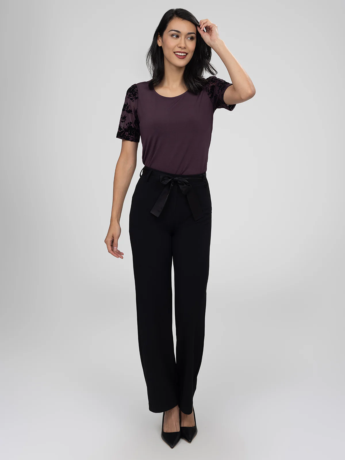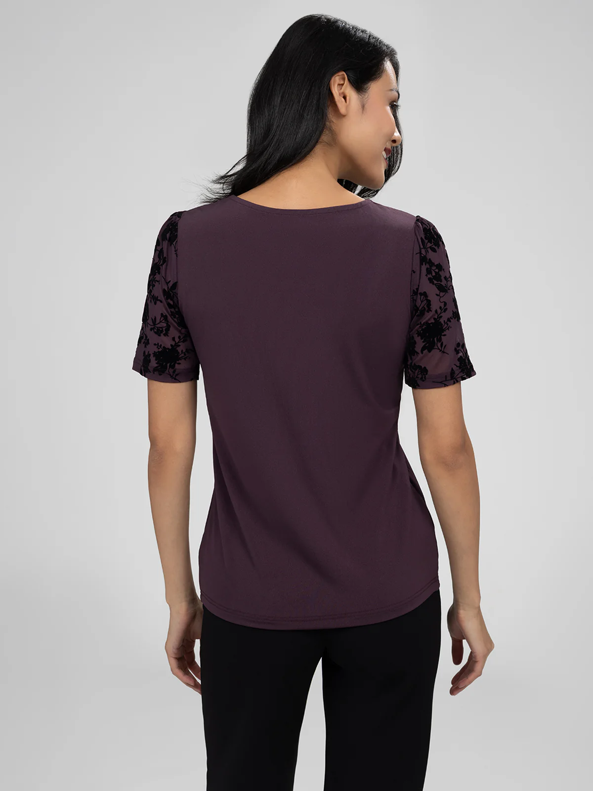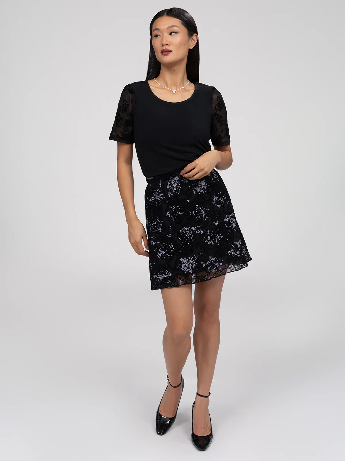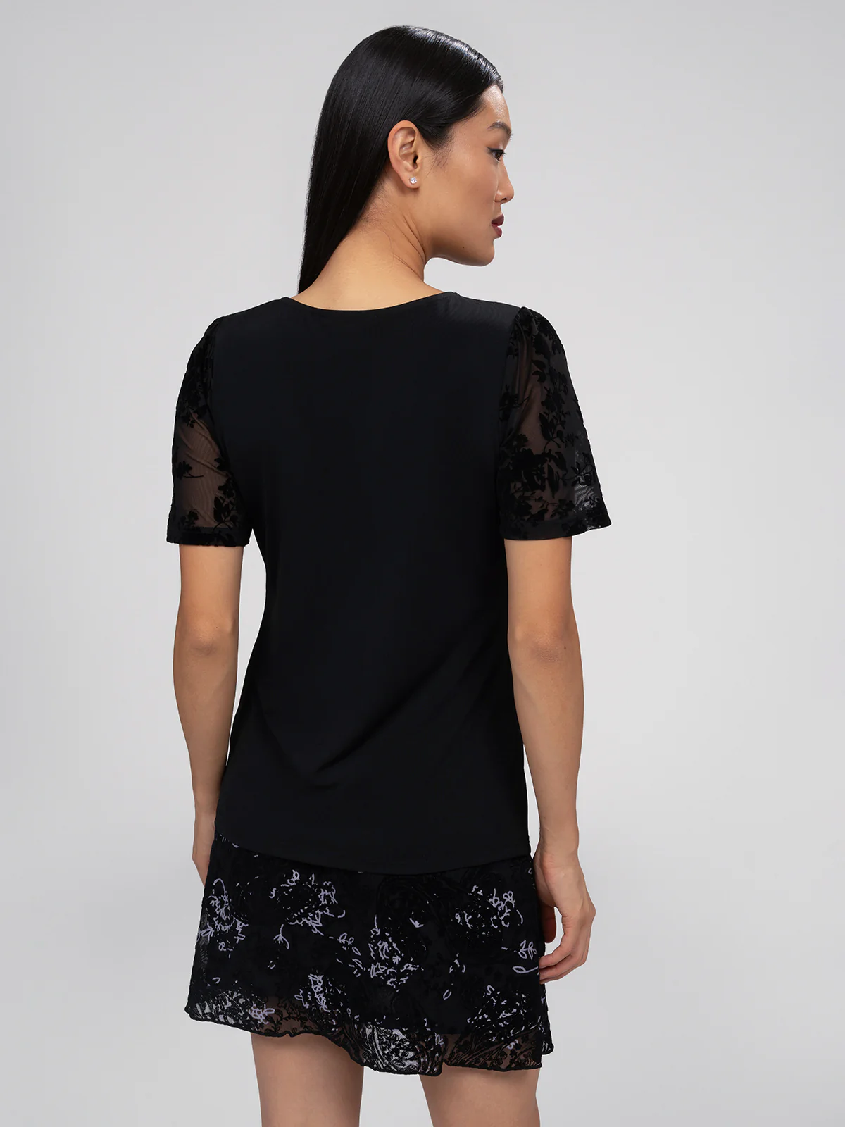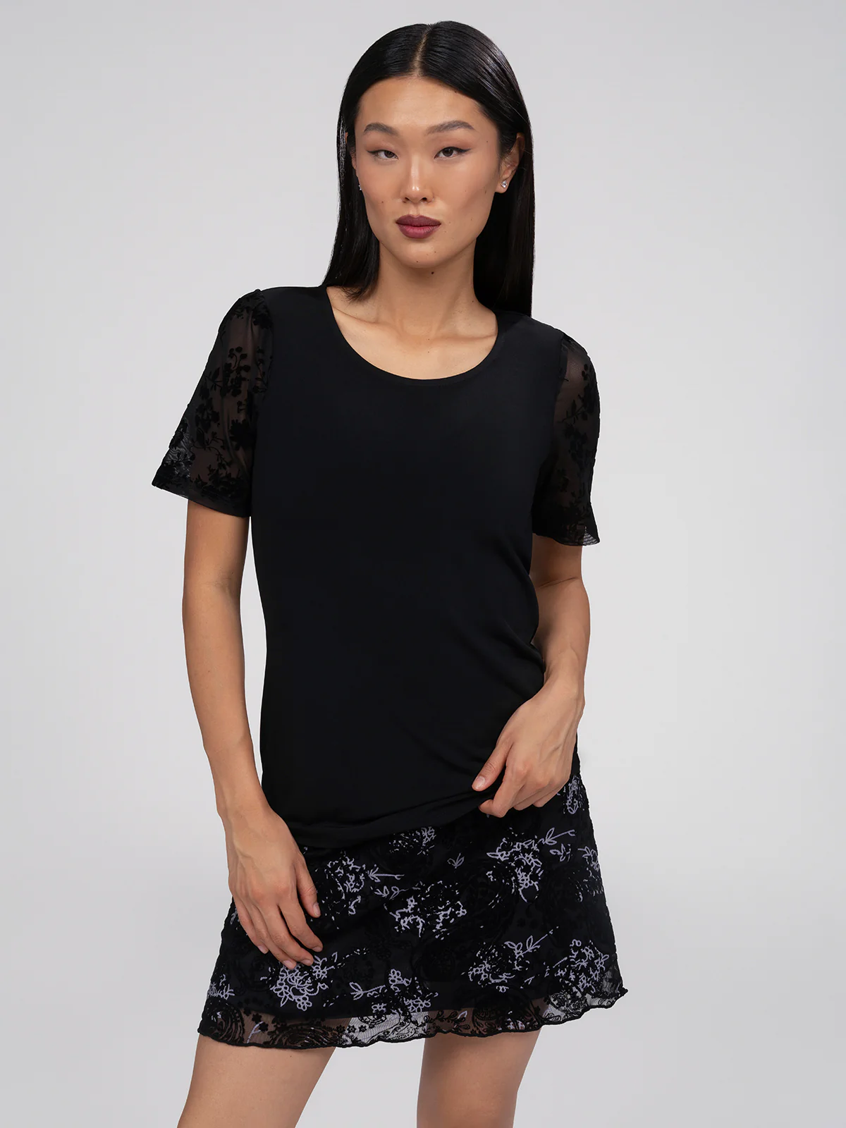 Le haut est réalisé dans un textile tricoté uni avec un col rond et des manches courtes décorées d’un motif floral en relief en velours.