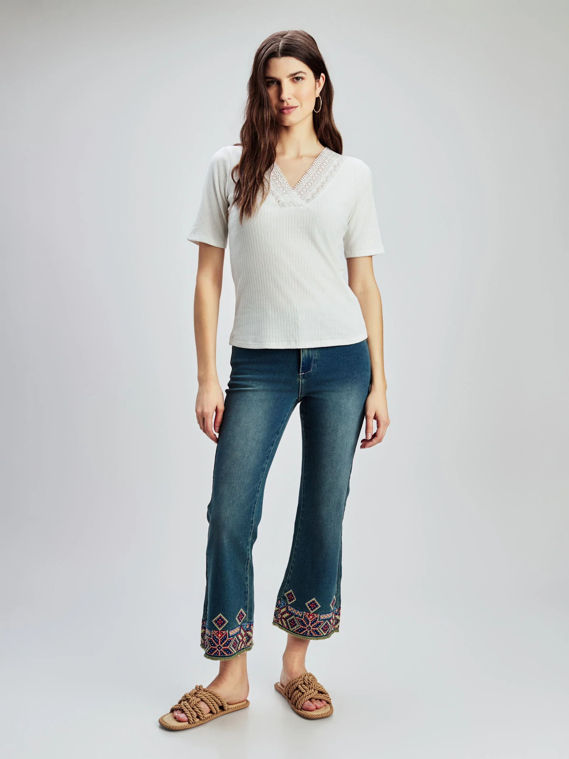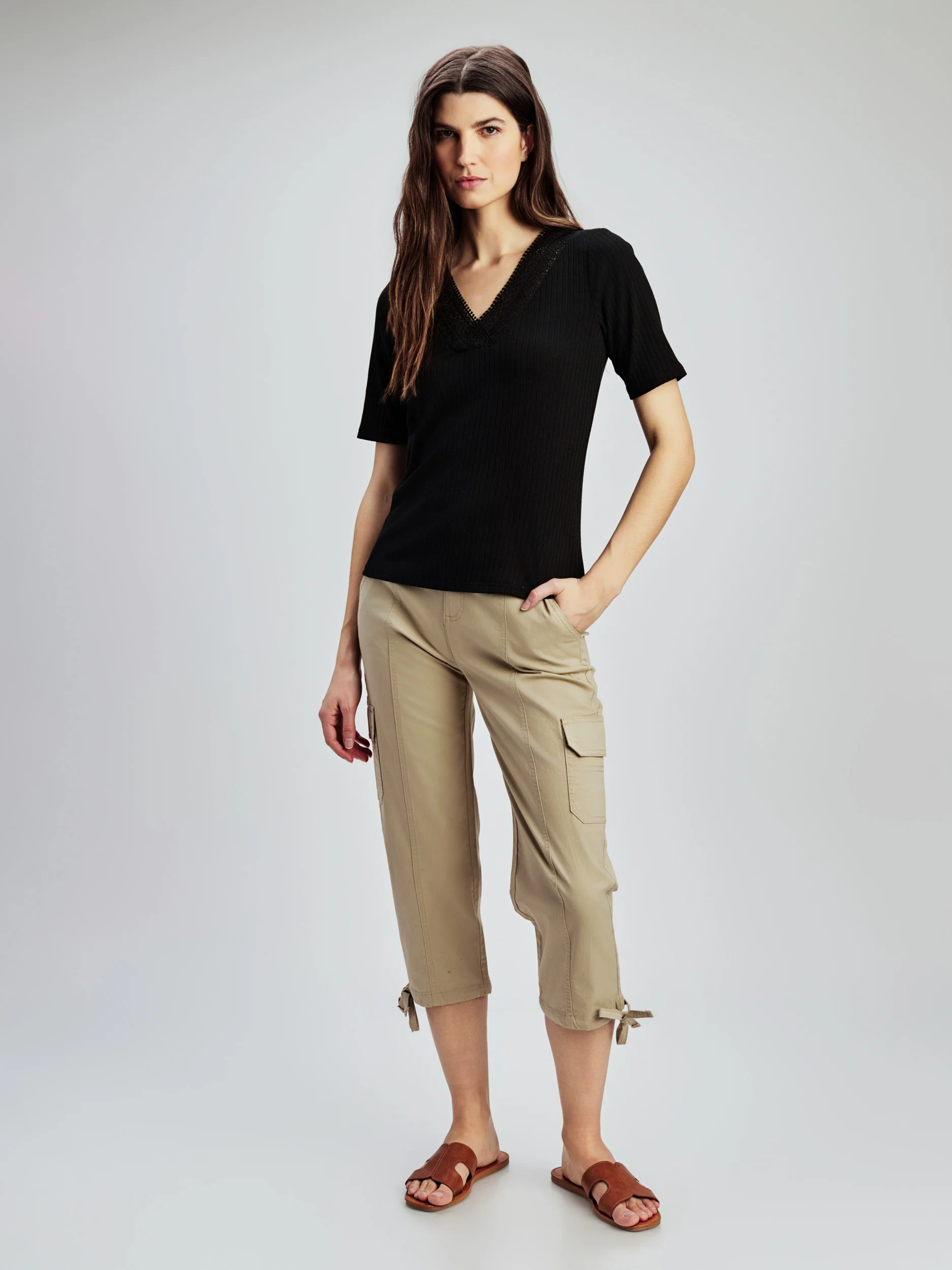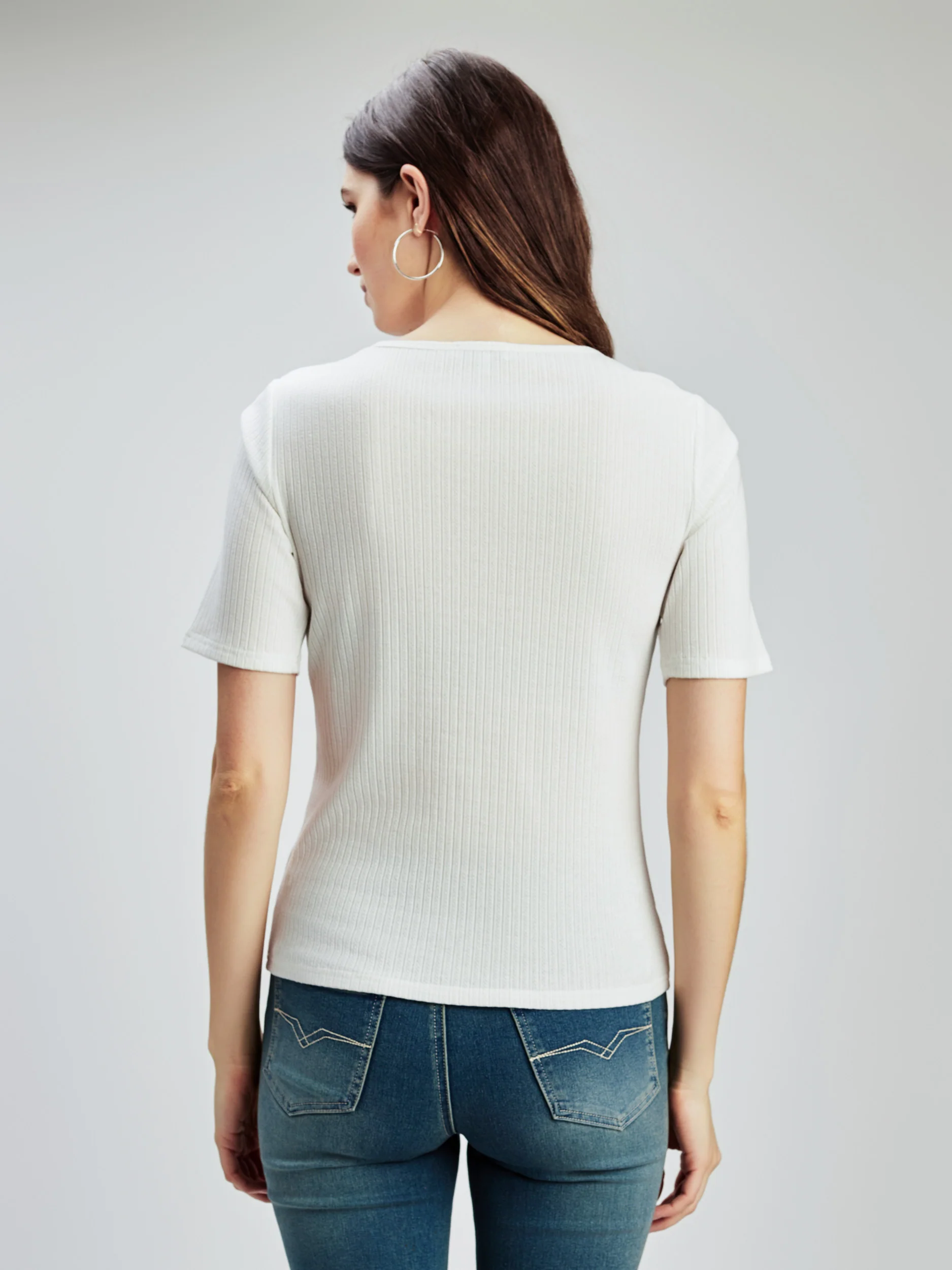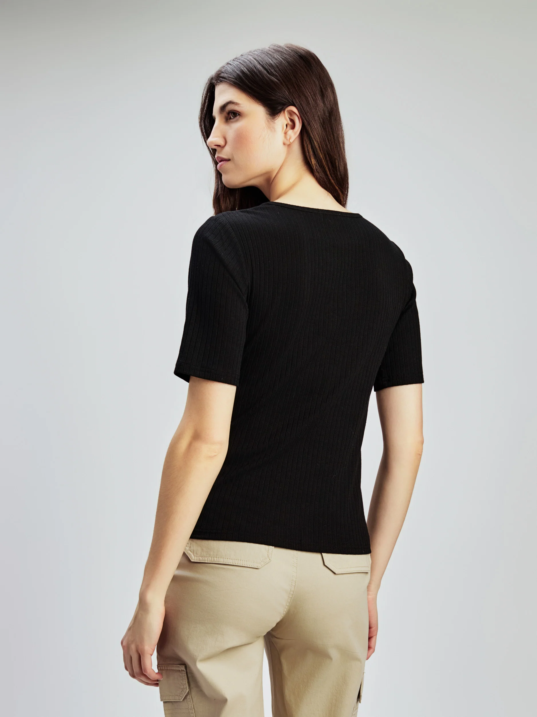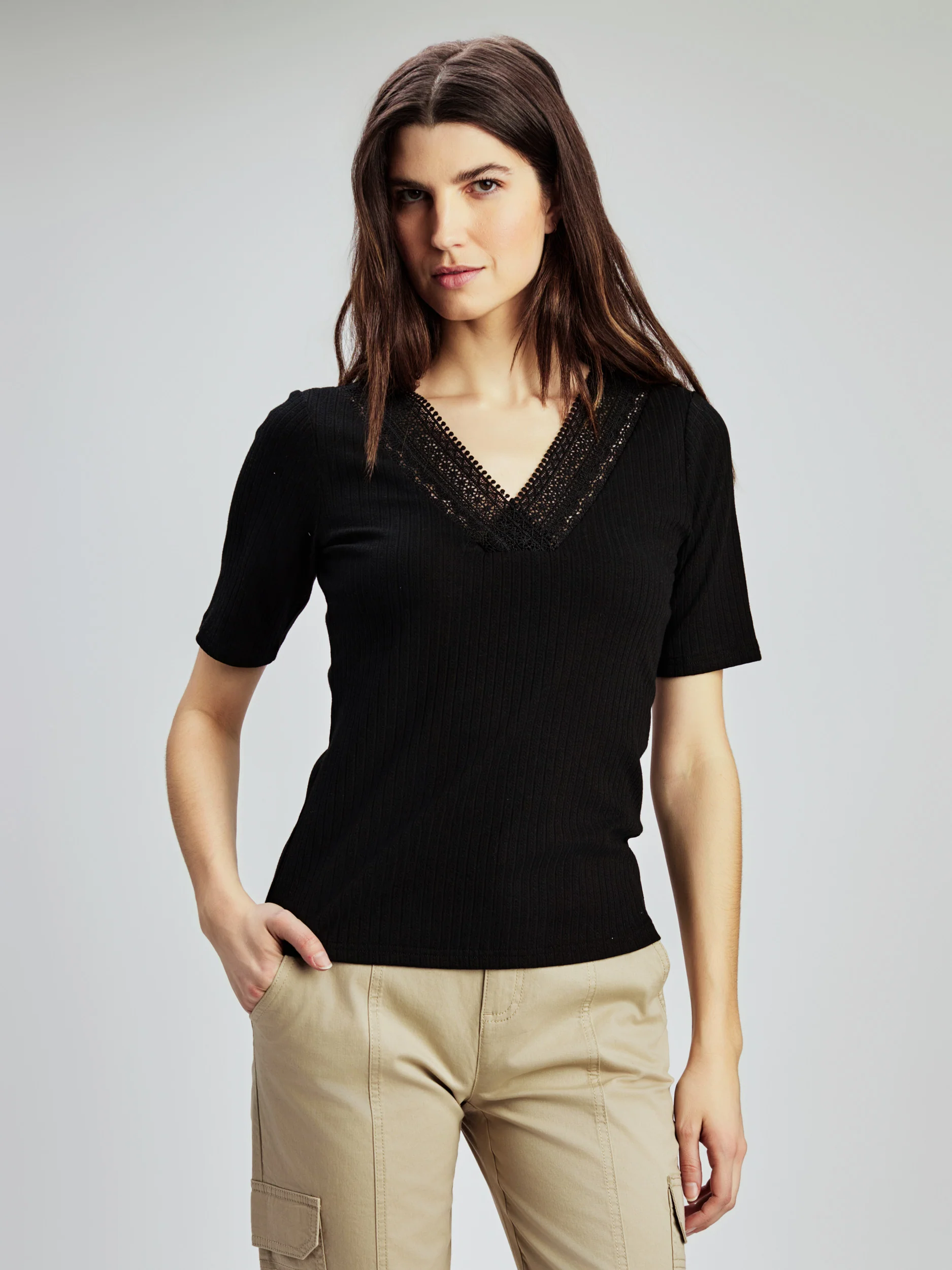 T-shirt semi-ajusté confectionné dans un tissu côtelé , avec encolure en V rehaussée d’une délicate bordure en dentelle.