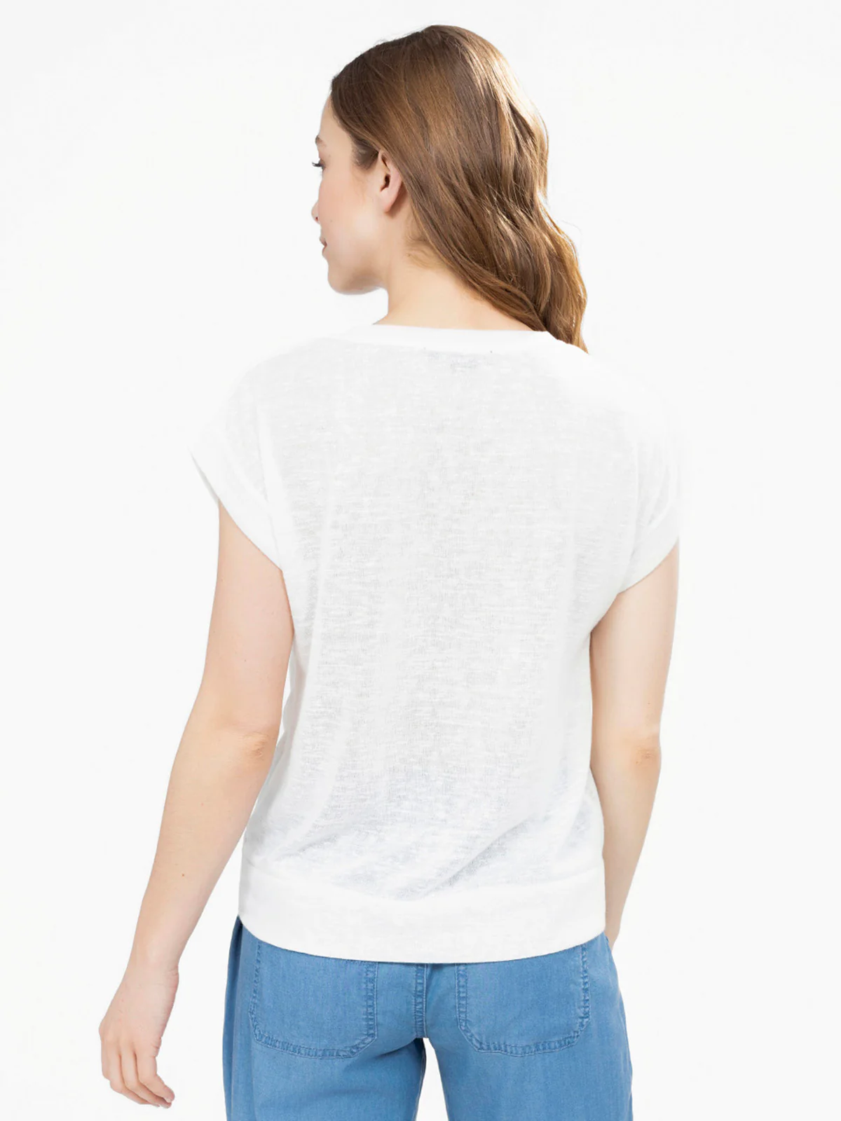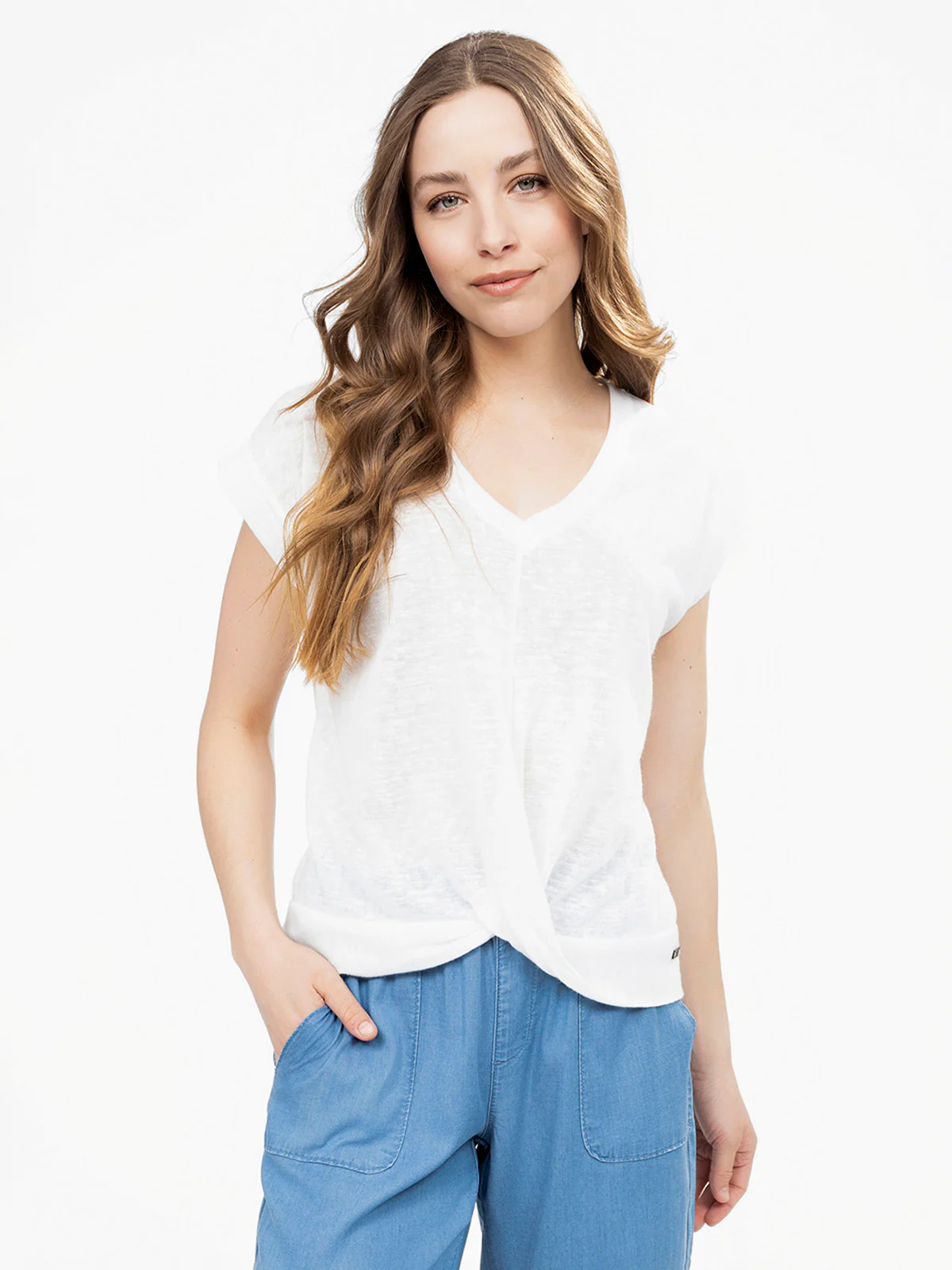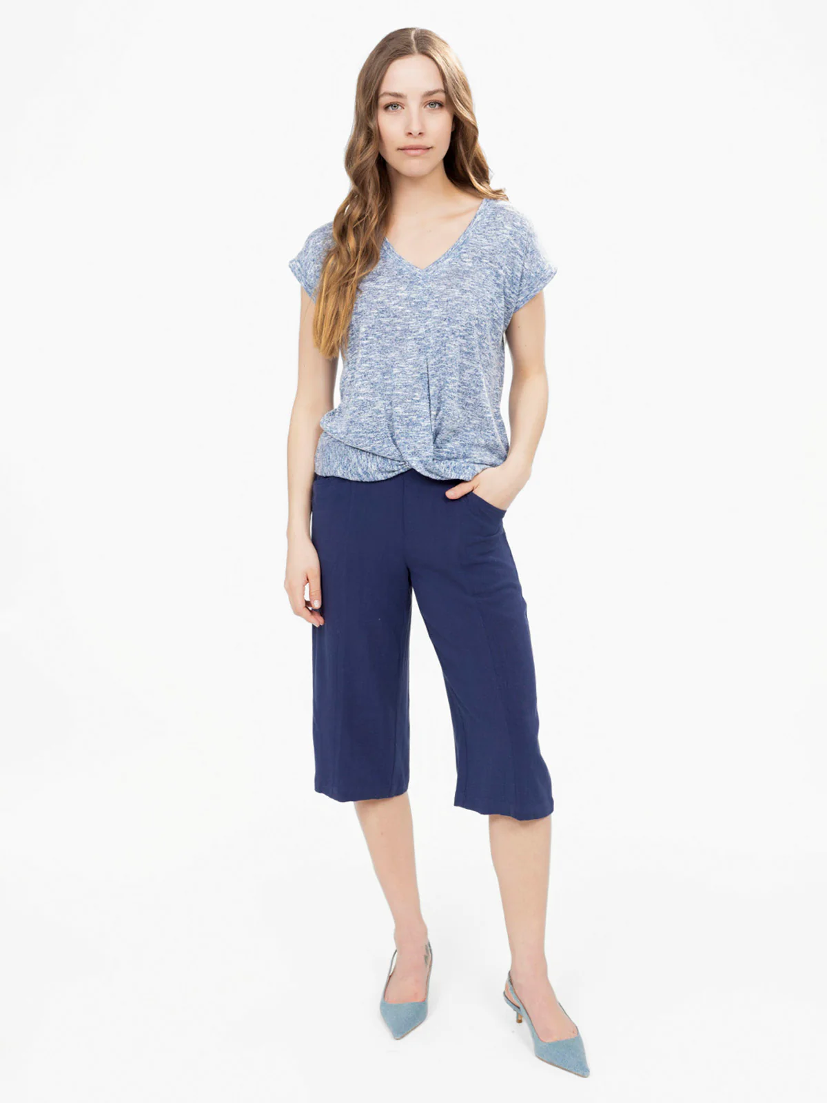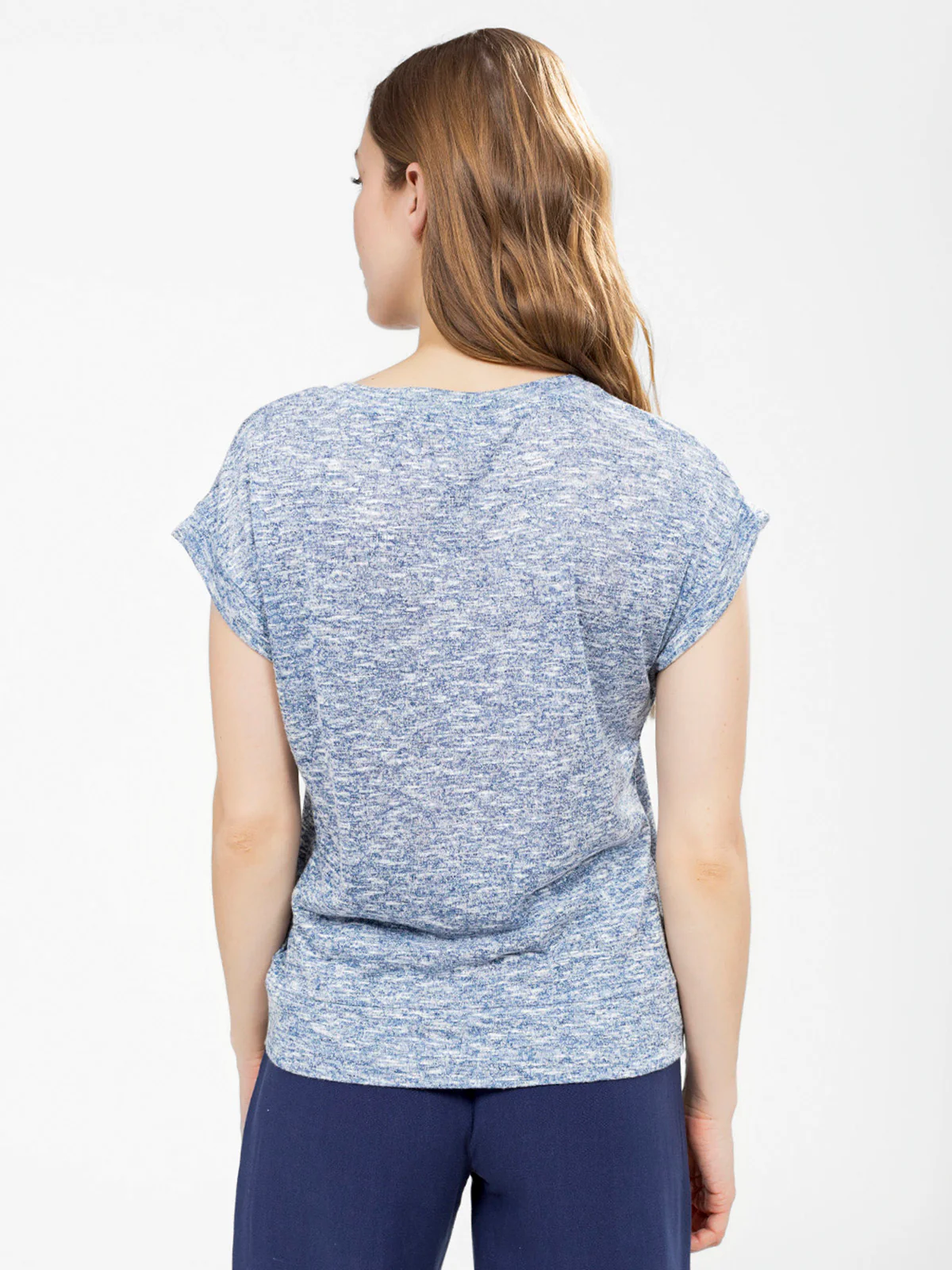 T-shirt semi-ajusté avec encolure en V, manches tombantes et nœud torsadé sur le devant. Ourlet droit au dos et texture fluide avec un aspect chiné subtil.