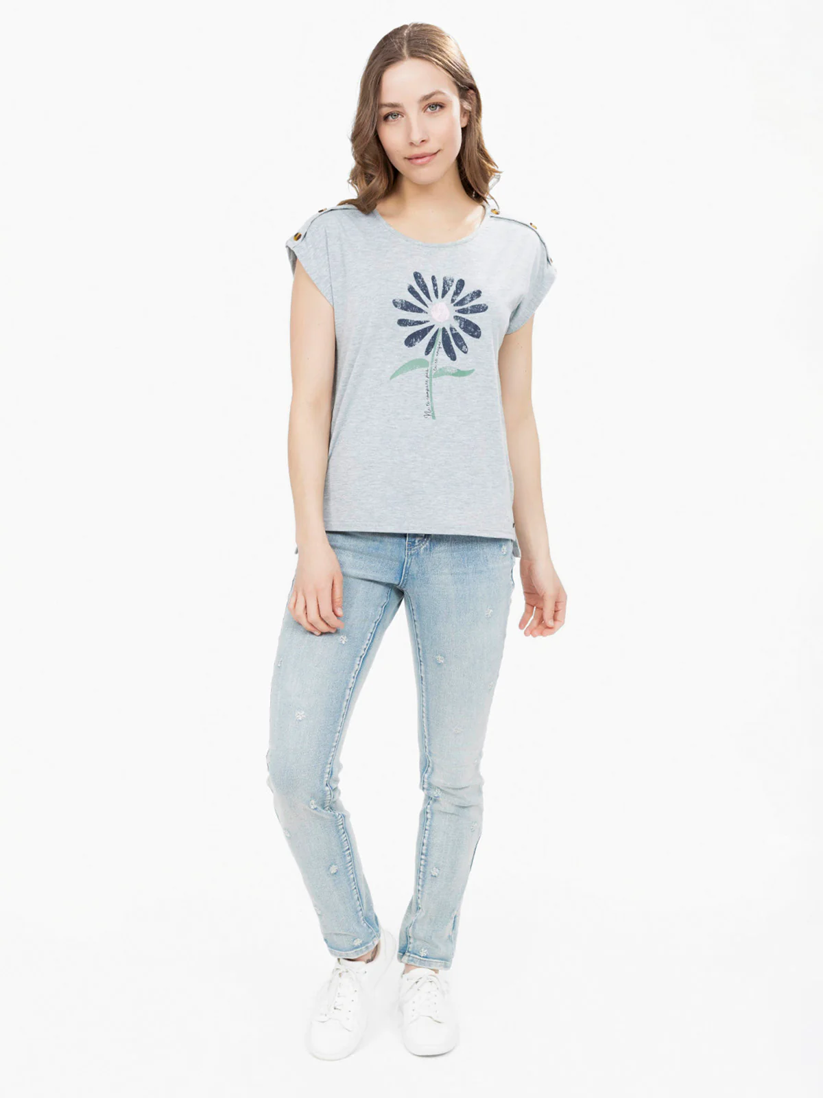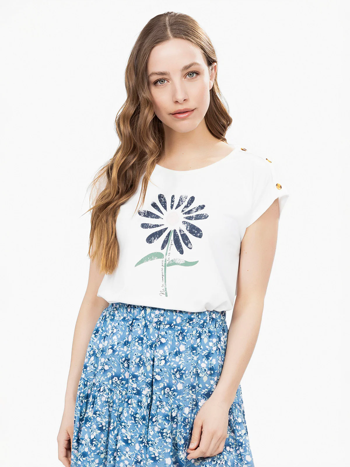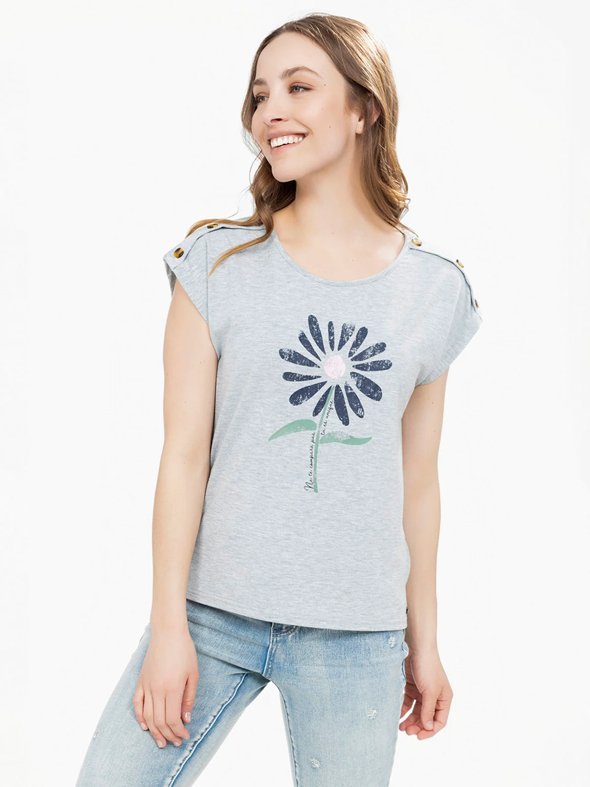 Encolure ronde et épaules boutonnées avec pattes, imprimé placé sur le devant, coupe fluide légèrement arrondie au bas. Manches tombantes sans couture pour un effet structuré.