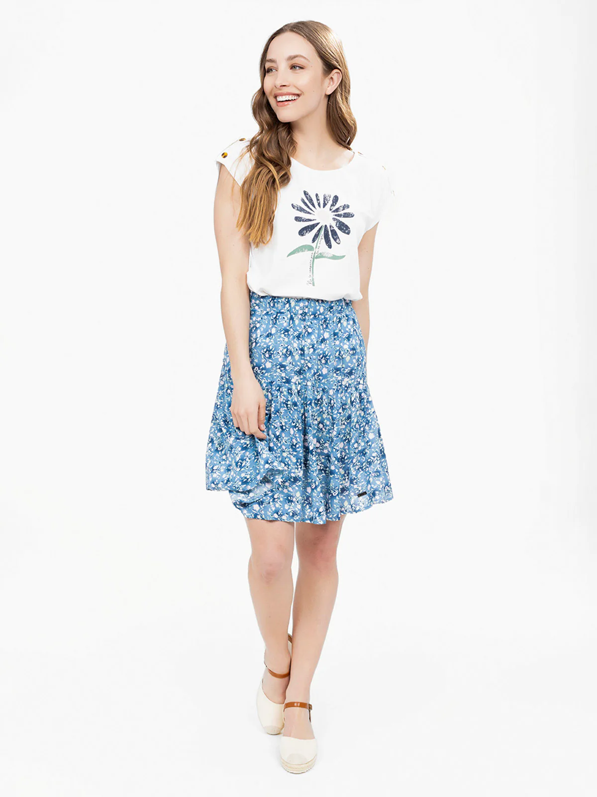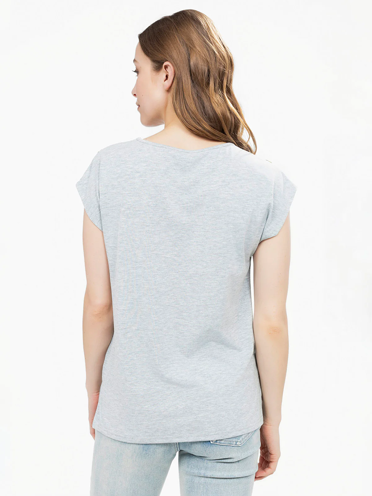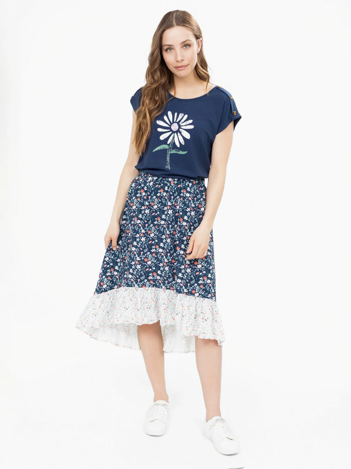 Encolure ronde et épaules boutonnées avec pattes, imprimé placé sur le devant, coupe fluide légèrement arrondie au bas. Manches tombantes sans couture pour un effet structuré.