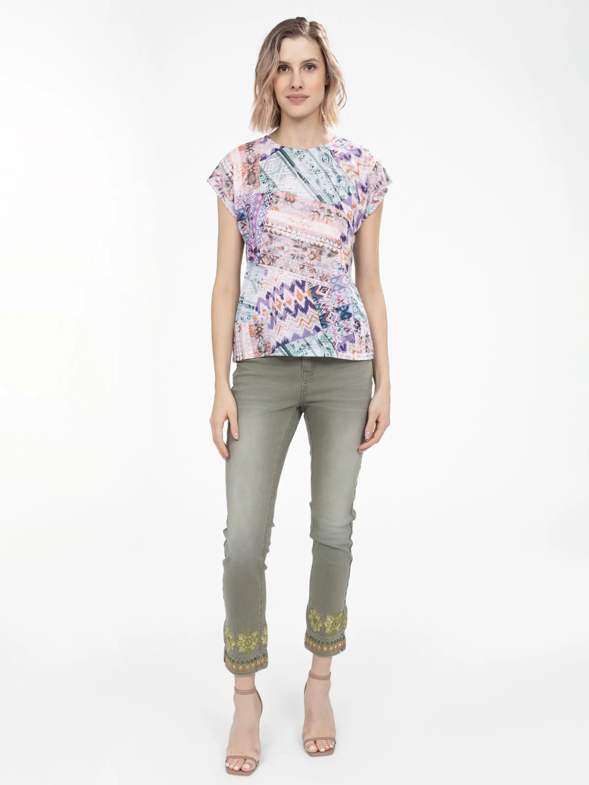 T-shirt à coupe semi-ajustée, longueur hanches, col rond ras du cou et manches courtes intégrées sans couture à l’épaule. Le tissu fluide est orné d’un motif patchwork géométrique et le dos est structuré par un panneau froncé vertical.