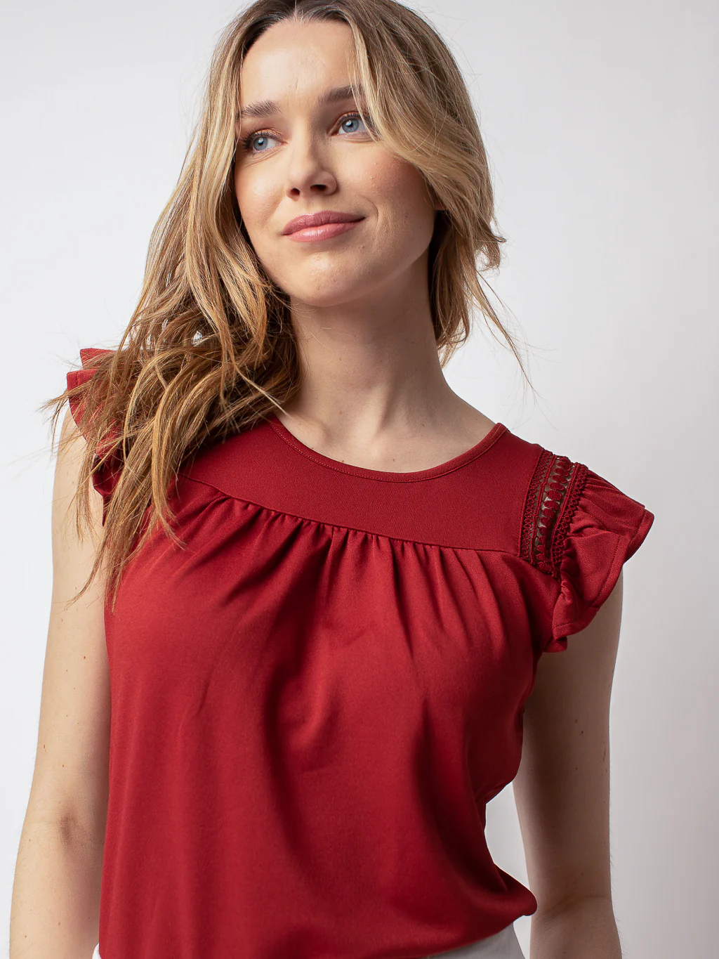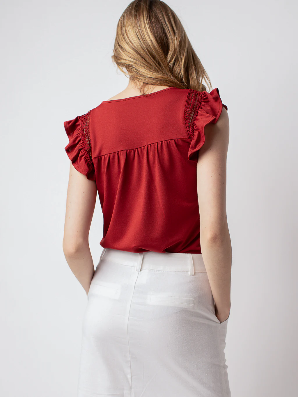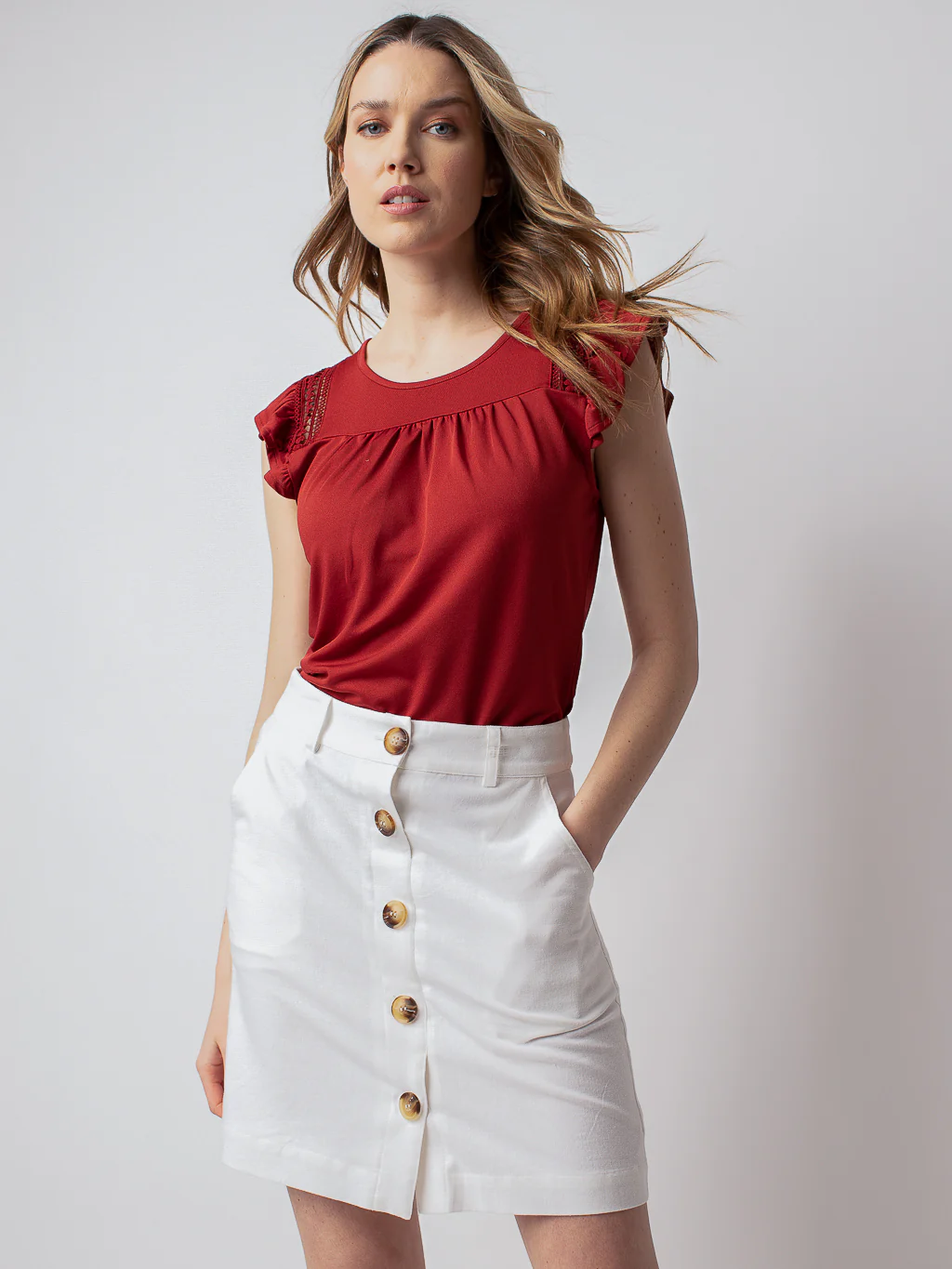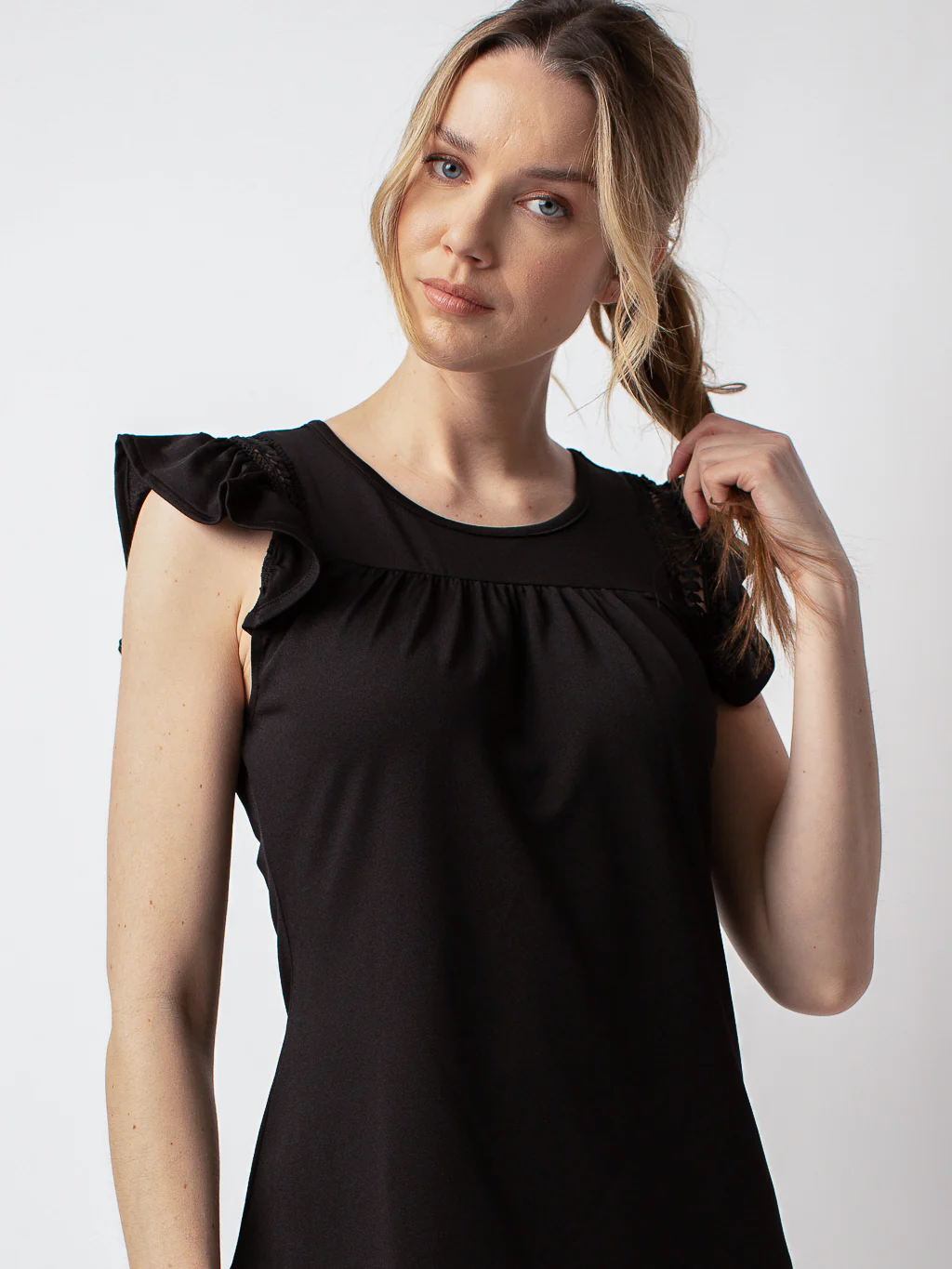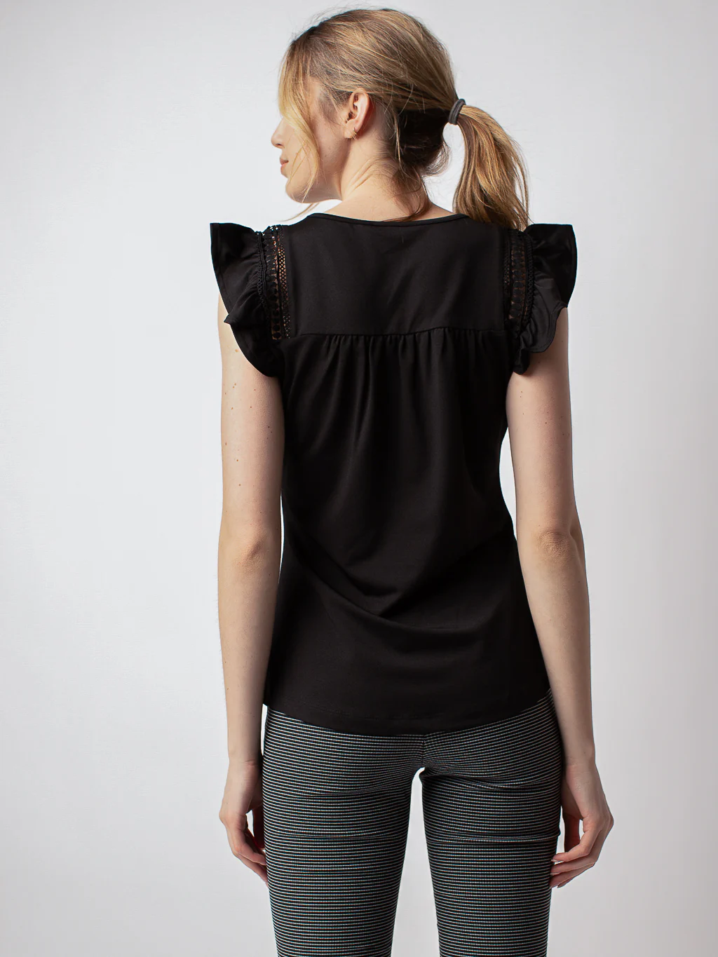 T-shirt semi-ajusté, col rond et manche courtes à volants en font un haut très féminin.