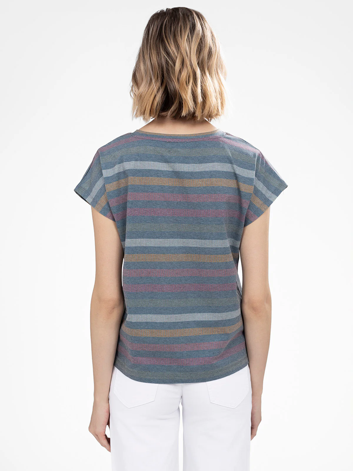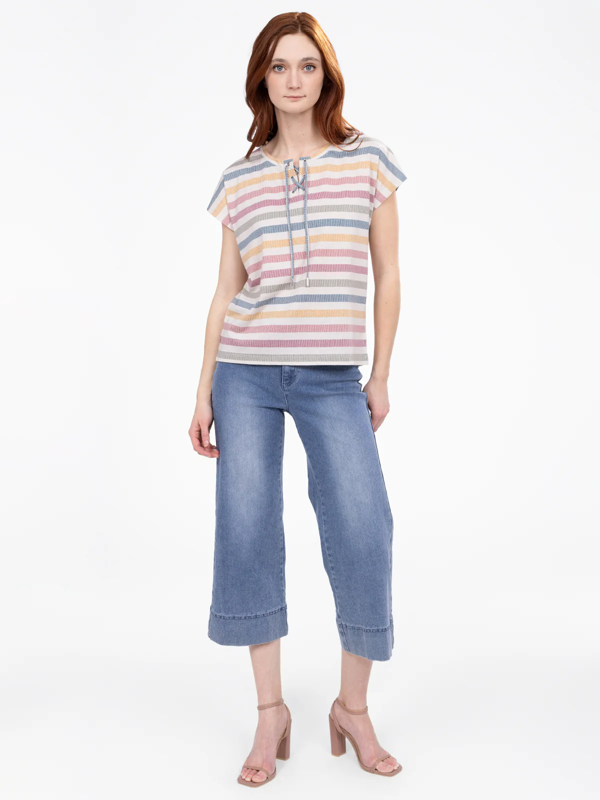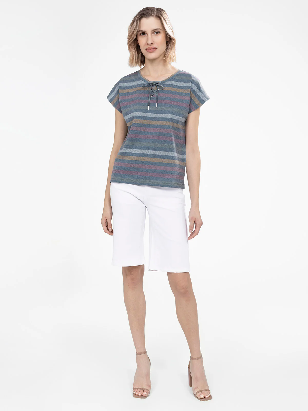Ce haut rayé revisite un classique avec son laçage délicat au col et ses manches courtes fluides. Son tissu léger et sa coupe légèrement ample offrent une sensation de liberté.