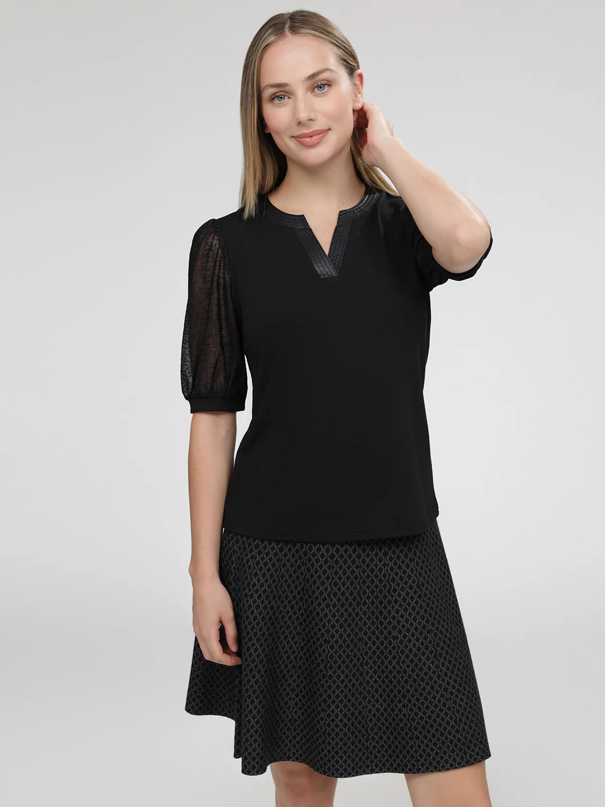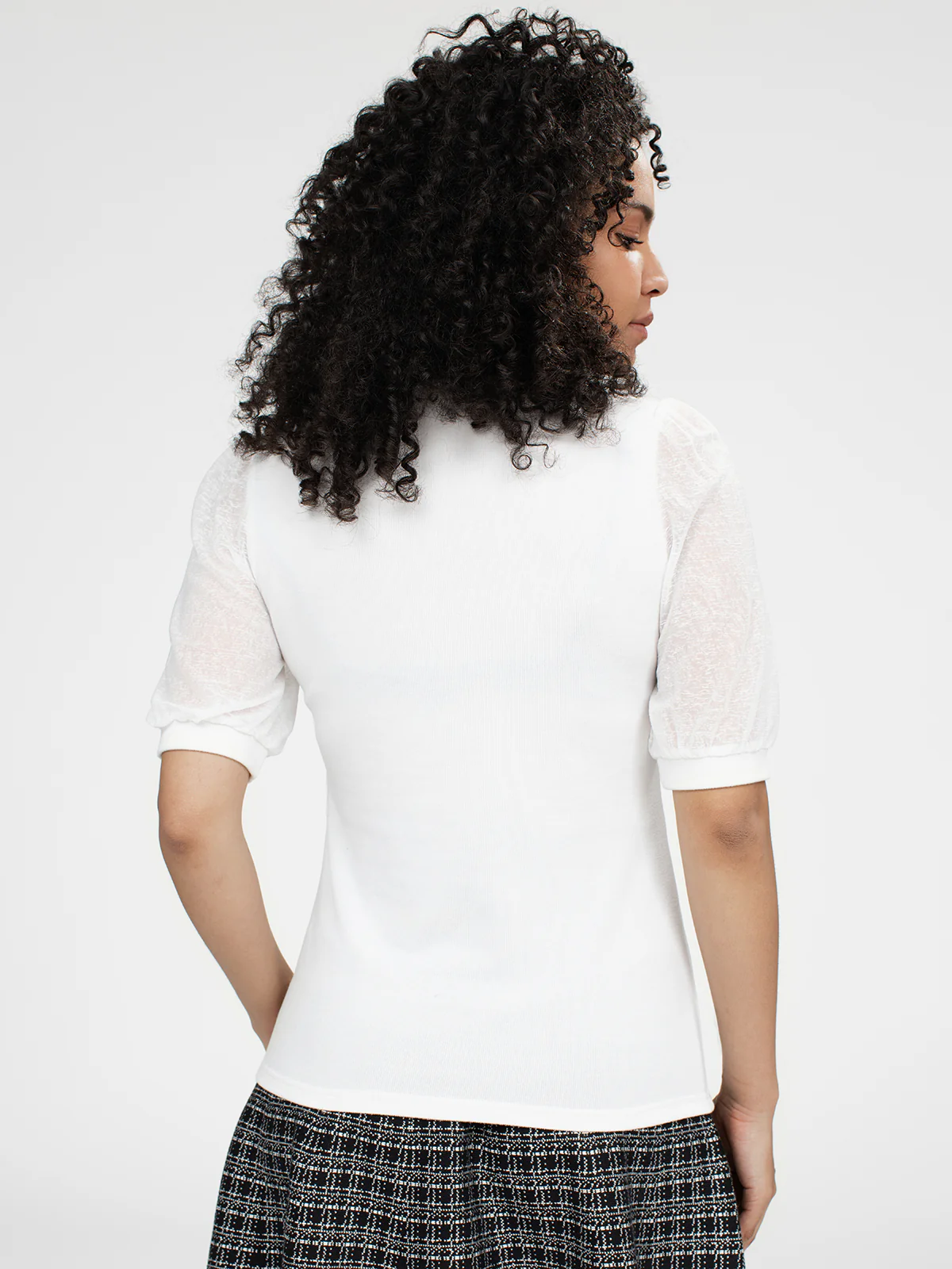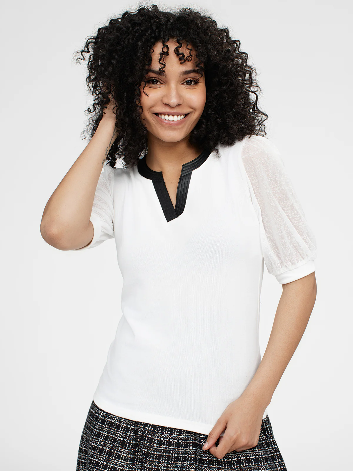 T-shirt semi-ajusté en jersey côtelé, avec manches courtes ballon en tissu voile semi-transparent et ourlet droit. Col en V structuré par une pièce en contraste cousue sur le devant.