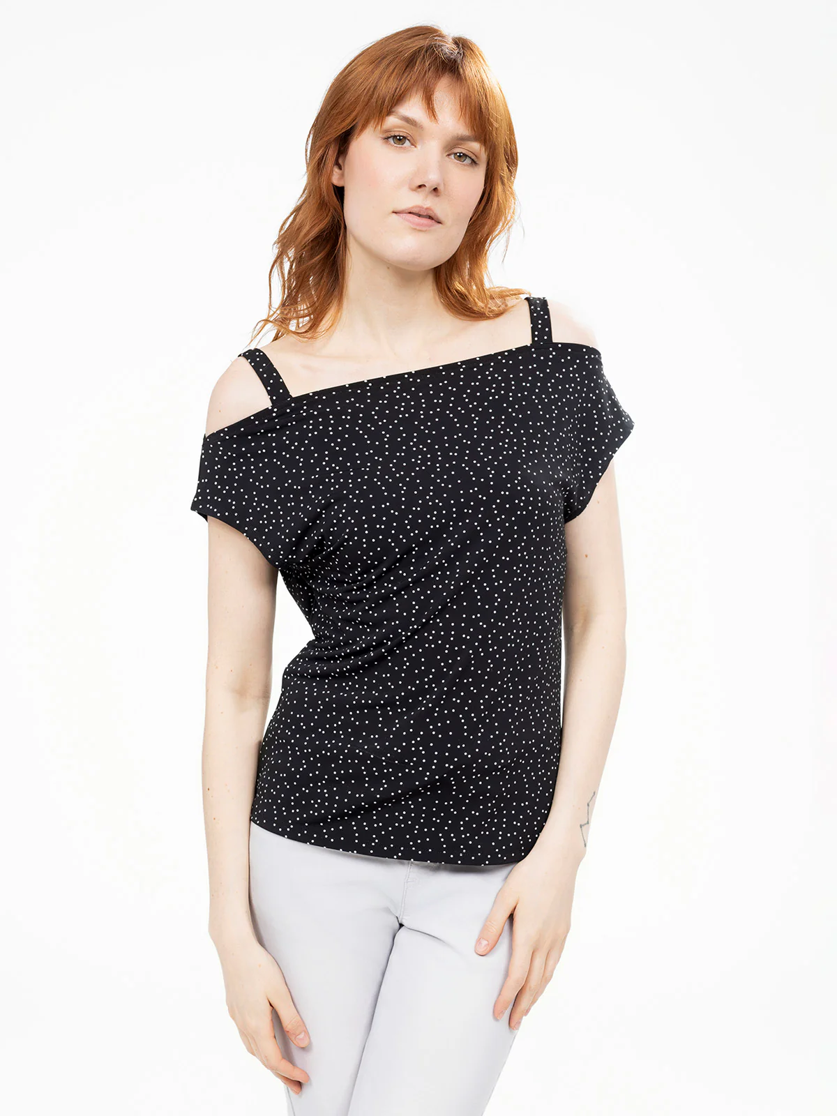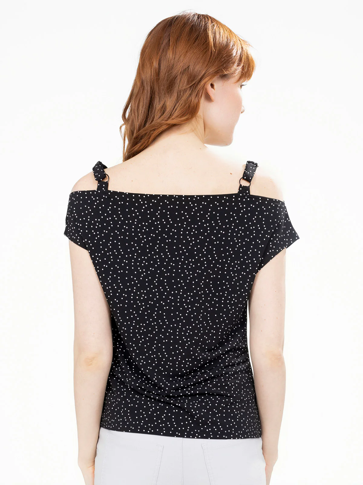 Haut à encolure droite avec épaules dégagées et bretelles larges nouées, confectionné dans une maille fluide à micro-imprimé contrasté.