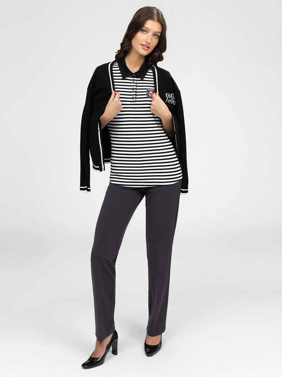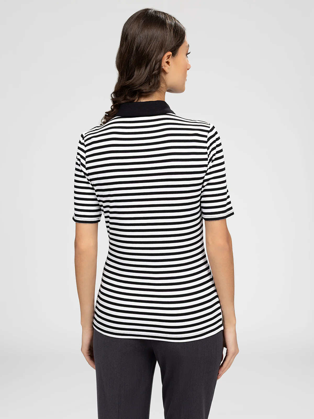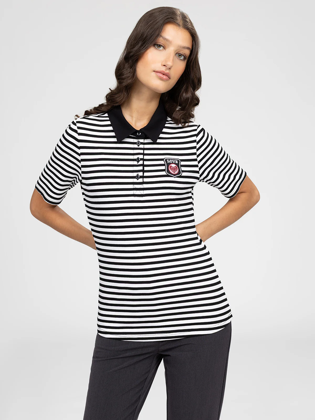 Polo à manches courtes avec patte de boutonnage sur le devant et col contrastant. Motif rayé horizontal et écusson appliqué sur la poitrine.