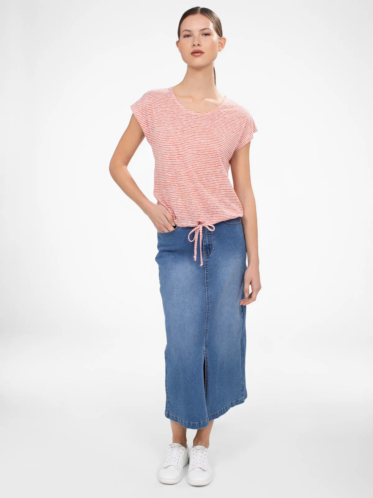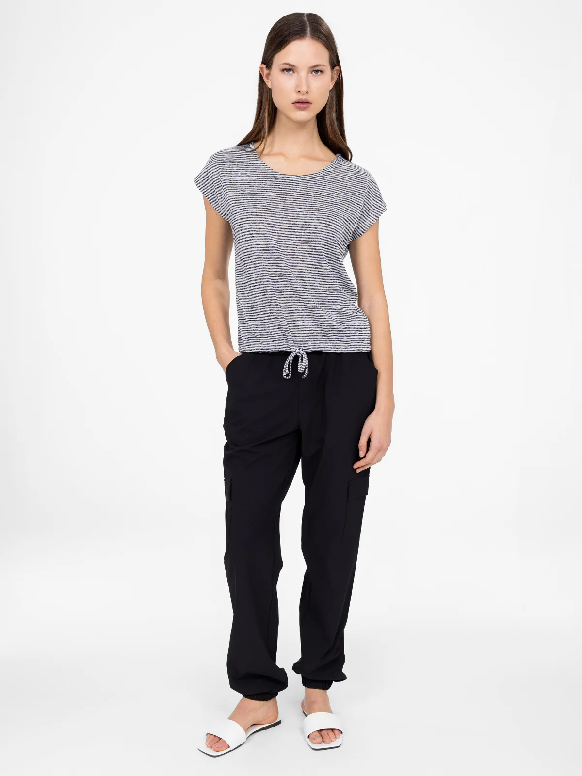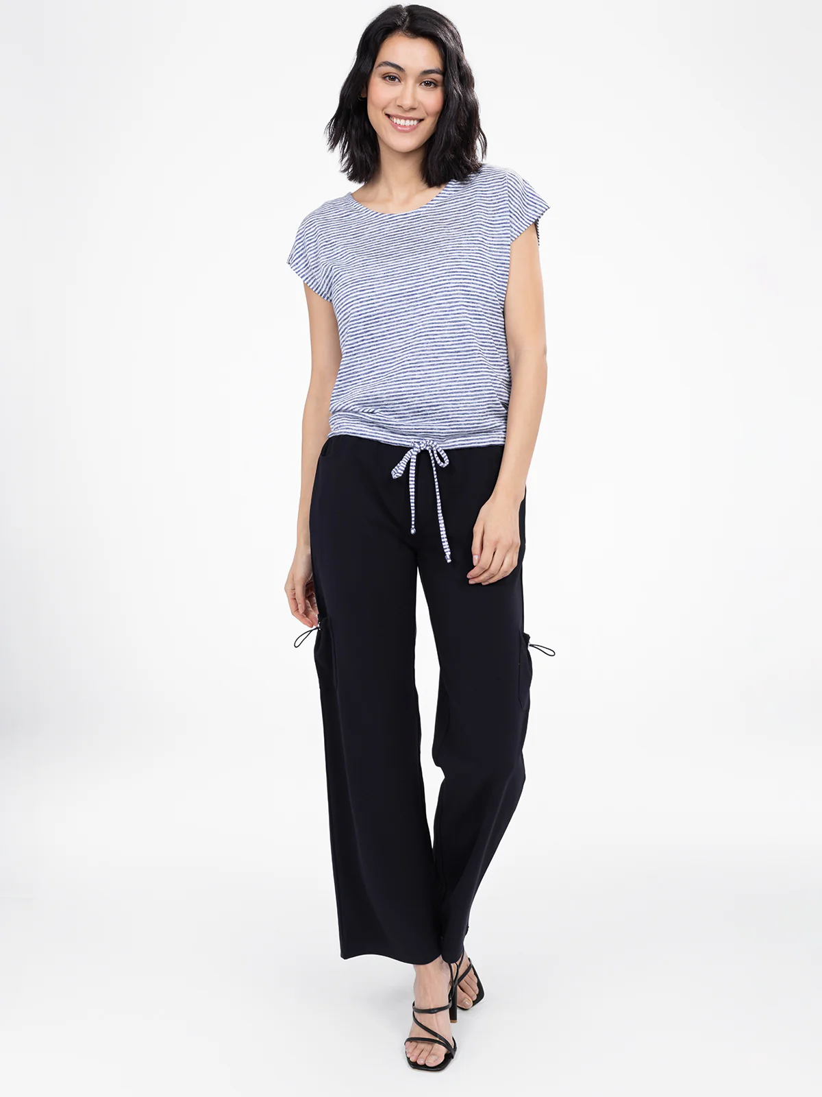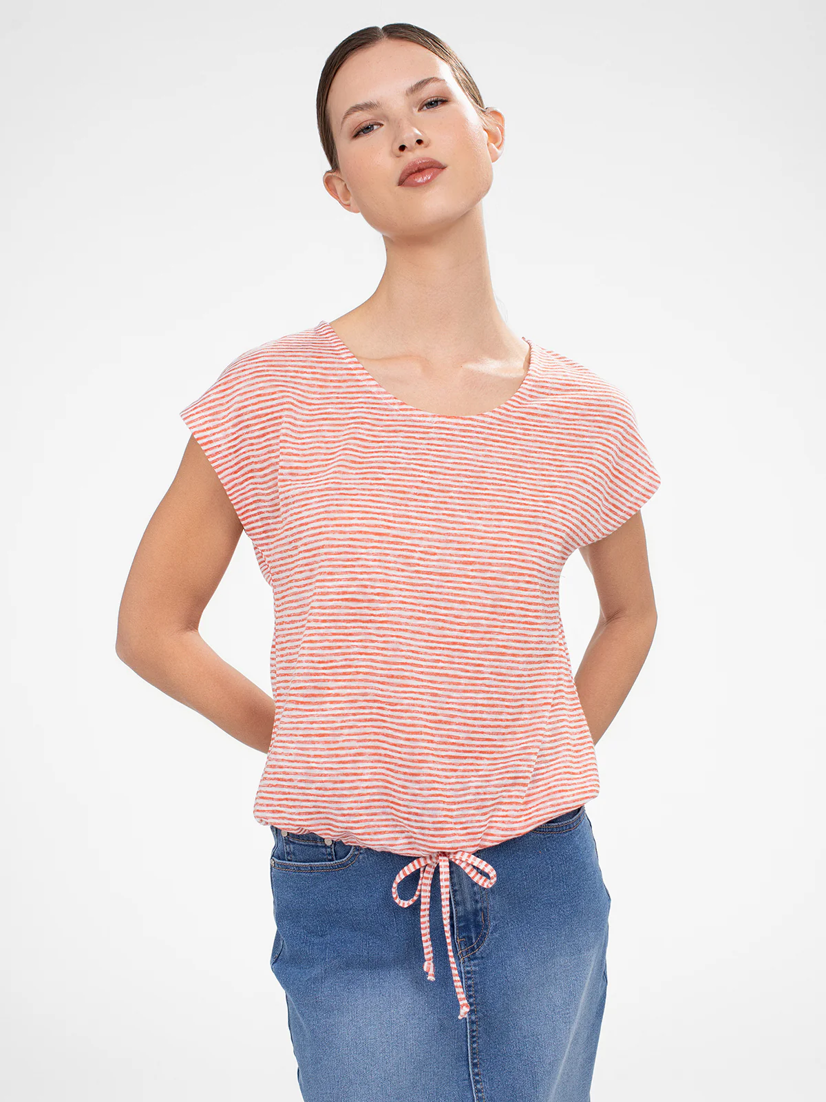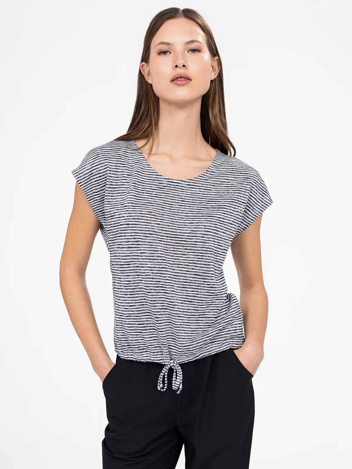 Une silhouette aérienne soulignée par des rayures fines et un cordon ajustable, à nouer selon vos envies. Son col arrondi et ses manches légèrement tombantes offrent une sensation de liberté absolue.