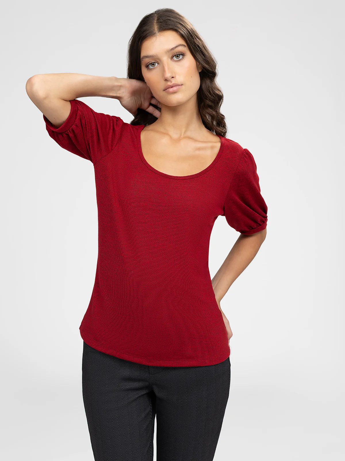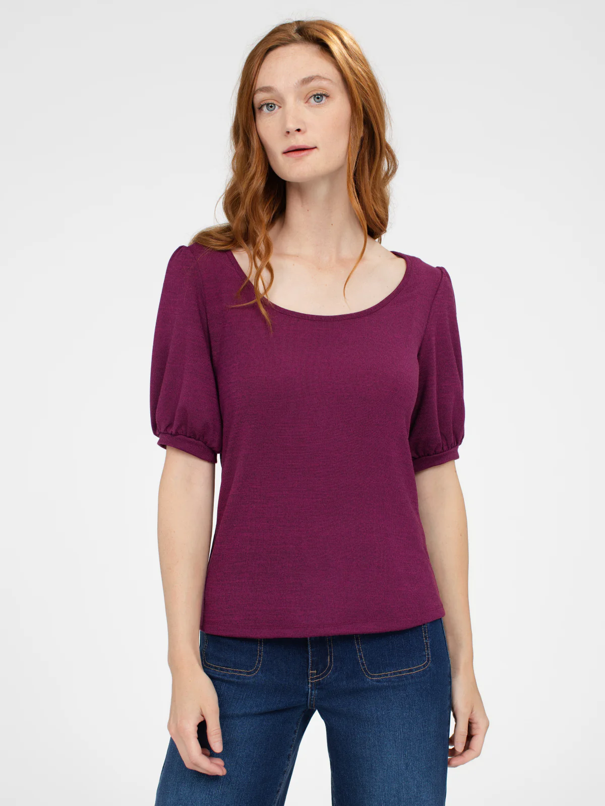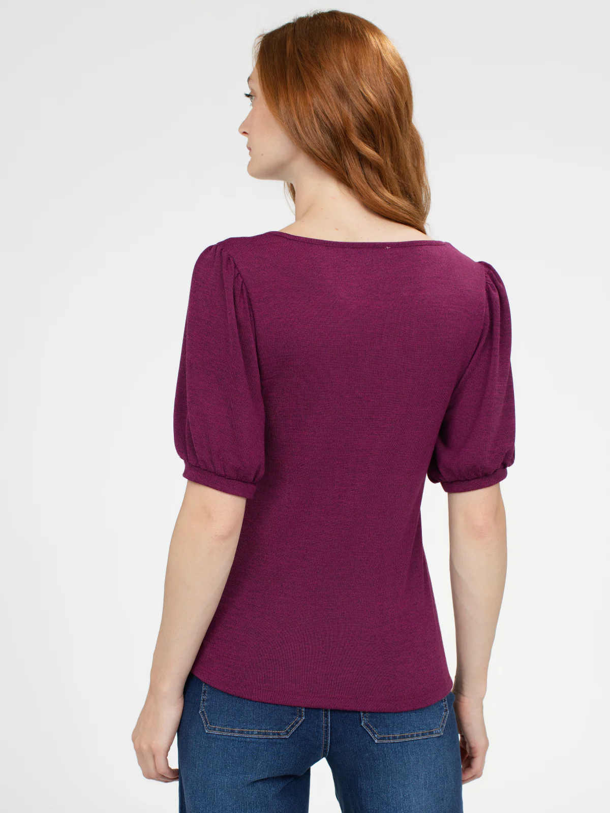 Ce modèle en maille unie offre une coupe semi-ajustée avec col rond ouvert et manches courtes bouffantes. Les manches sont élastiquées et l’ourlet est droit.