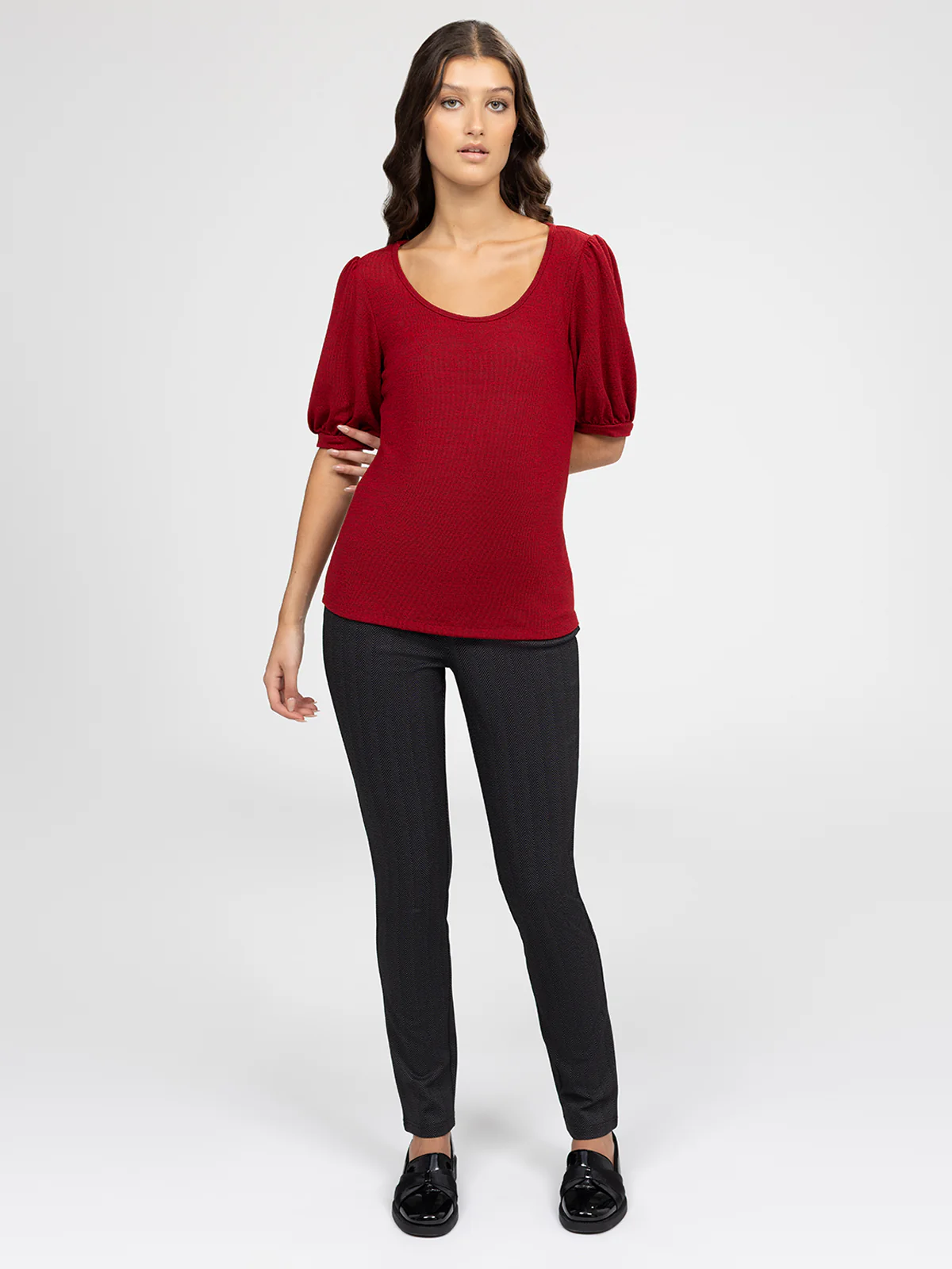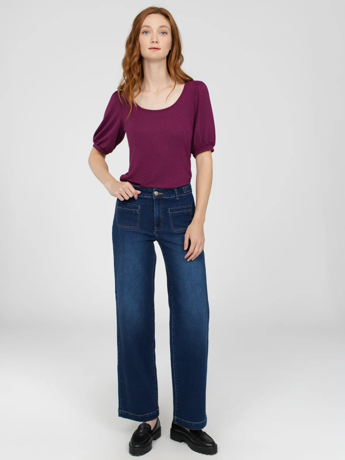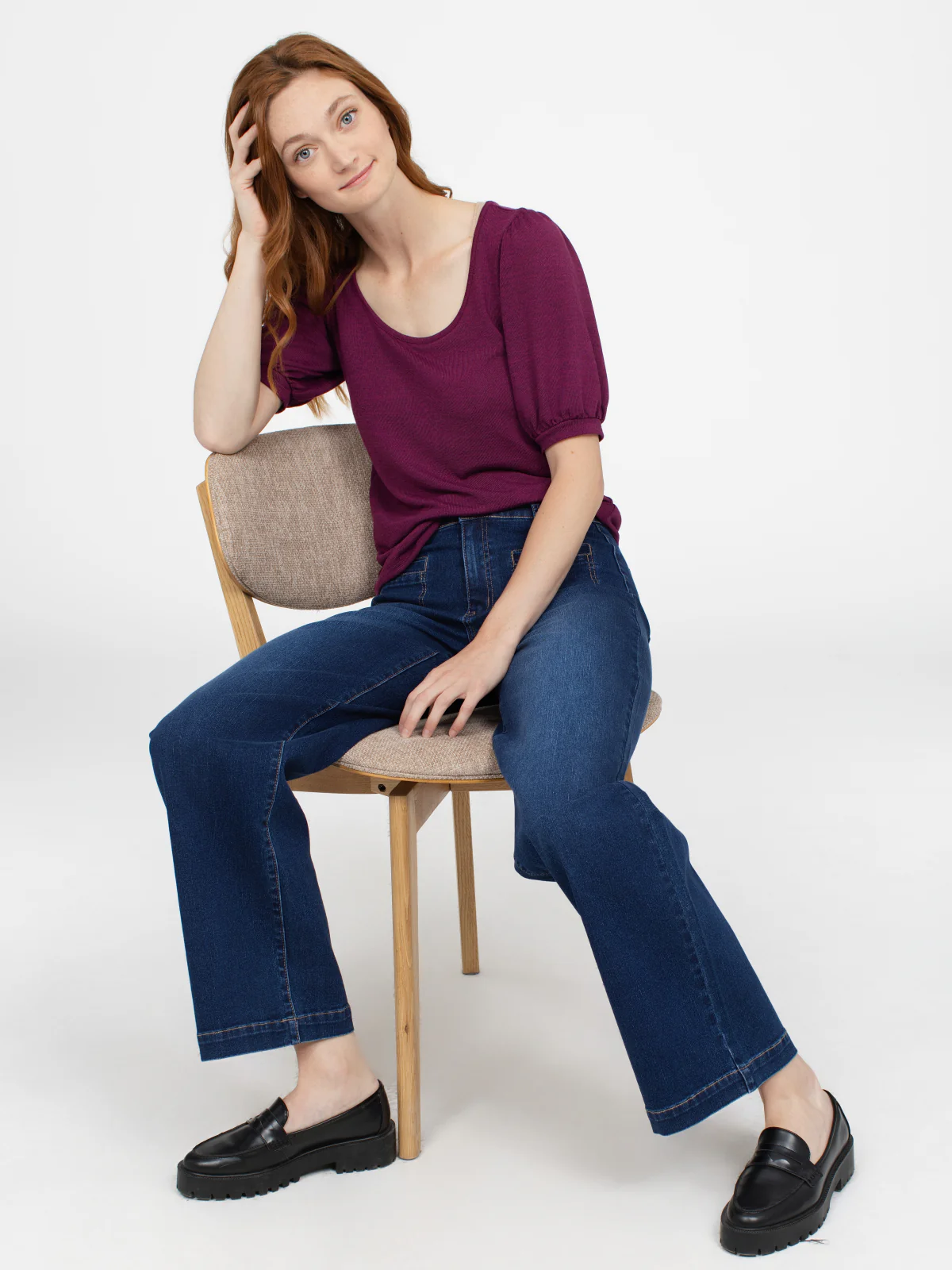 Ce modèle en maille unie offre une coupe semi-ajustée avec col rond ouvert et manches courtes bouffantes. Les manches sont élastiquées et l’ourlet est droit.