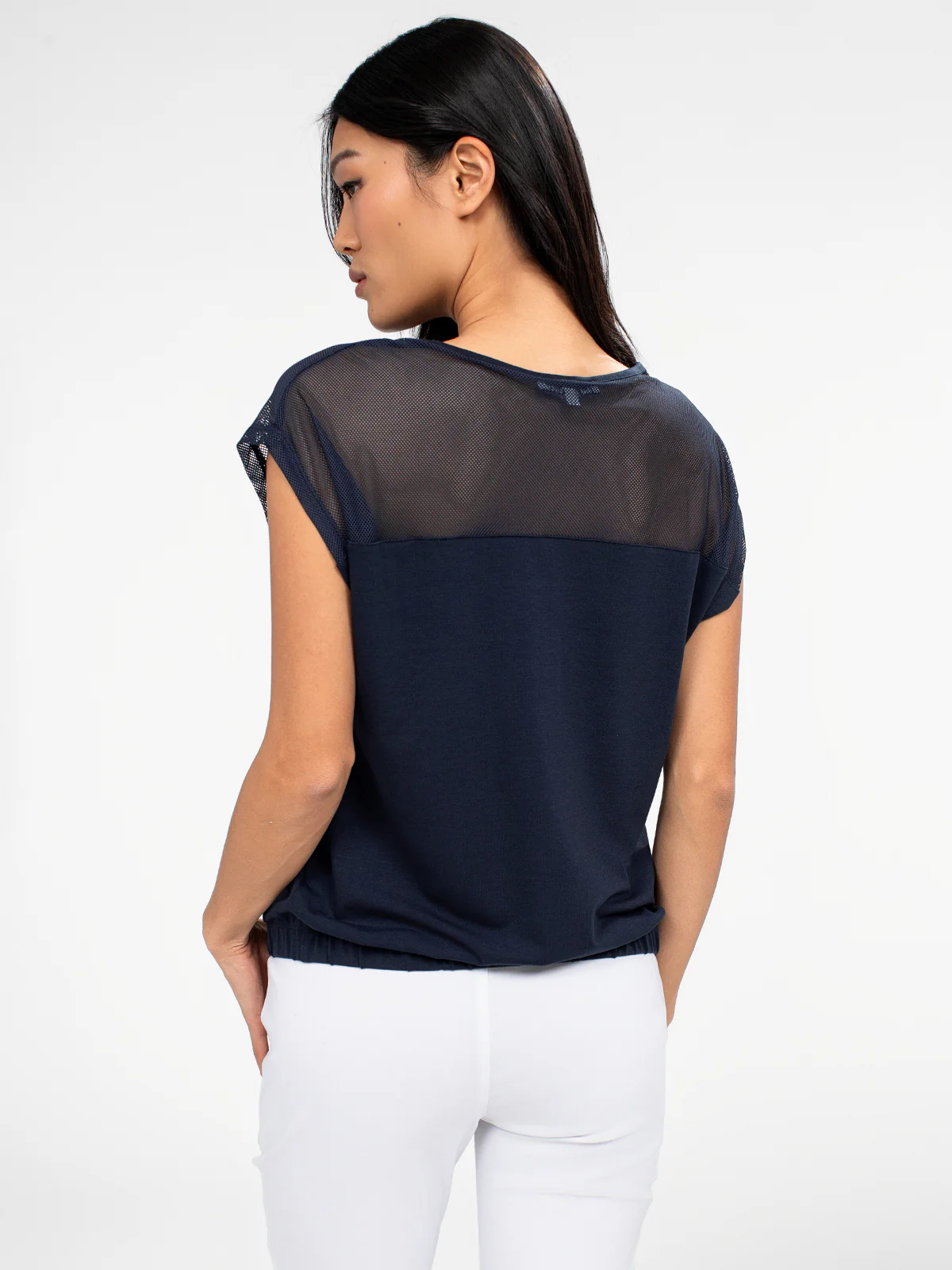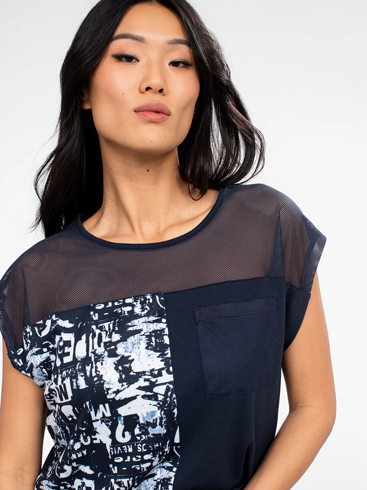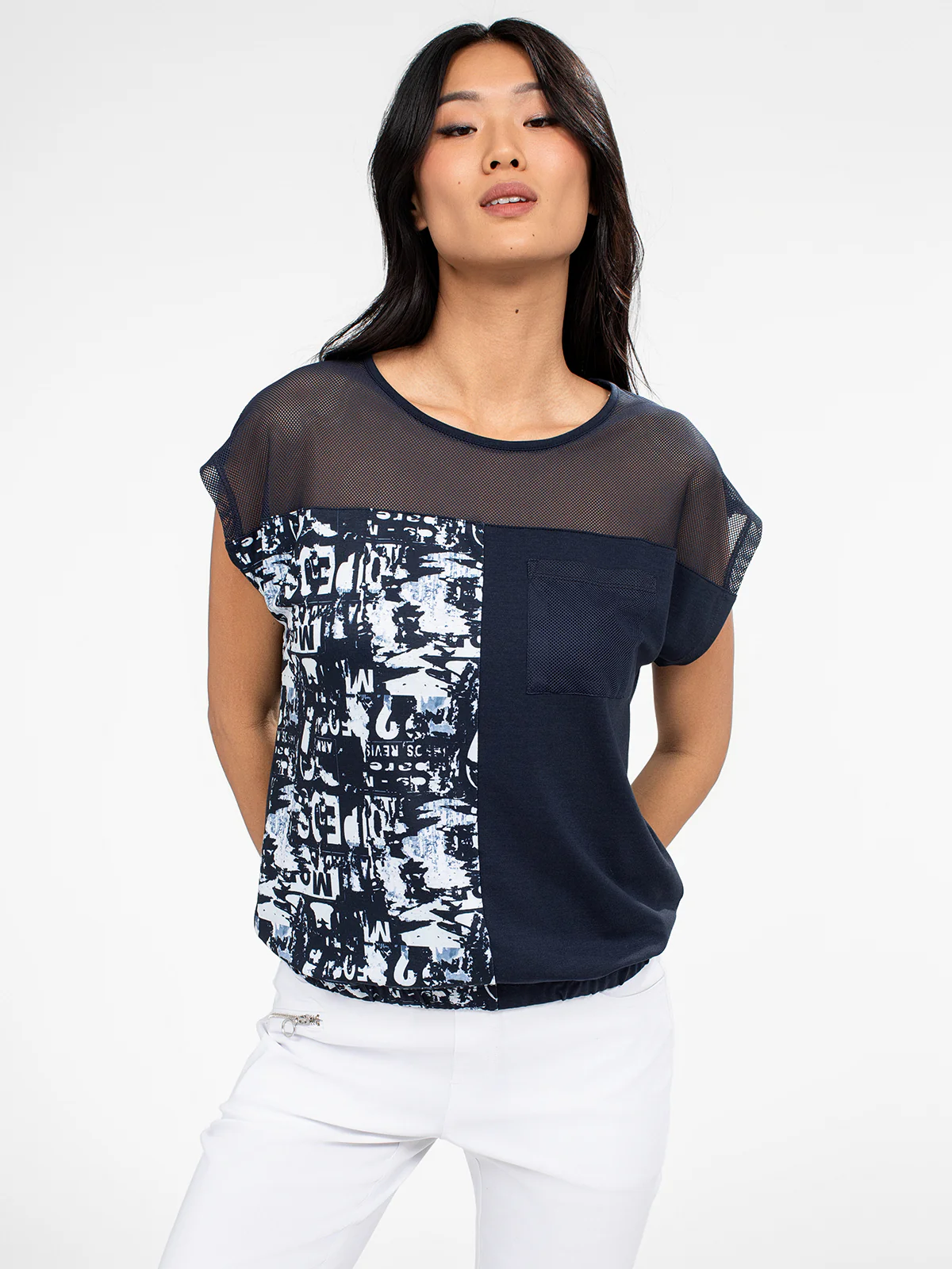 Avec sa coupe fluide et son empiècement en maille, ce t-shirt offre un équilibre parfait entre confort et originalité. Le motif graphique bicolore dynamise l’ensemble avec une touche artistique.