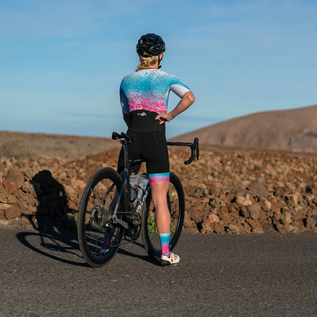 Conçu pour les triathlons longue distance, la tenue Hiranga LD Aéro femme a été étudiée pour vous apporter un maximum de confort et de performance durant votre course. Cette tenue de triathlon 100% féminine dispose de manches en tissu en maille alvéolée légère apportant un gain aérodynamique, et vous offre aussi une protection supplémentaire contre le soleil.