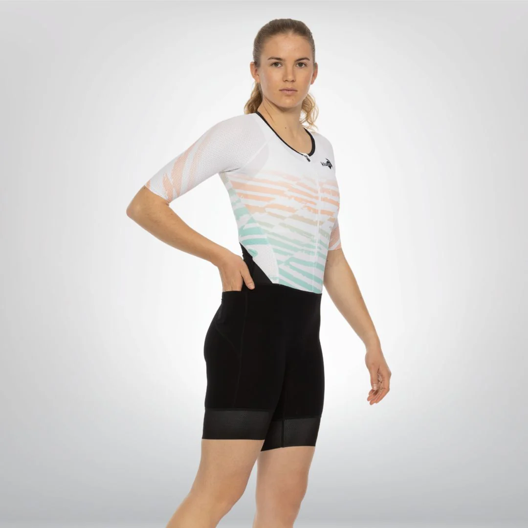 Conçu pour les triathlons longue distance, la tenue Hiranga LD Aéro femme a été étudiée pour vous apporter un maximum de confort et de performance durant votre course. Cette tenue de triathlon 100% féminine dispose de manches en tissu en maille alvéolée légère apportant un gain aérodynamique, et vous offre aussi une protection supplémentaire contre le soleil.
