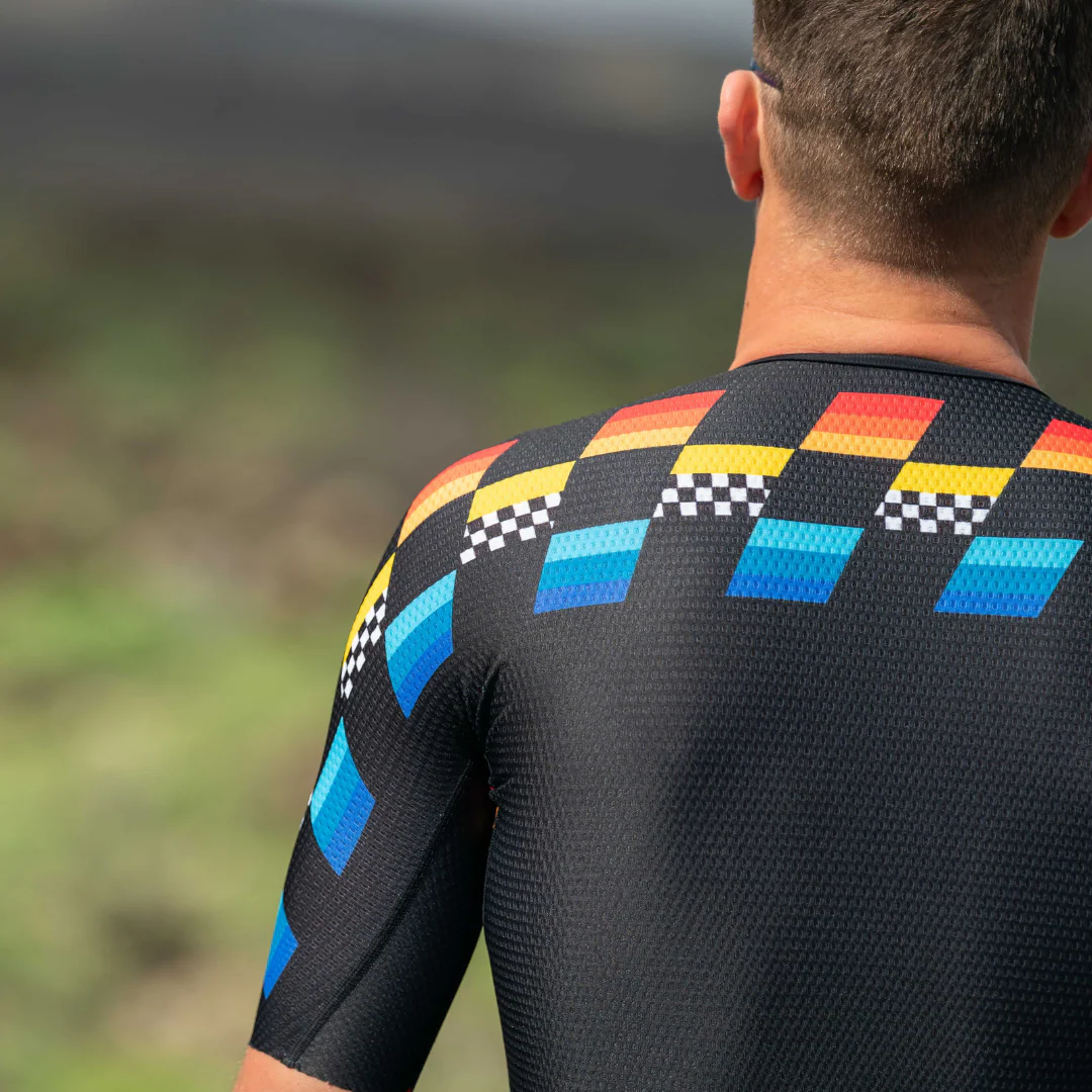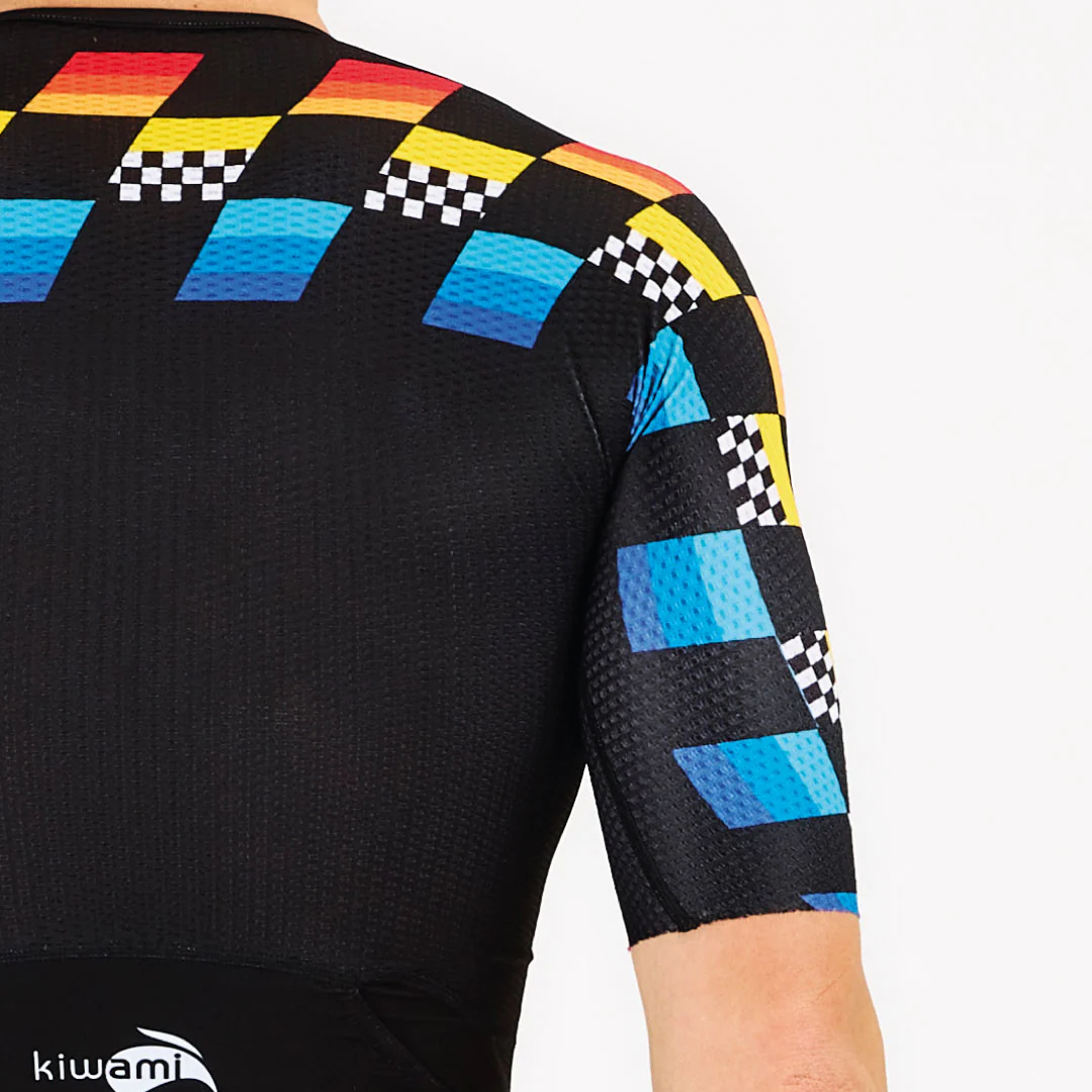 - Coupe aérodynamique grâce aux manches ajustées, se terminant au coude, couvrant les épaules et les biceps de l’air et du soleil;