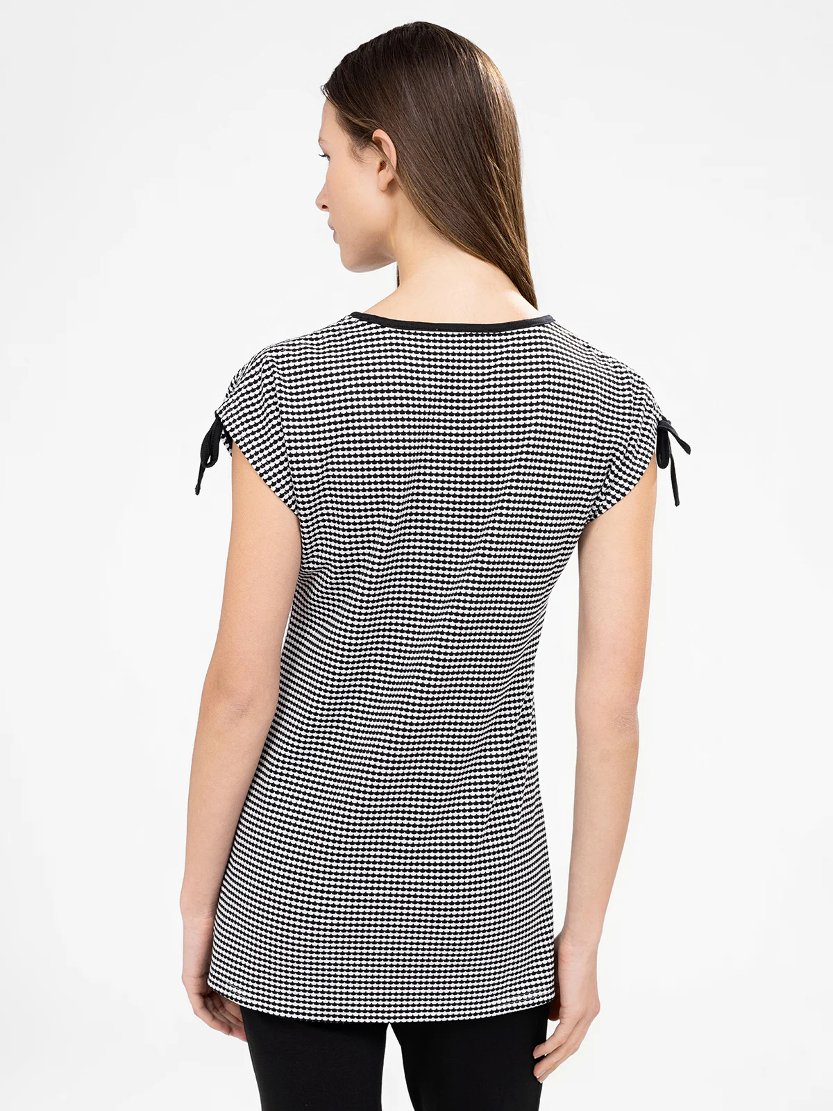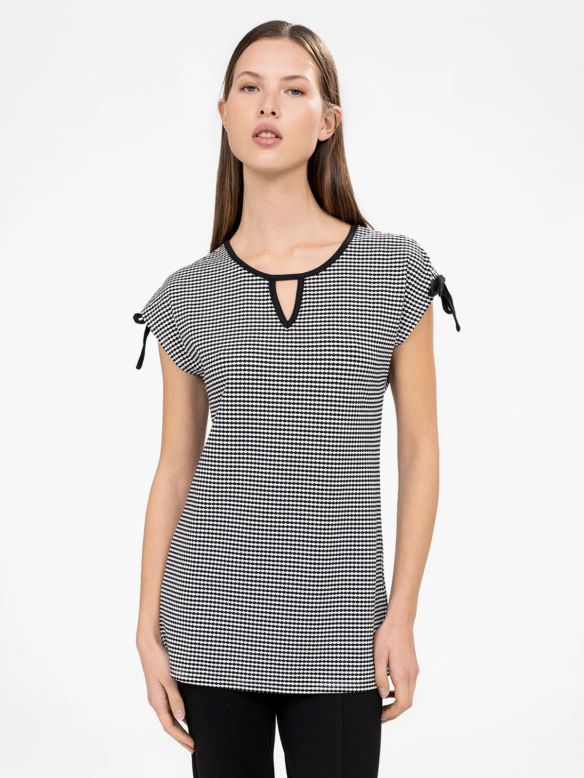Entre élégance structurée et détails féminins, ce haut mise sur une coupe fluide et des manches ornées de petits nœuds. Son imprimé intemporel s’adapte à toutes les occasions.