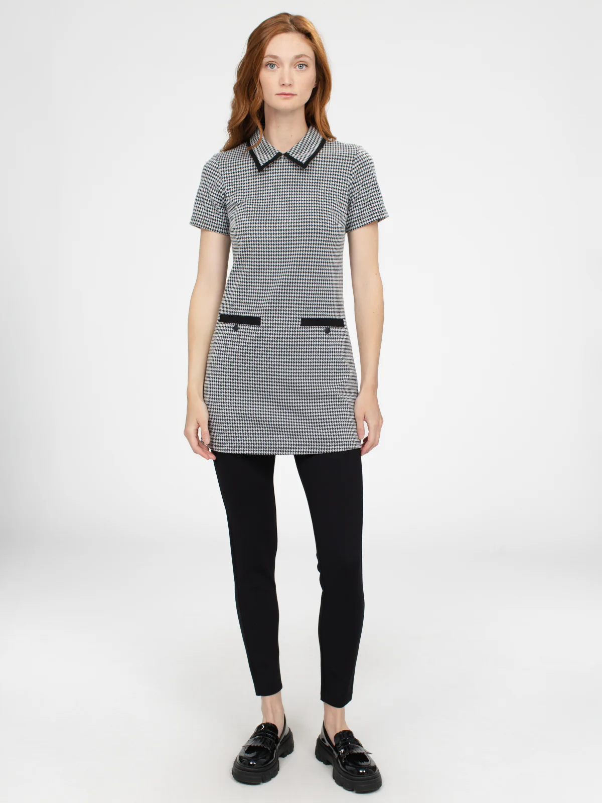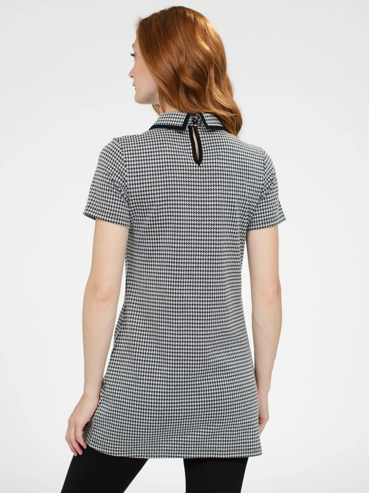 Modèle droit à longueur mi-cuisse, confectionné dans une maille texturée à motif pied-de-poule. Fermeture goutte boutonnée au dos du col.