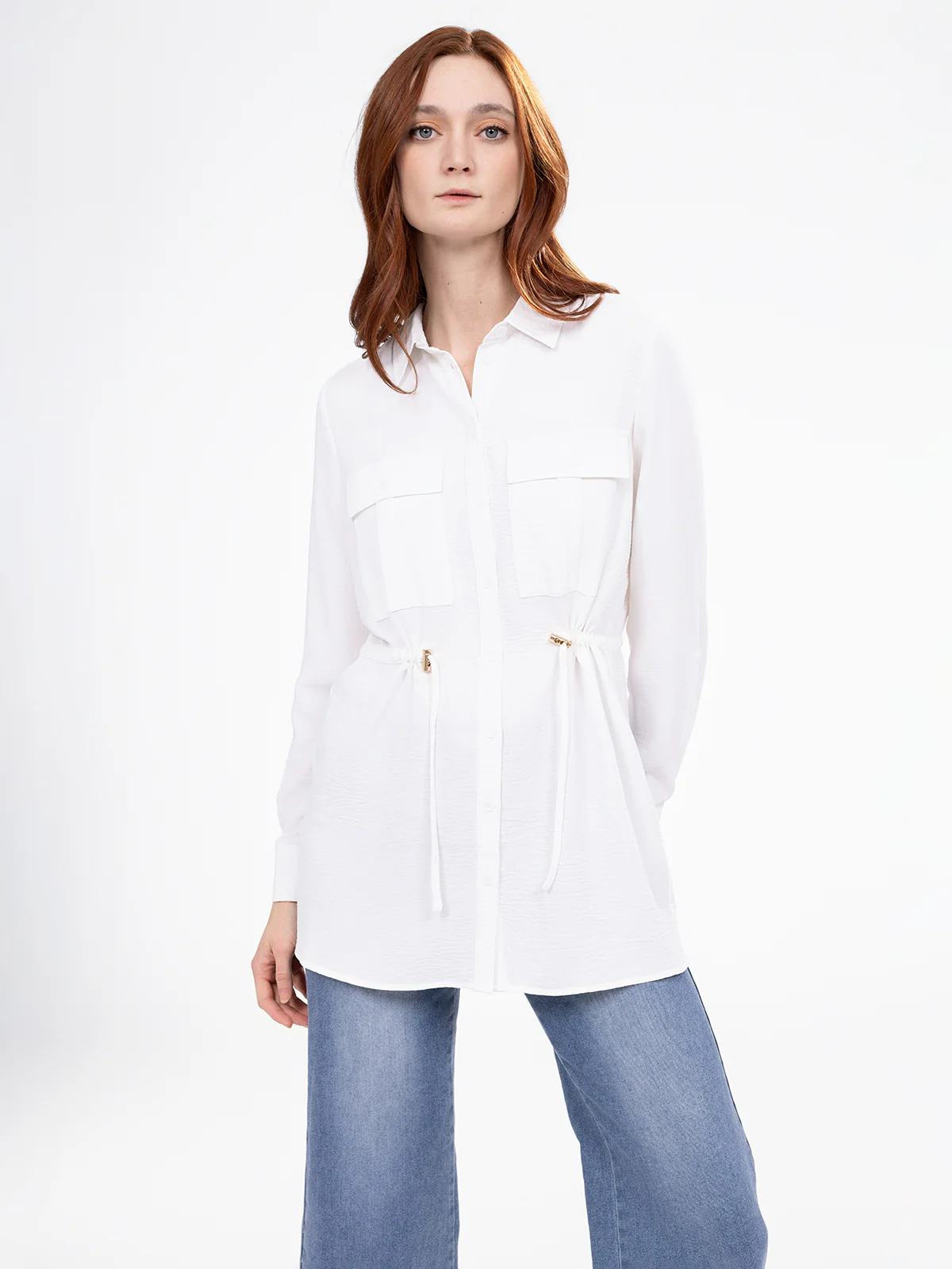 Une coupe longue et fluide pour une tunique qui joue sur les détails : boutons discrets, poignets boutonnés et taille cintrée pour une allure soignée.
