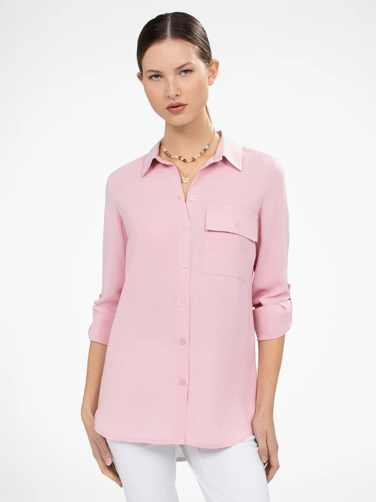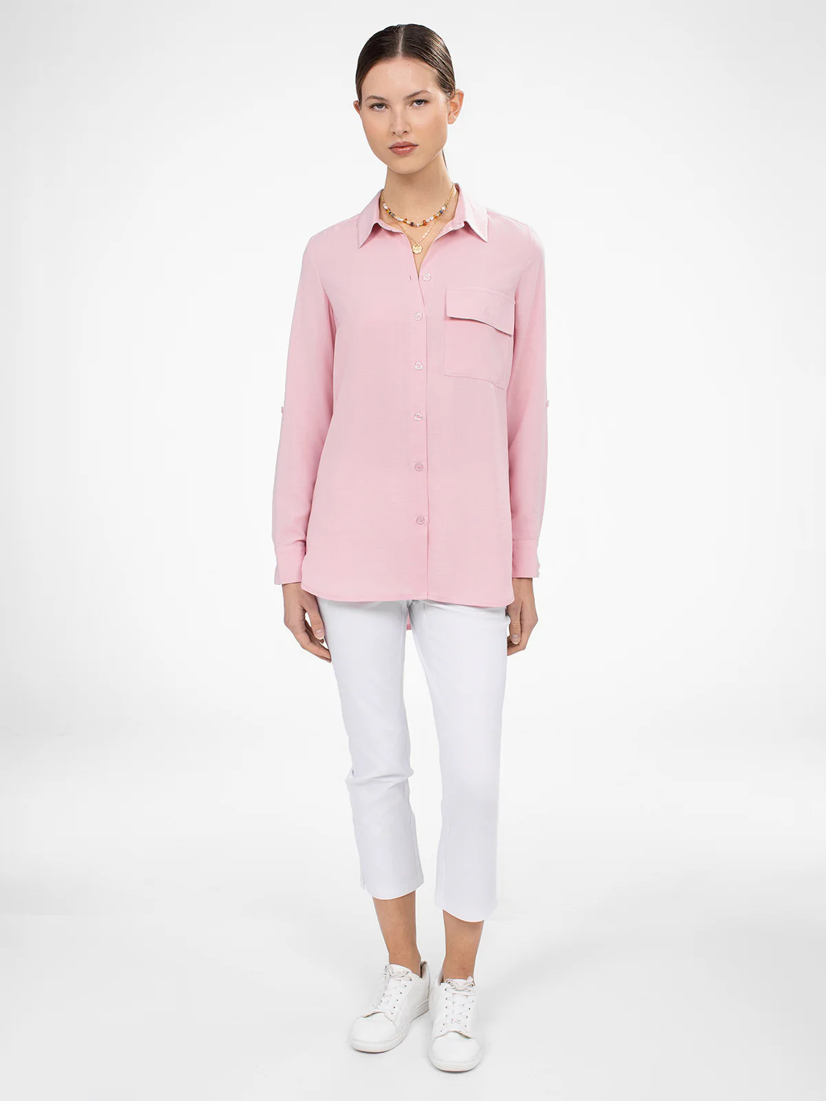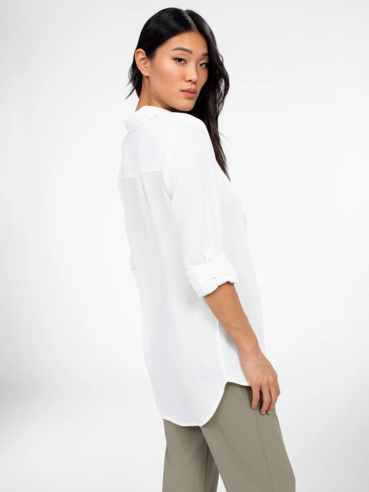 Cette chemise au tissu léger et fluide se distingue par sa coupe longue et ses manches retroussables. La poche plaquée et la boutonnière discrète apportent une touche d’élégance simple.