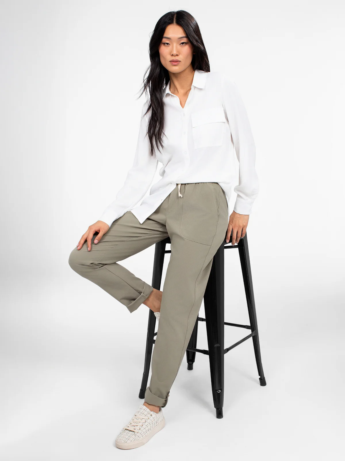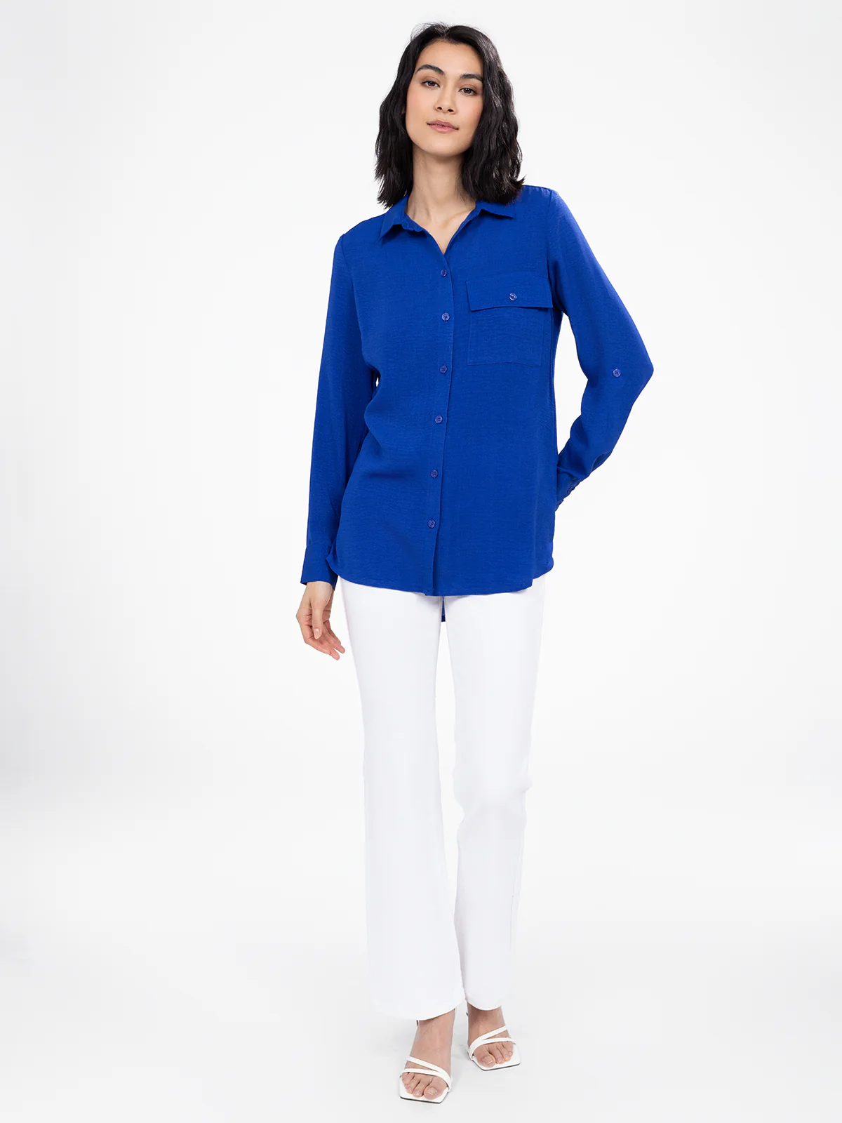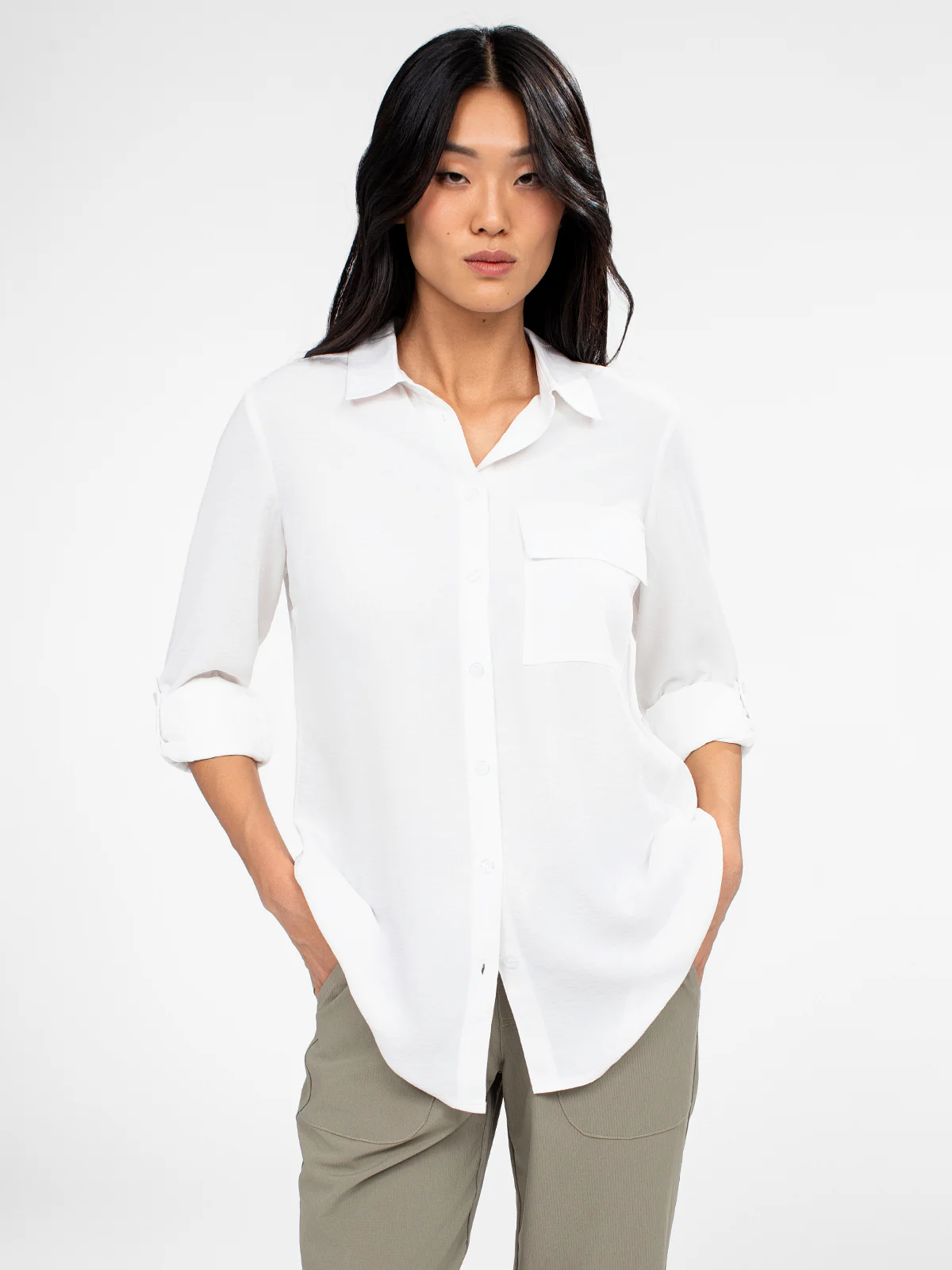 Cette chemise au tissu léger et fluide se distingue par sa coupe longue et ses manches retroussables. La poche plaquée et la boutonnière discrète apportent une touche d’élégance simple.