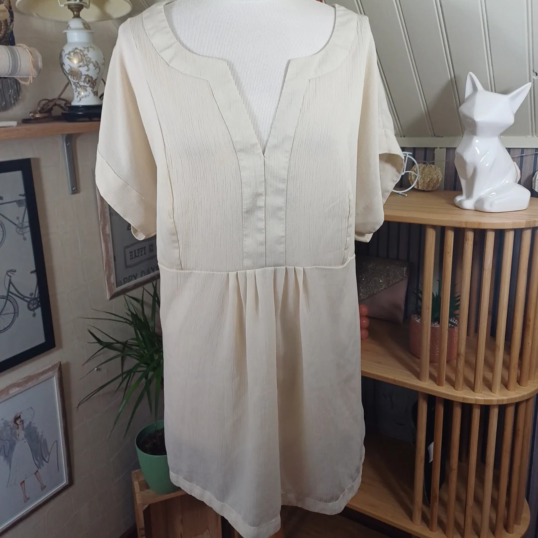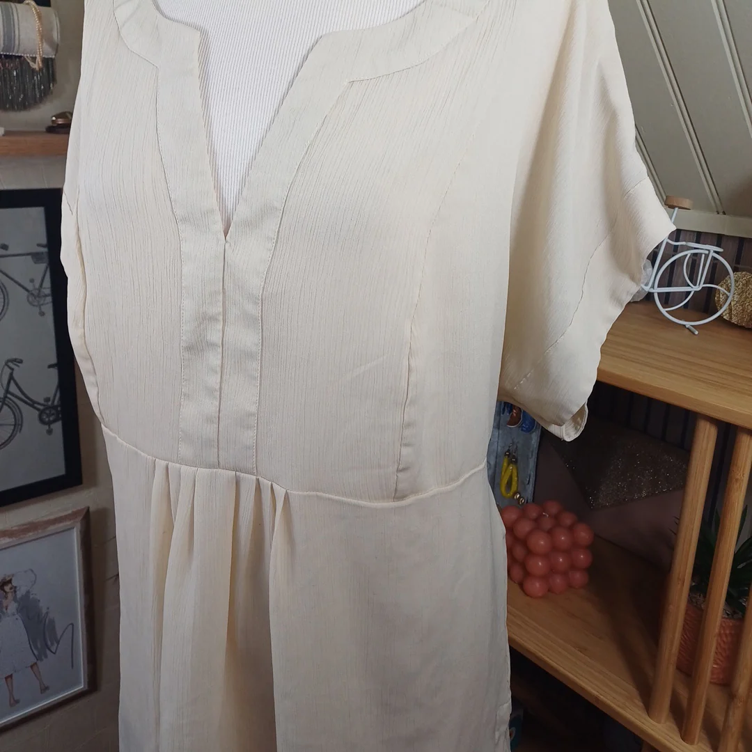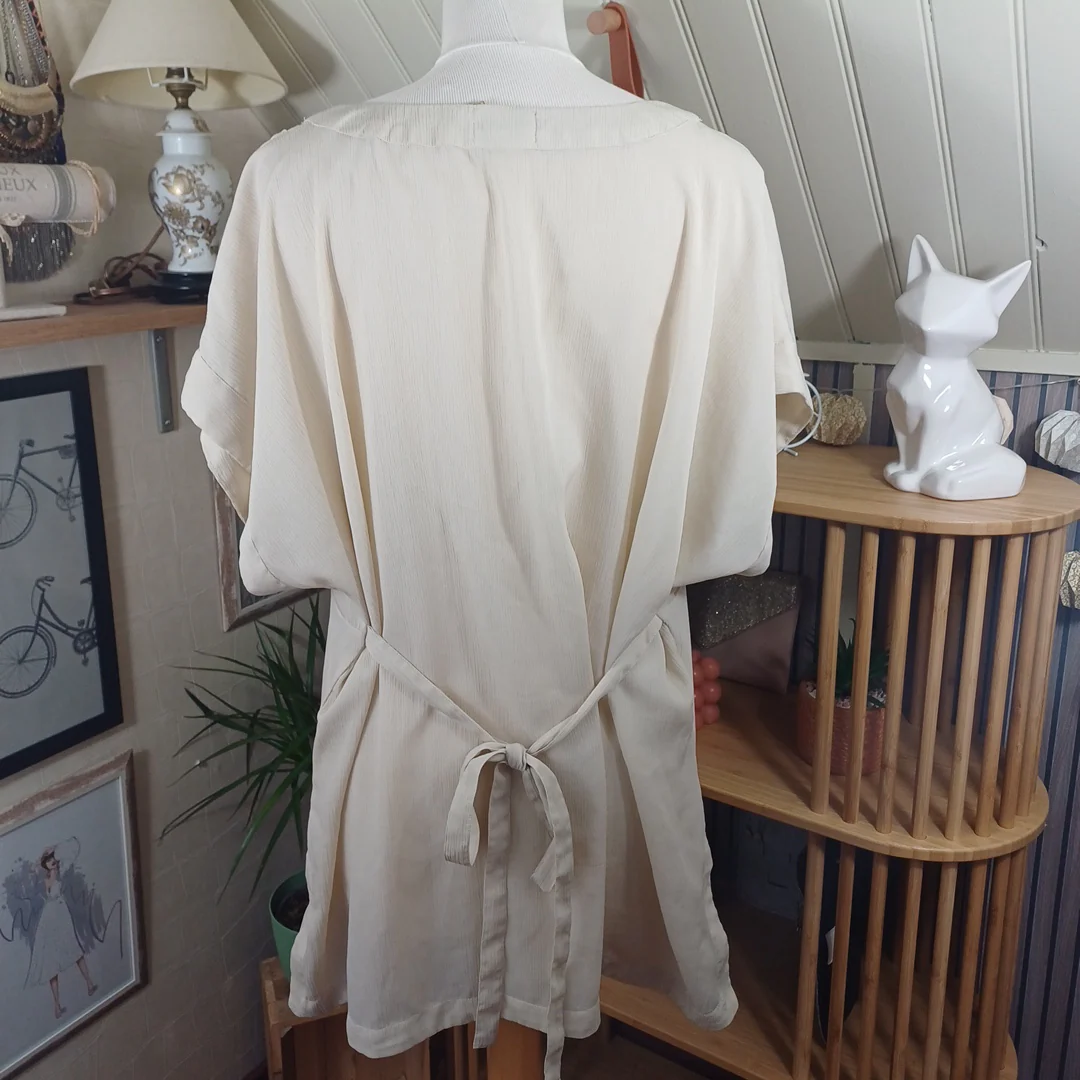 Tunique beige à nouer dans le dos, Bonprix, taille indiquée 56. Légèrement transparente. Mesures: Tour de poitrine 134 cm Longueur 72 cm