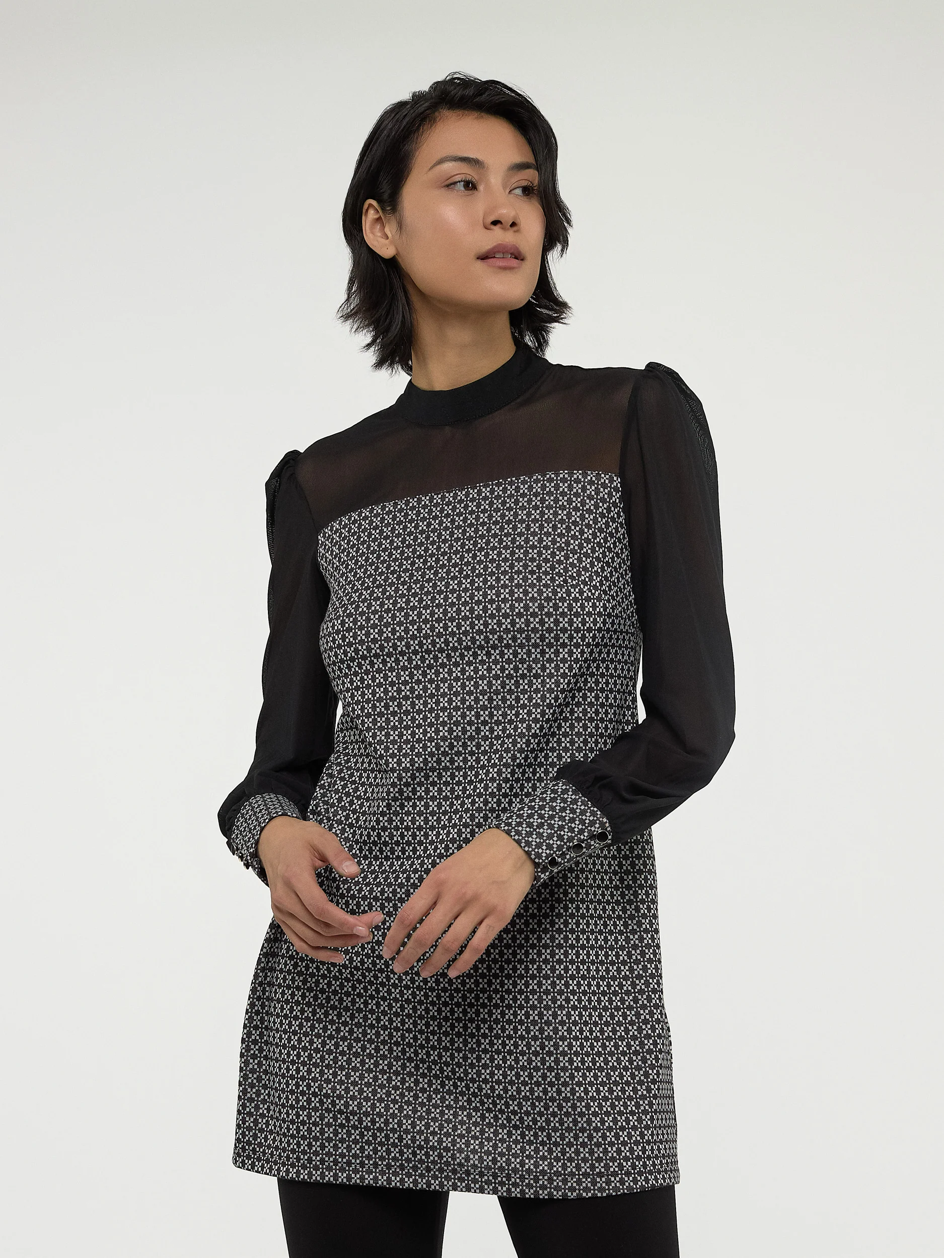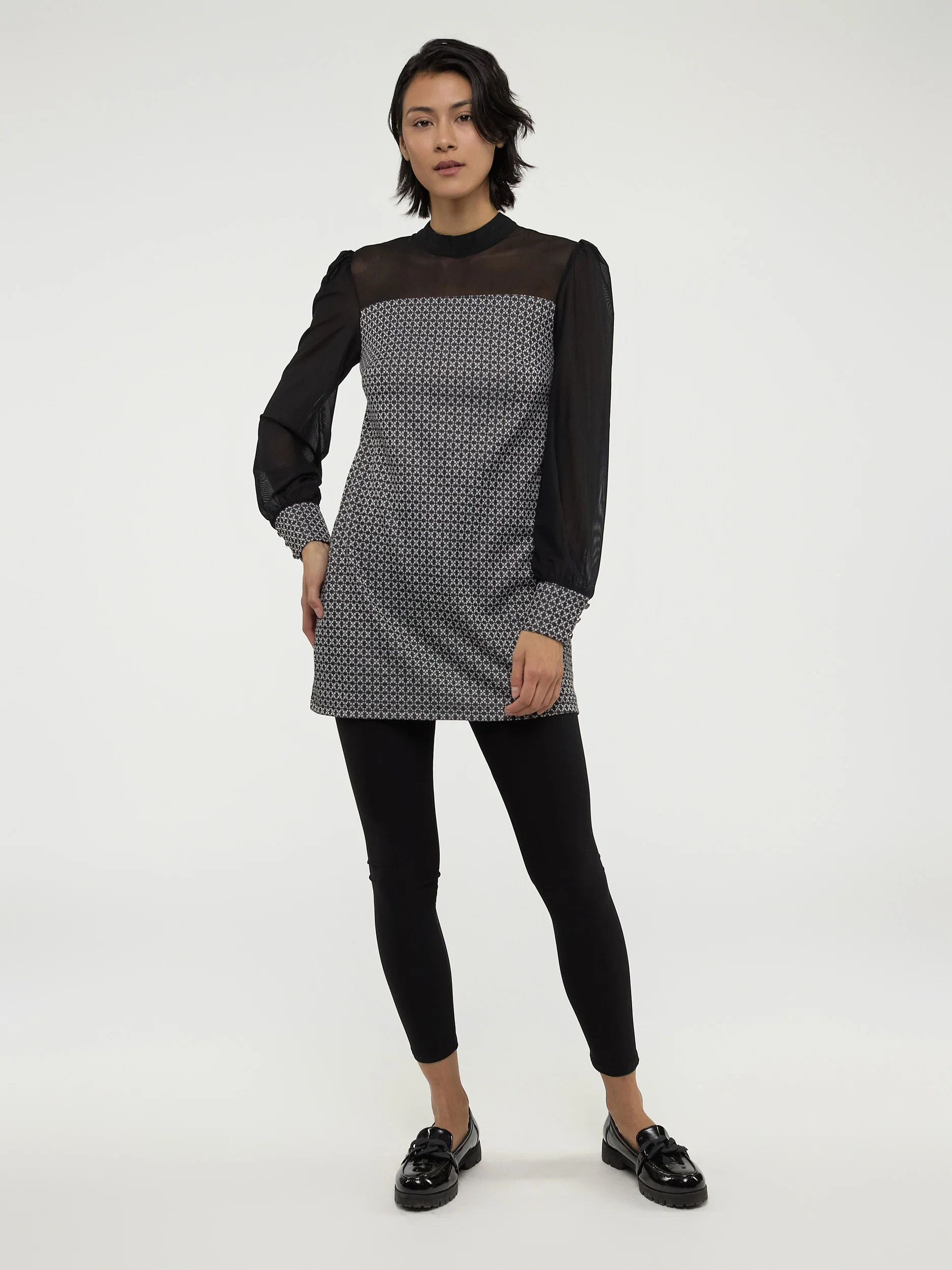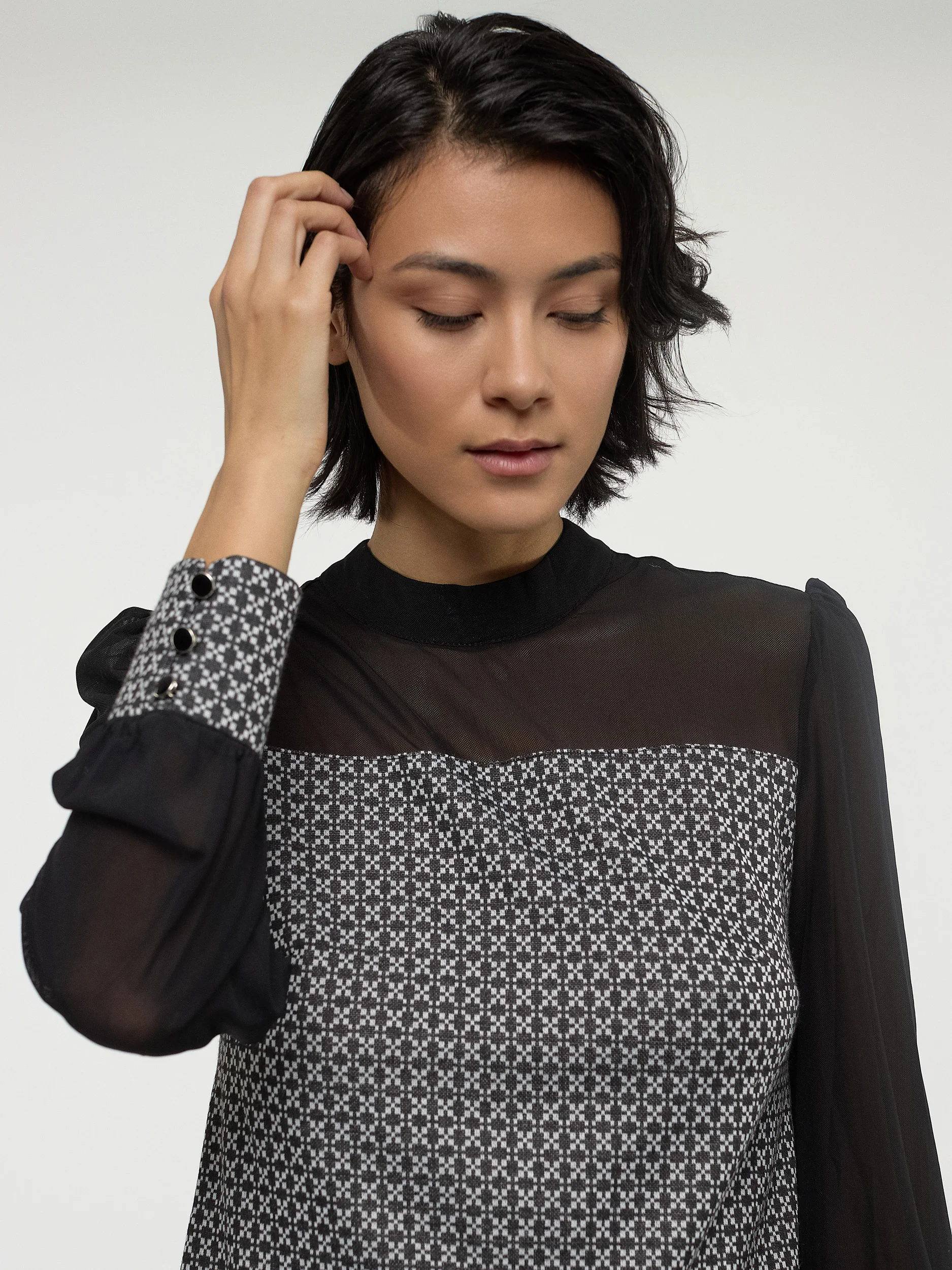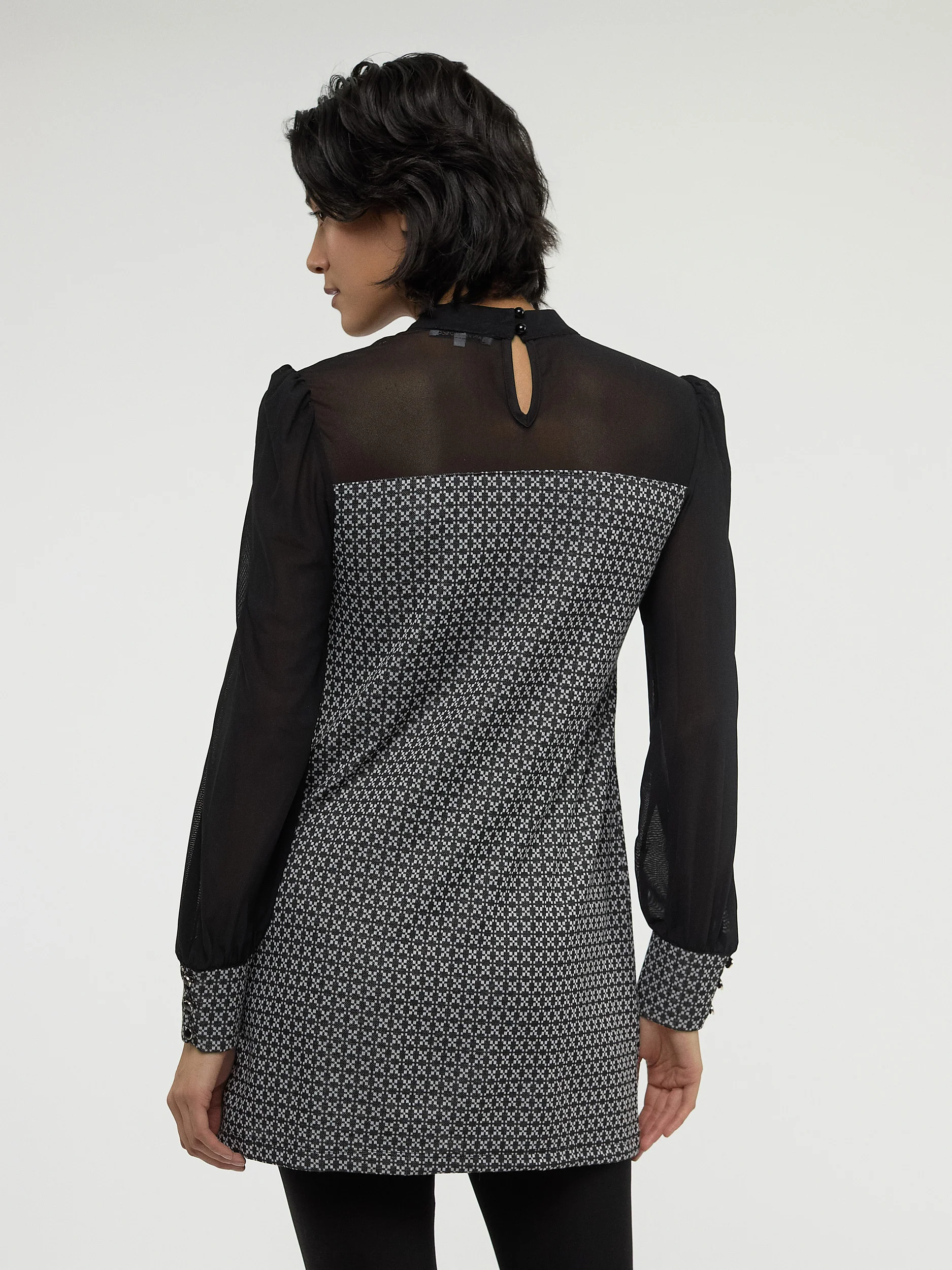 Élégante pour toutes les occasions, cette tunique au motif moderne et aux manches en tulle crée un look sophistiqué et intemporel.