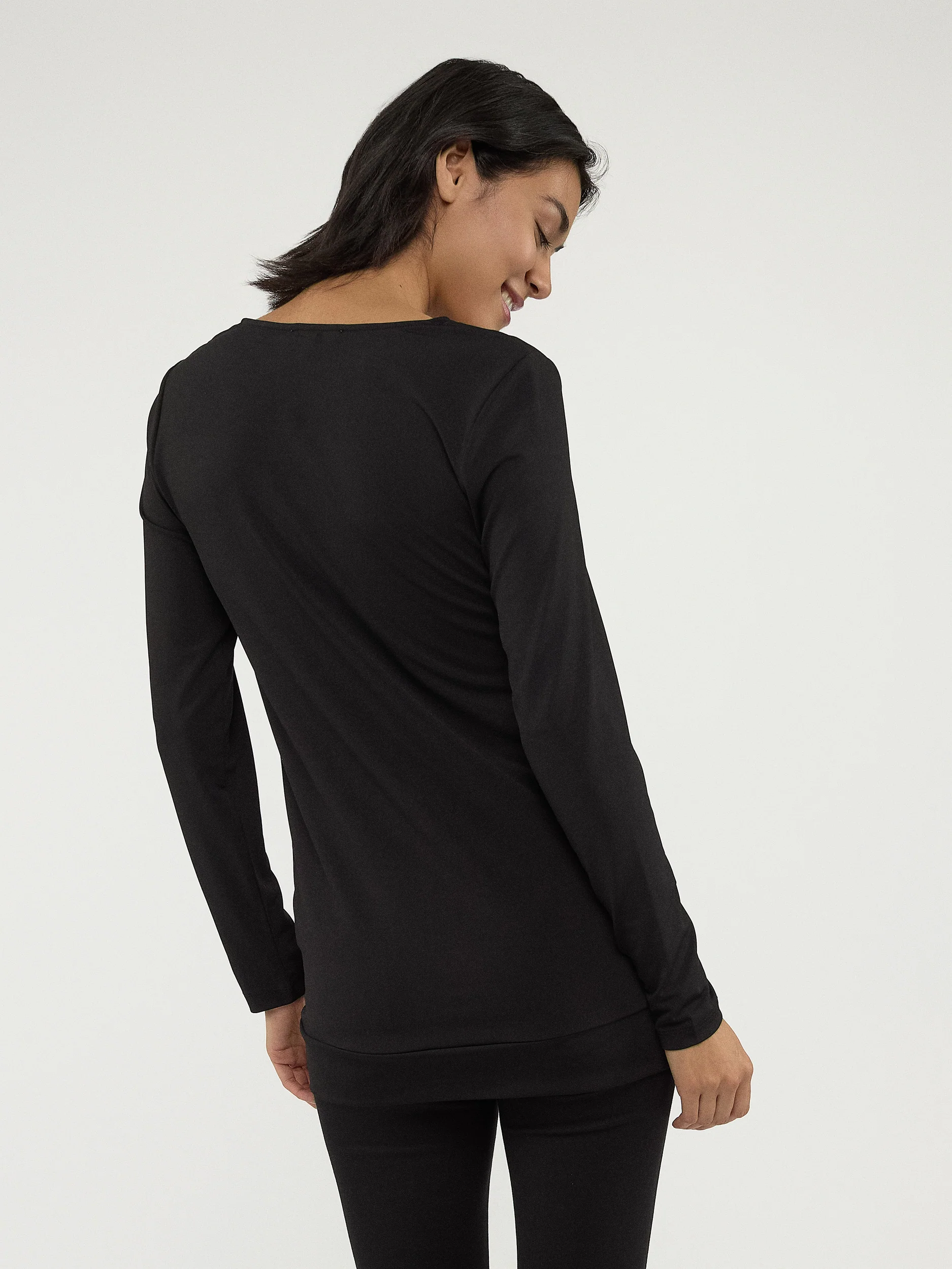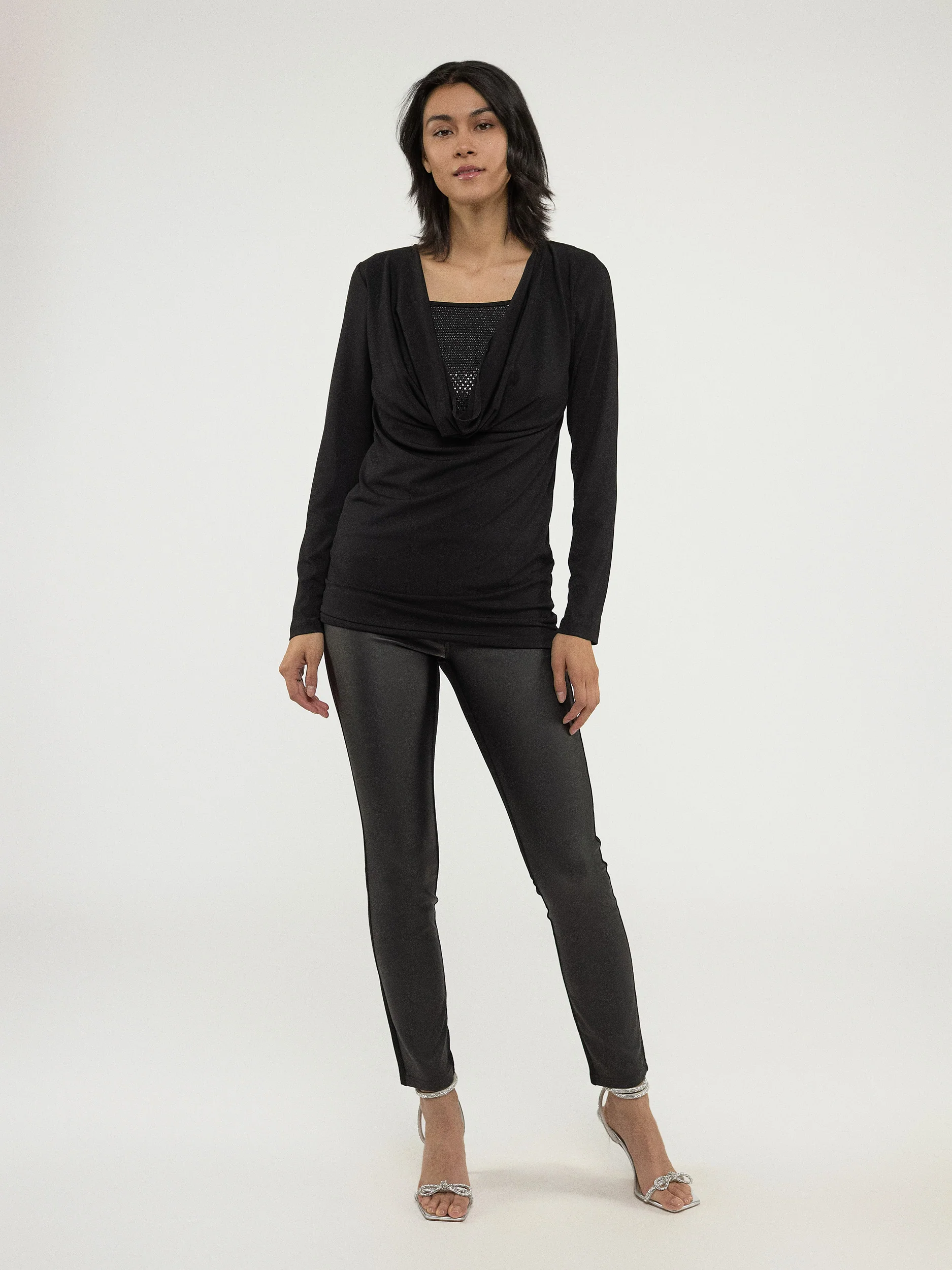 Ce haut à col bénitier drapé offre une allure à la fois subtile et sophistiquée. Le tissu fluide tombe avec légèreté, tandis que l’empiècement ajoute un détail texturé discret. Sa coupe longue affine la silhouette et s’adapte à toutes vos envies de style.