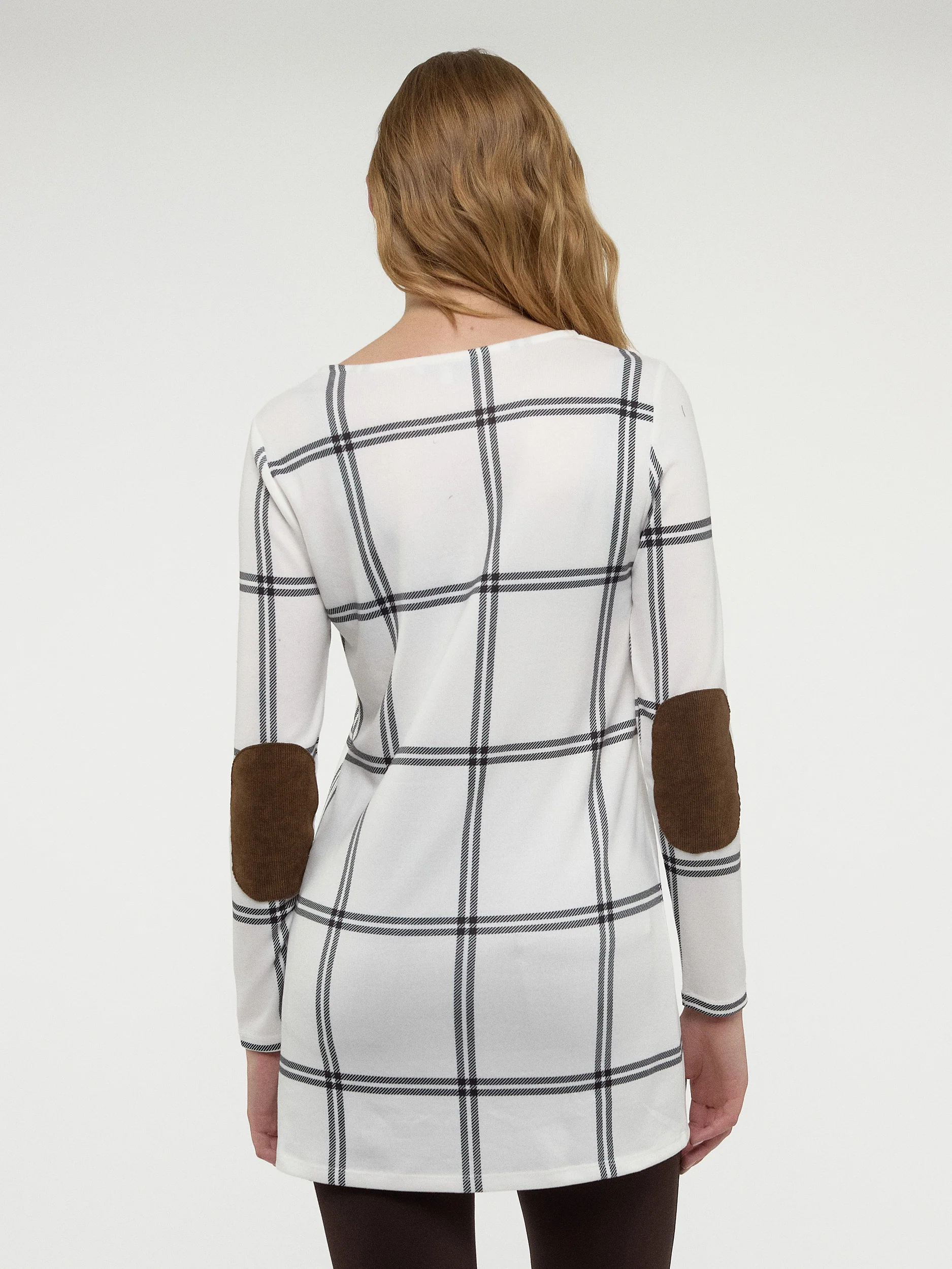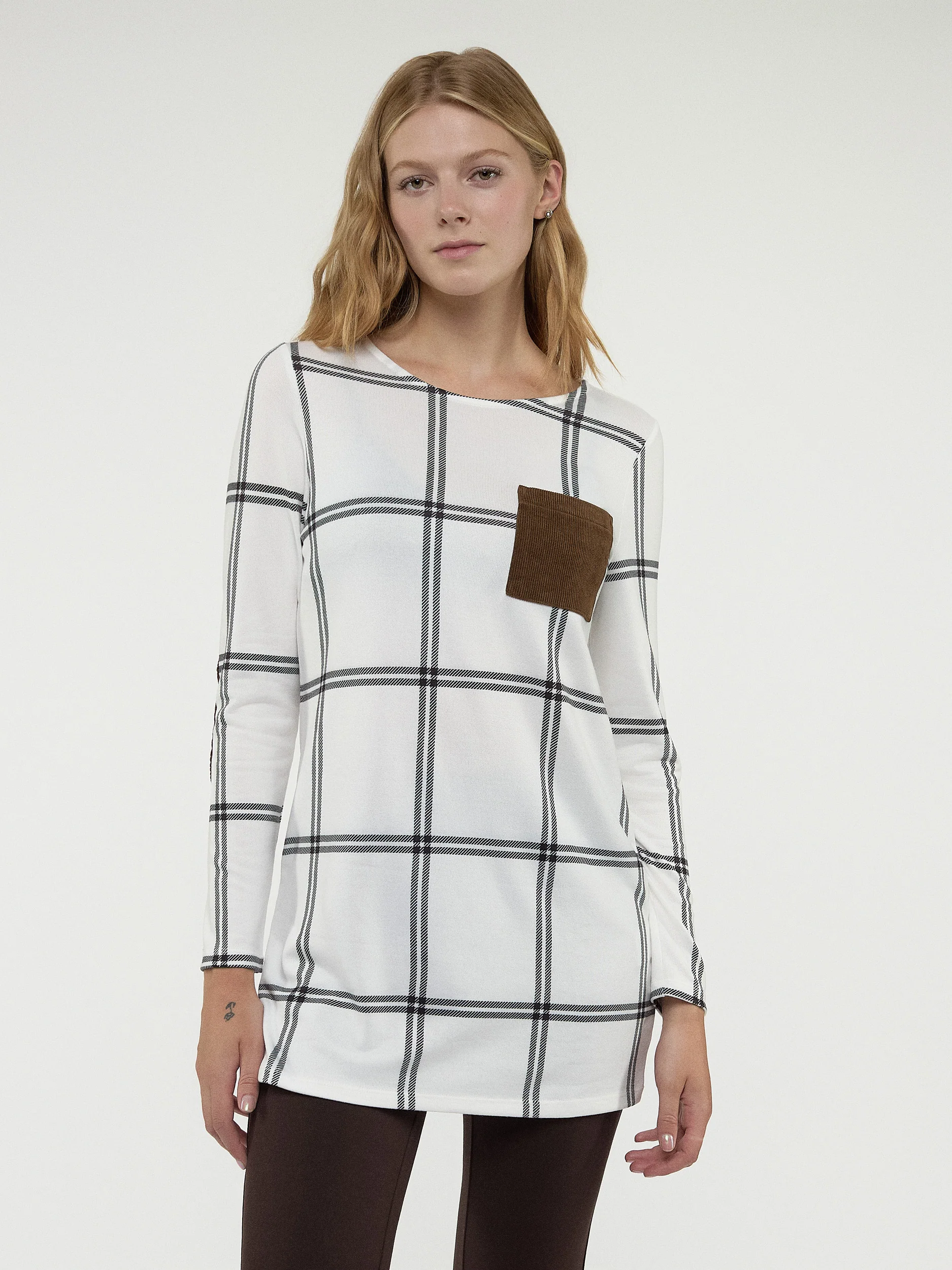 Vous souhaitez ajouter une couche décontractée tout en restant confortable ? Cette tunique en tricot à manches longues a une coupe décontractée et un motif à carreaux facile à porter, parfait pour le travail ou le week-end. Associez-la à des leggings ou à votre jean préféré.
