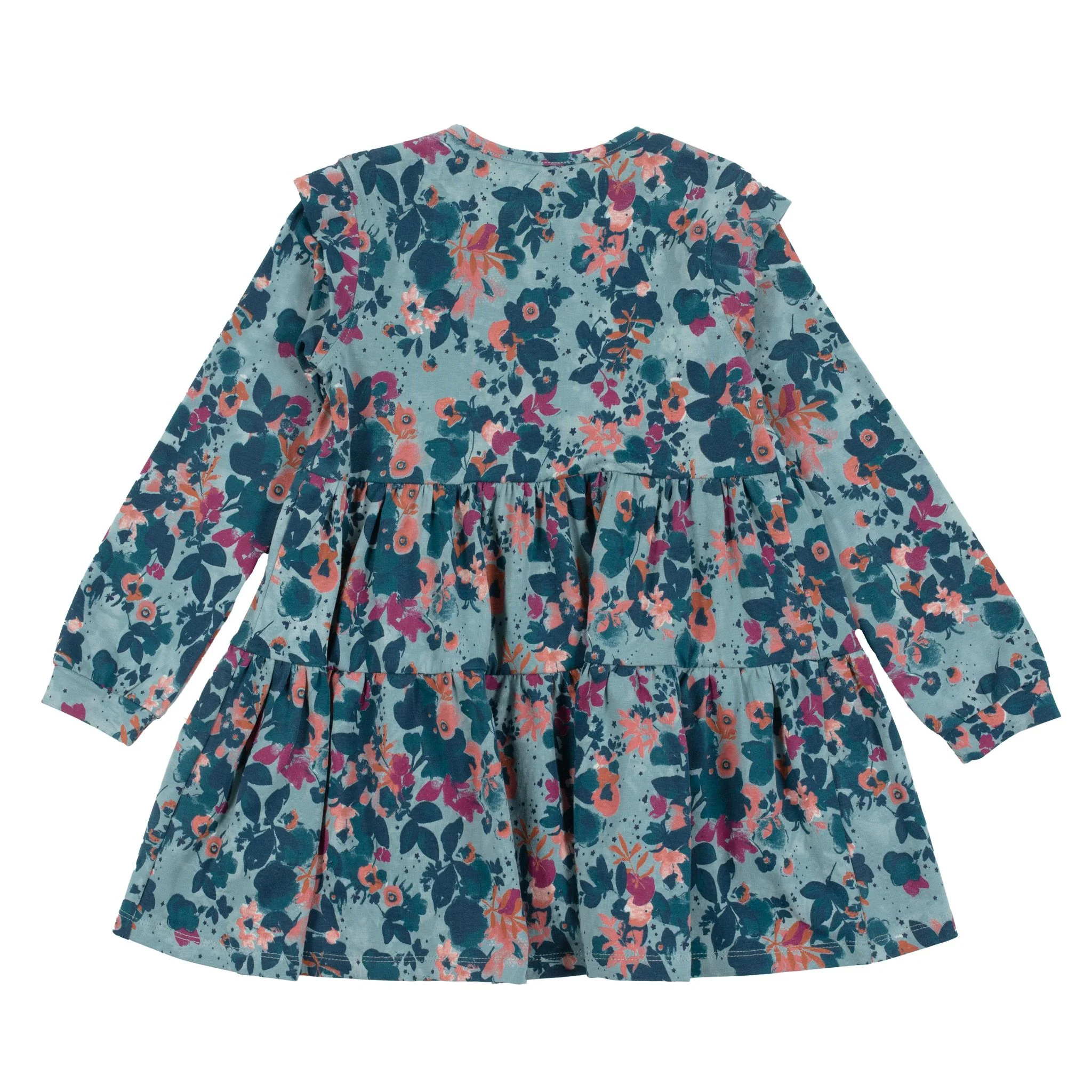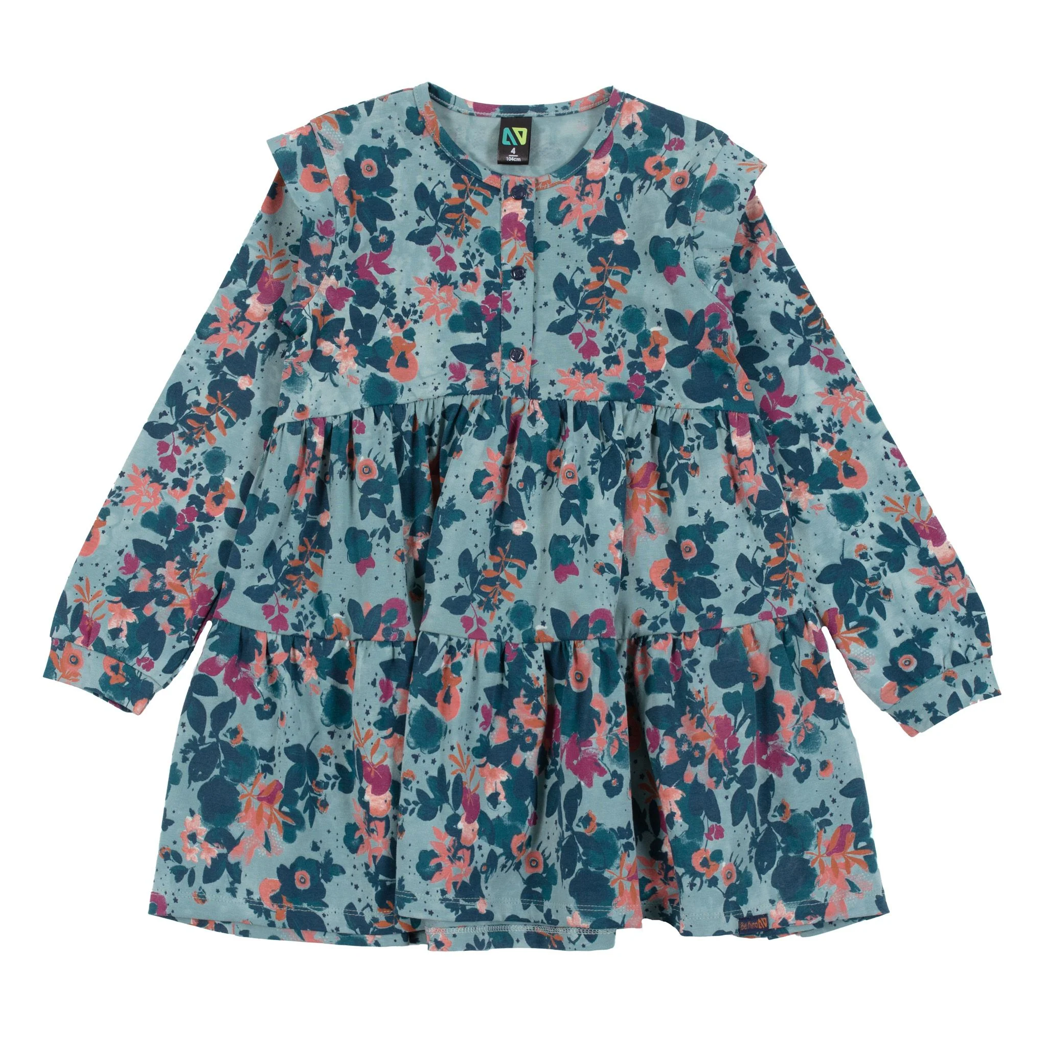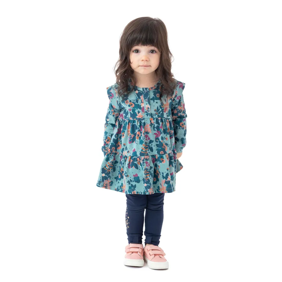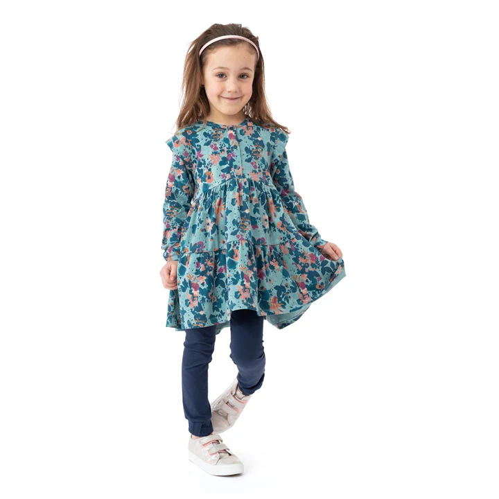 Tunique en jersey à motif fleuri. Manches longues. Ouverture à bouton à l’avant Jupe étagée. Couleur turquoise S’agence bien avec le legging marine