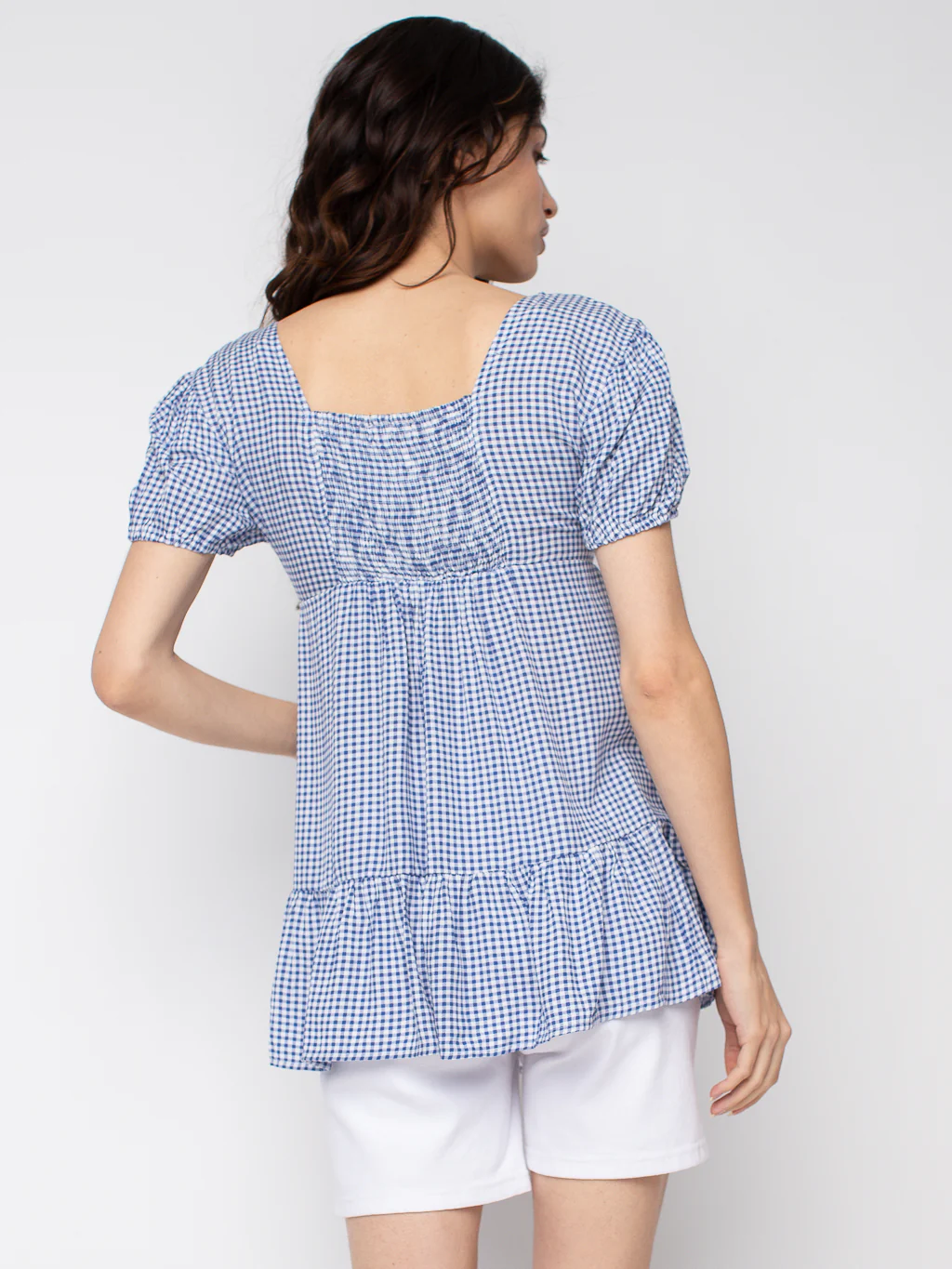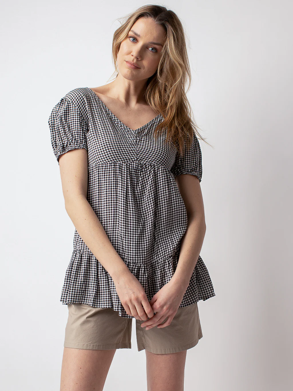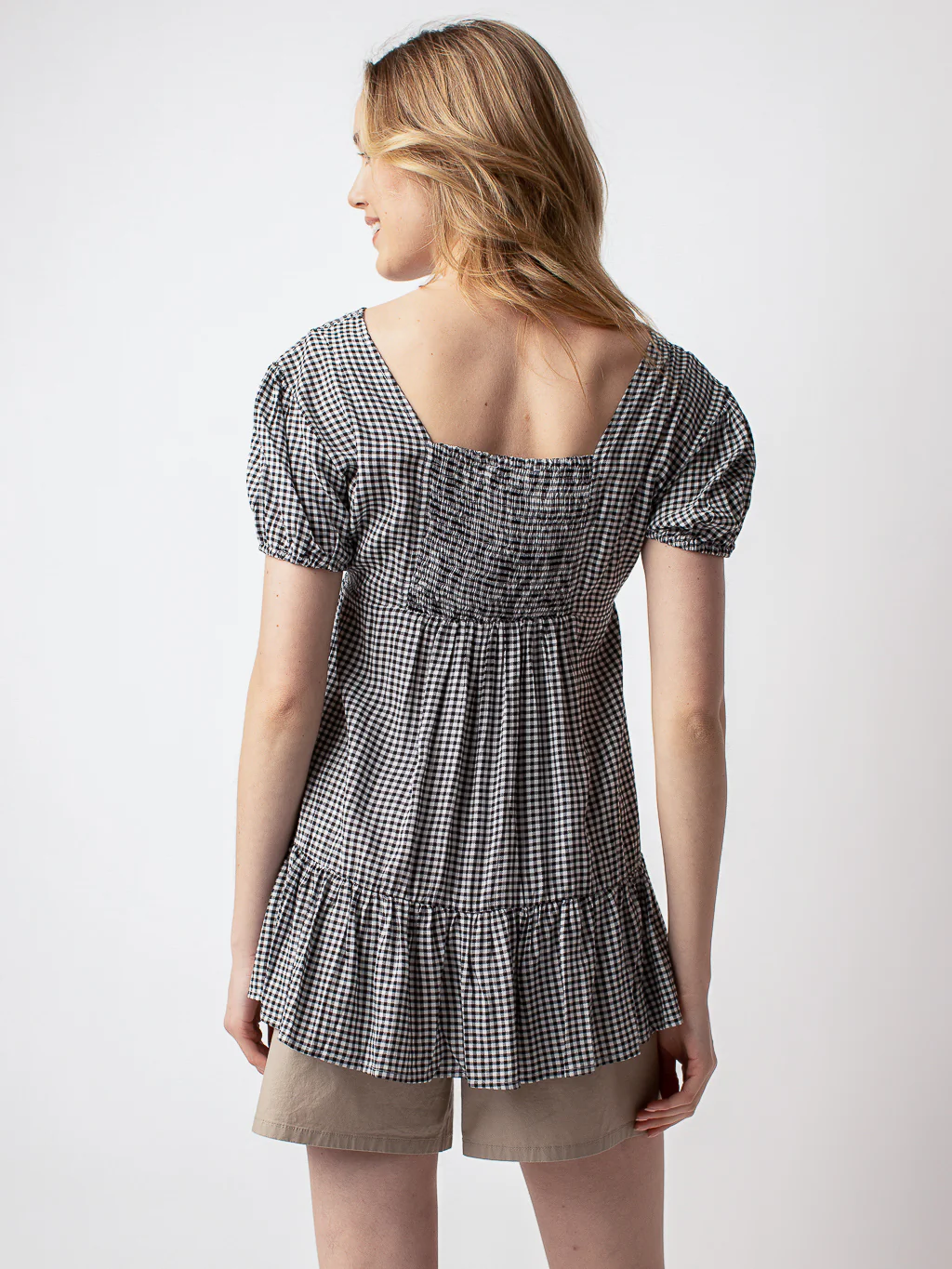 Ajoutez un charme vintage à votre garde-robe avec cette tunique à manches courtes. Le volant à l’ourlet, le dos smocké et la silhouette évasée sont flatteurs et féminins.
