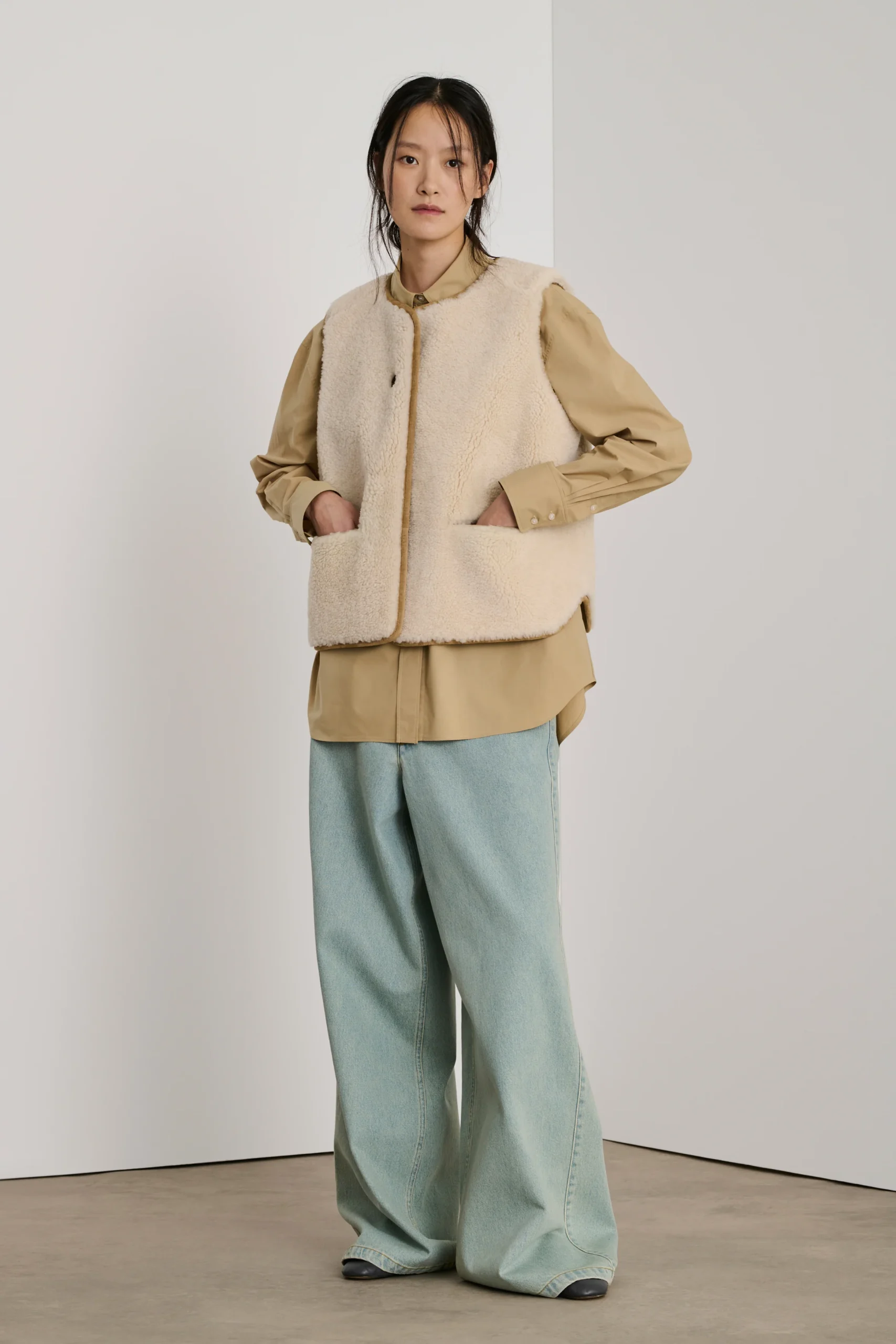 BOULOGNE est un blouson sans manches en cuir d’agneau, à la coupe droite élégante. Ce blouson au design sophistiqué est réversible, permettant deux looks différents. Il est pensé comme un gilet à styliser à l’infini. À glisser sous un manteau sans contraindre le mouvement, ou à superposer à un simple pull en maille.