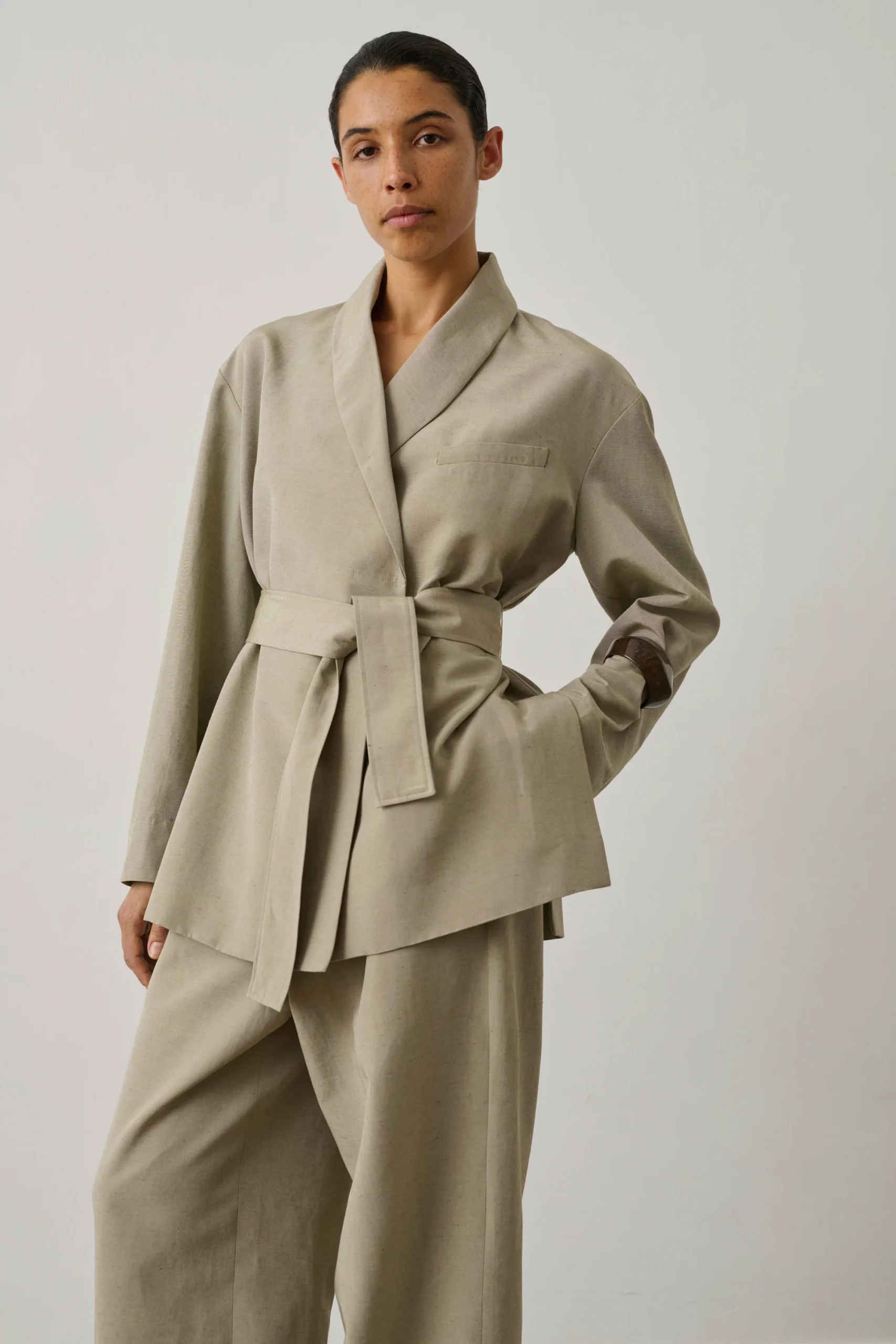 – Coupe type « peignoir » ceinturée – Fermeture avec ceinture amovible – Fentes côtés – Toile de lin et viscose